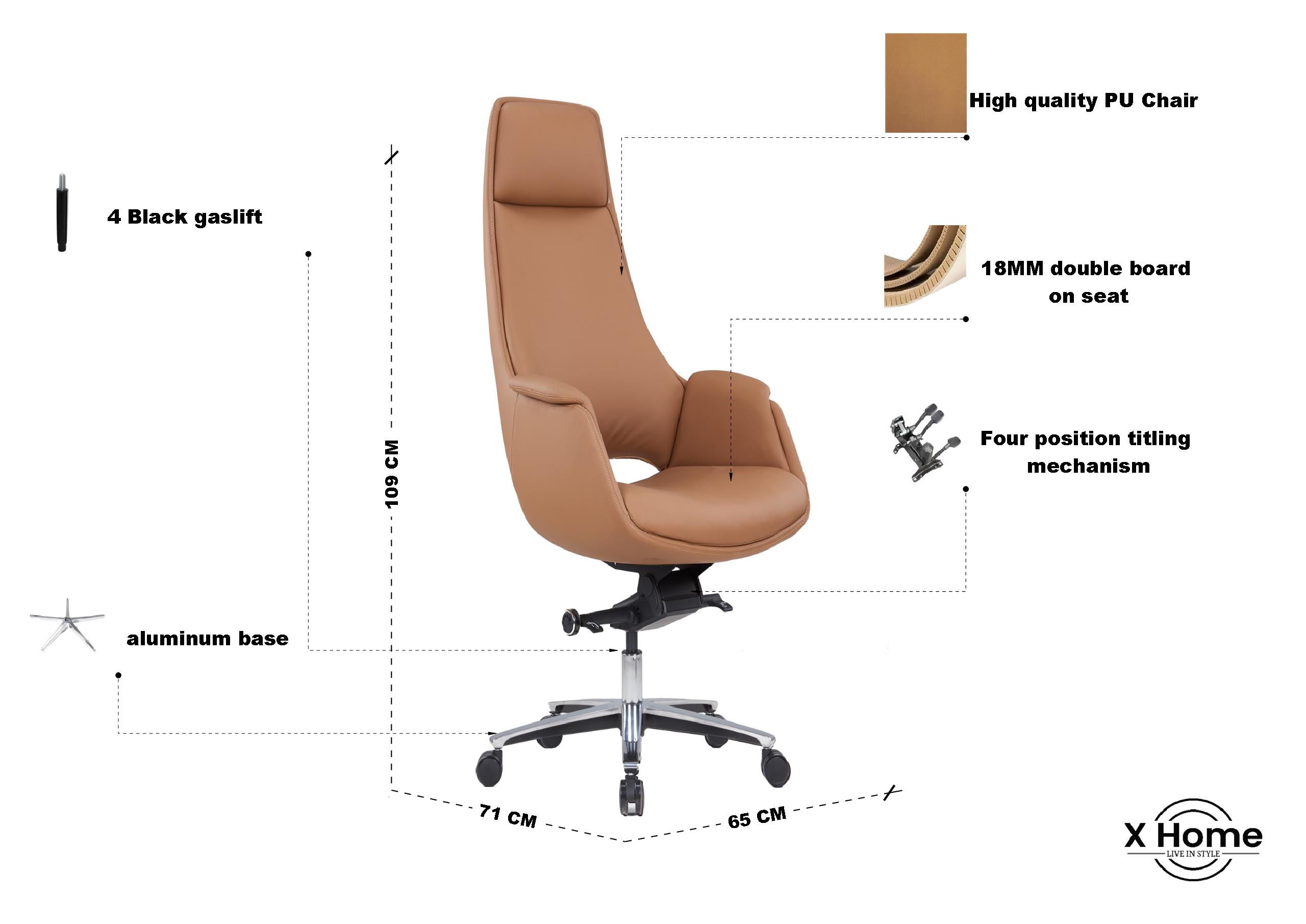 The Aligno Chair features a refined high-back design with premium PU upholstery and veneered accents for a sophisticated aesthetic. Its three-position lock mechanism and class-3 gas lift provide customizable comfort for long work sessions. Supported by a durable aluminum base, it delivers reliability, style, and all-day support.
