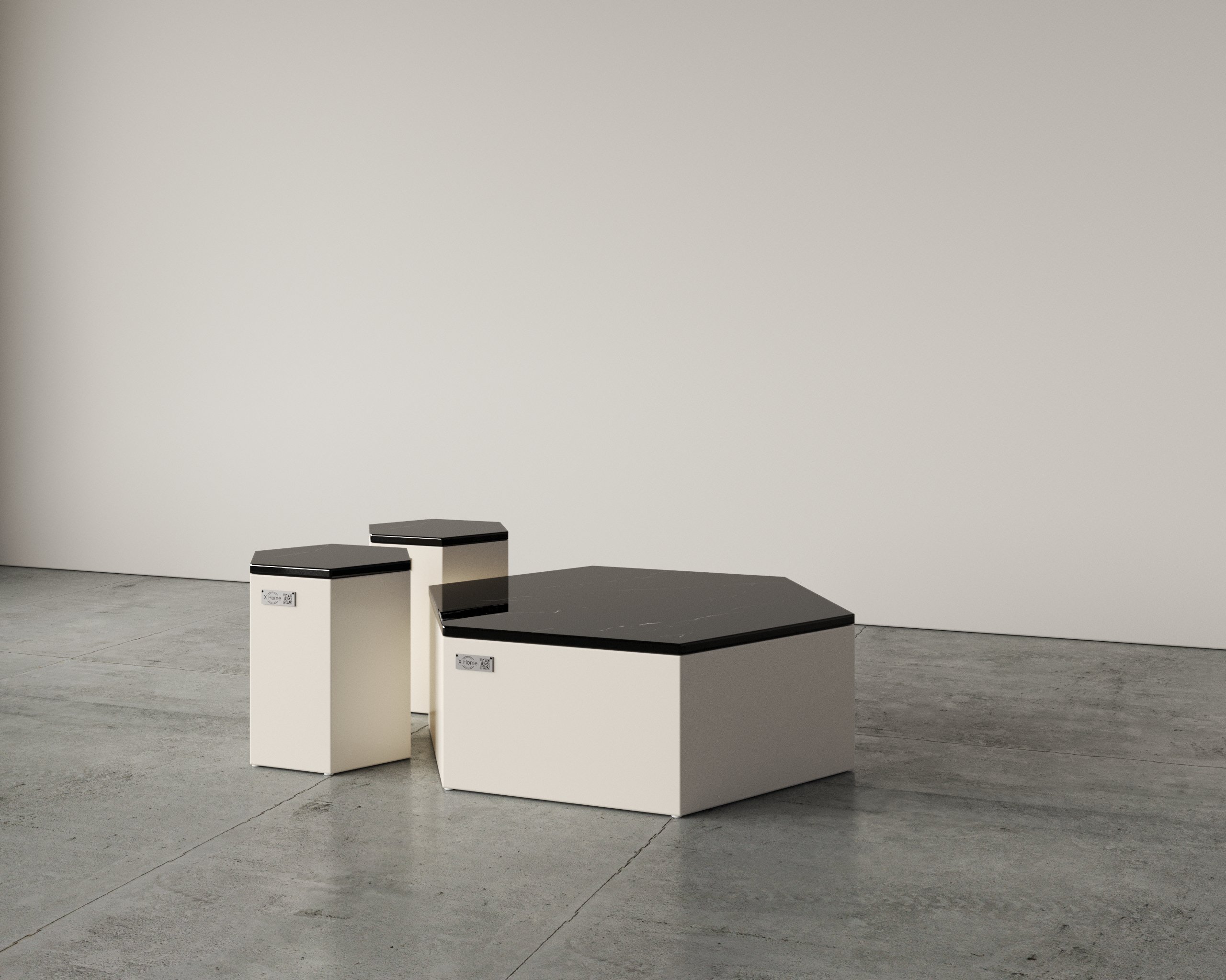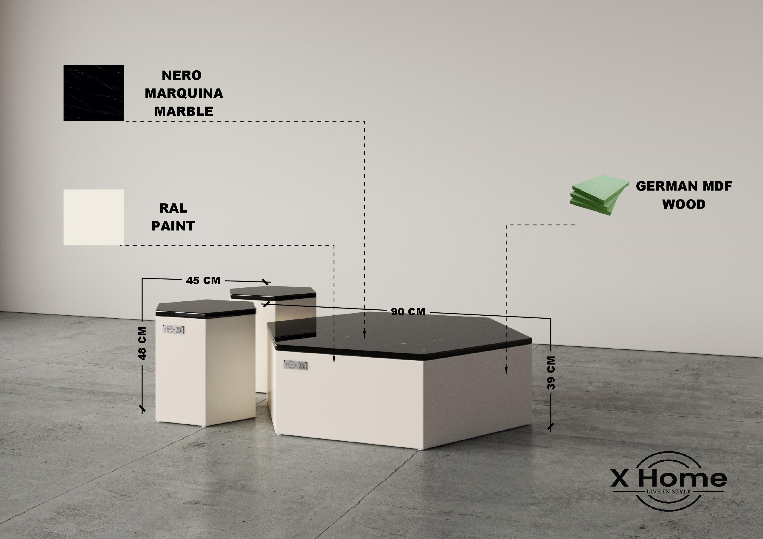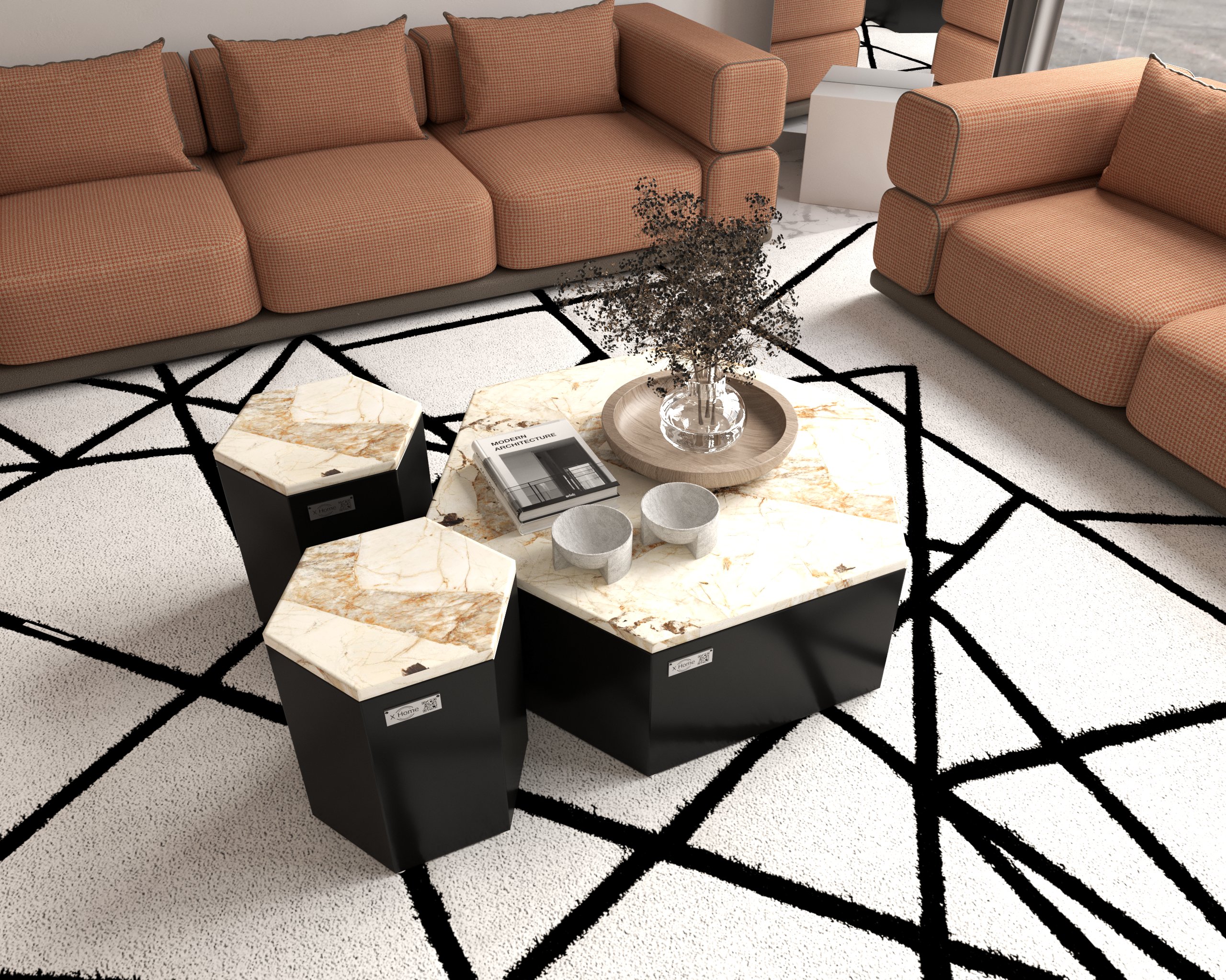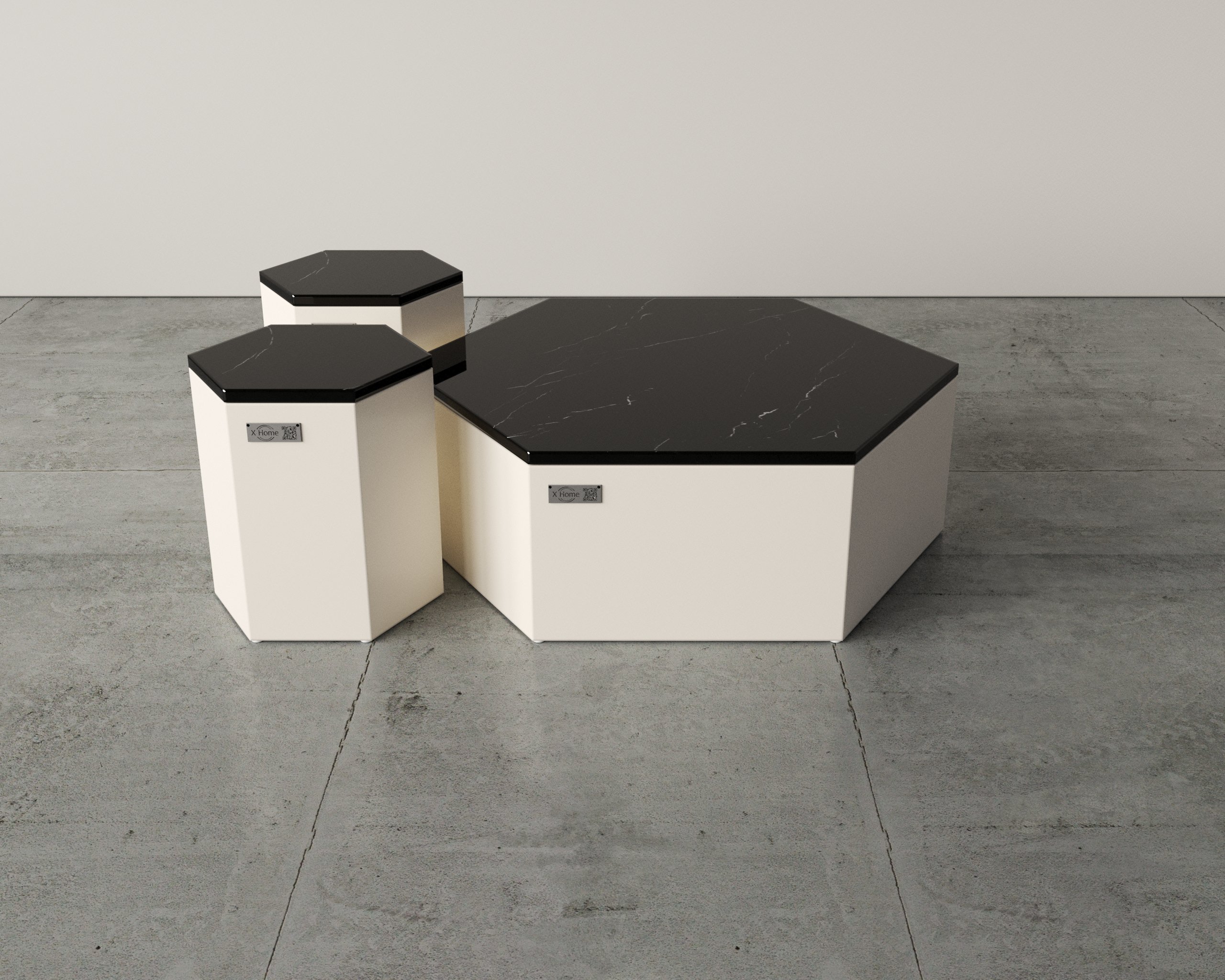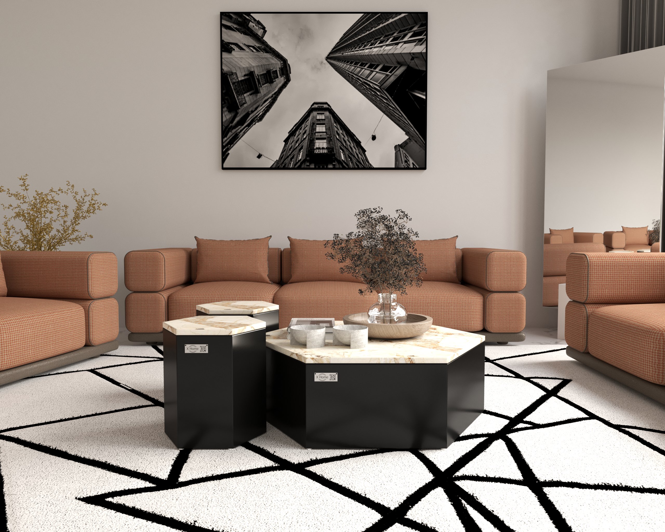 The Arden Hex Coffee Table set showcases a harmonious blend of form and function through its striking hexagonal design. Crafted with premium materials, it features a luxurious marble top paired with a sleek, structured base that exudes modern sophistication. Its layered configuration adds depth and versatility, making it an ideal centerpiece for contemporary interiors.
