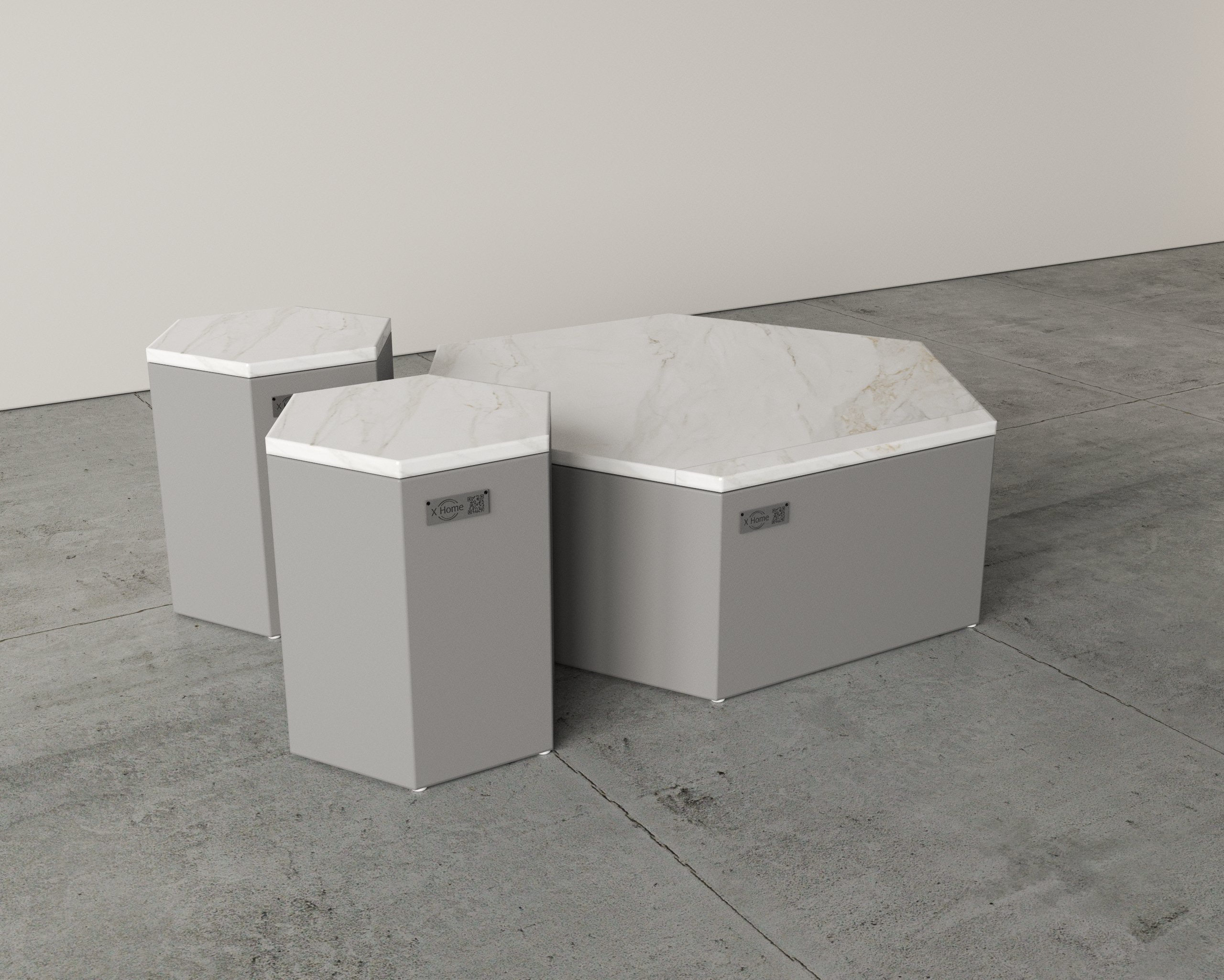 A contemporary hexagonal table set that blends marble elegance with modern geometry for a bold, refined statement piece.