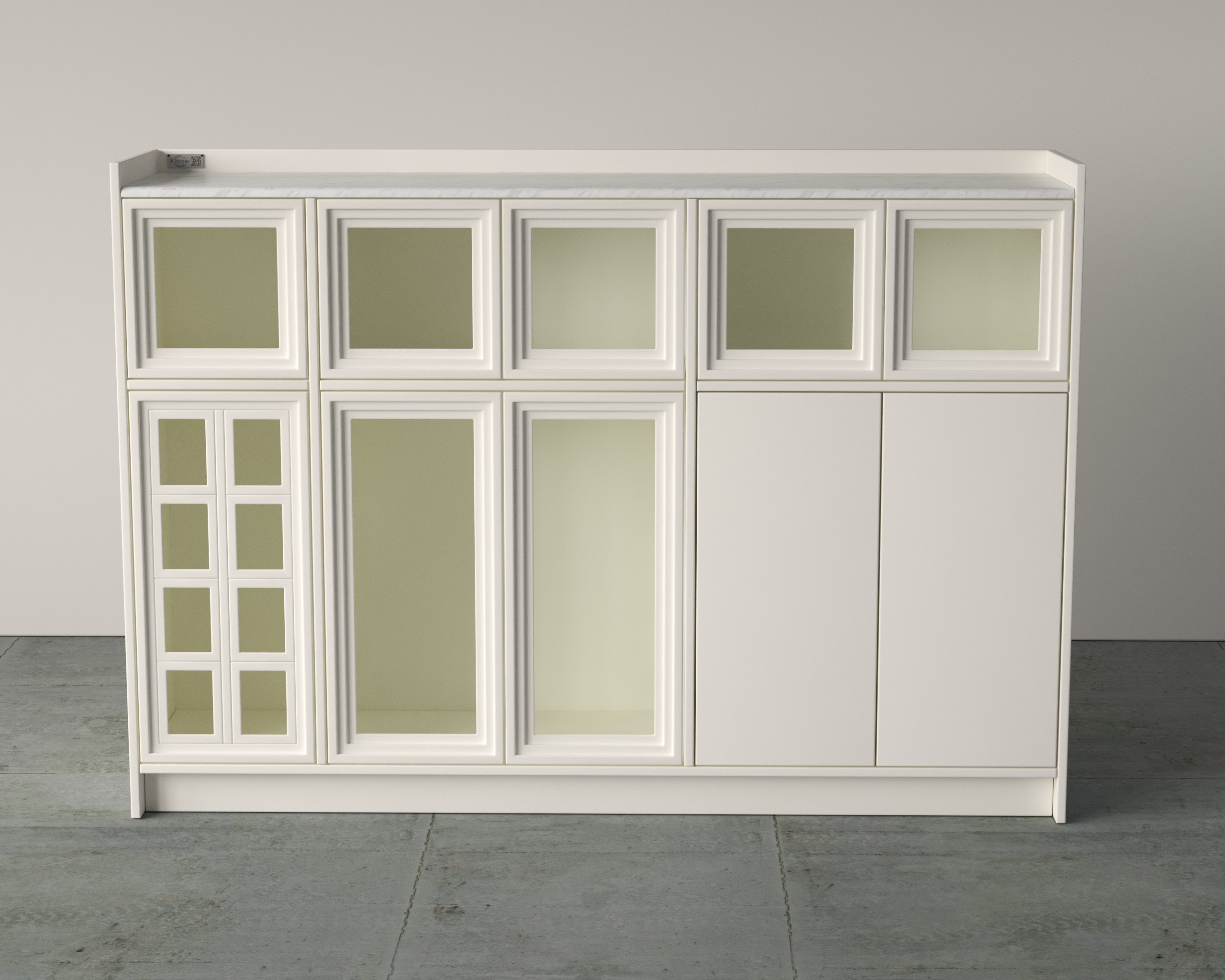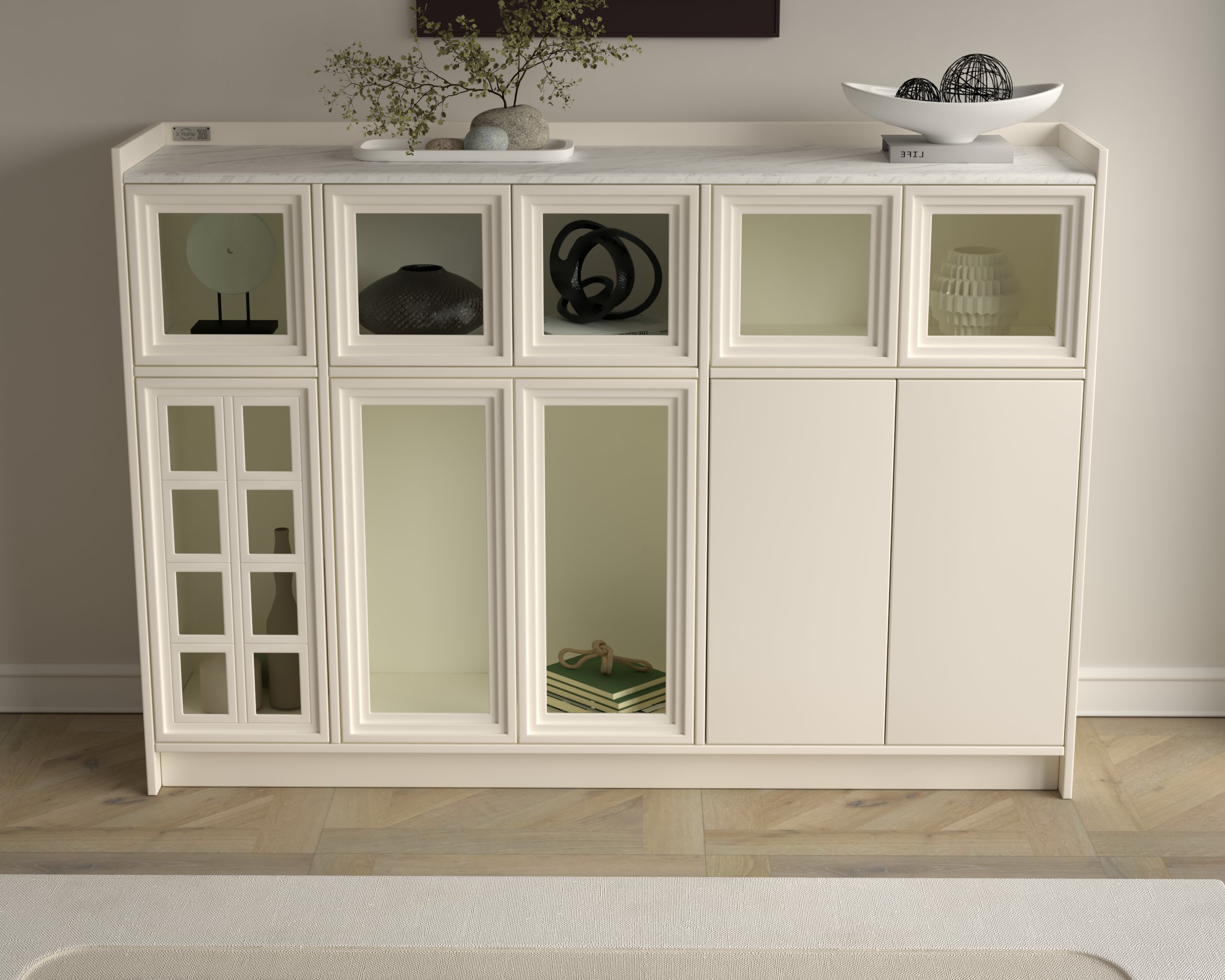 The Arezzo Dresser blends architectural detailing with functional storage, featuring framed glass panels and a refined marble top for a sophisticated presence.