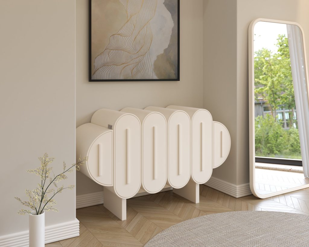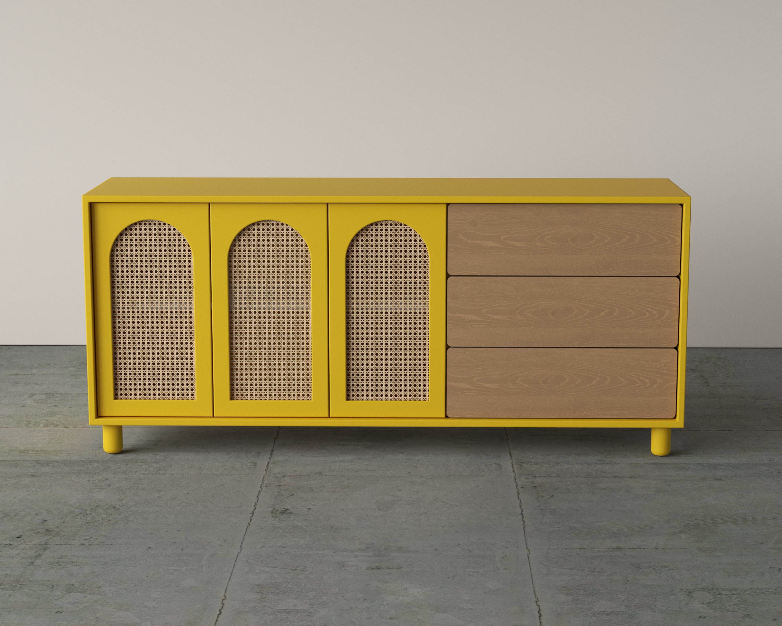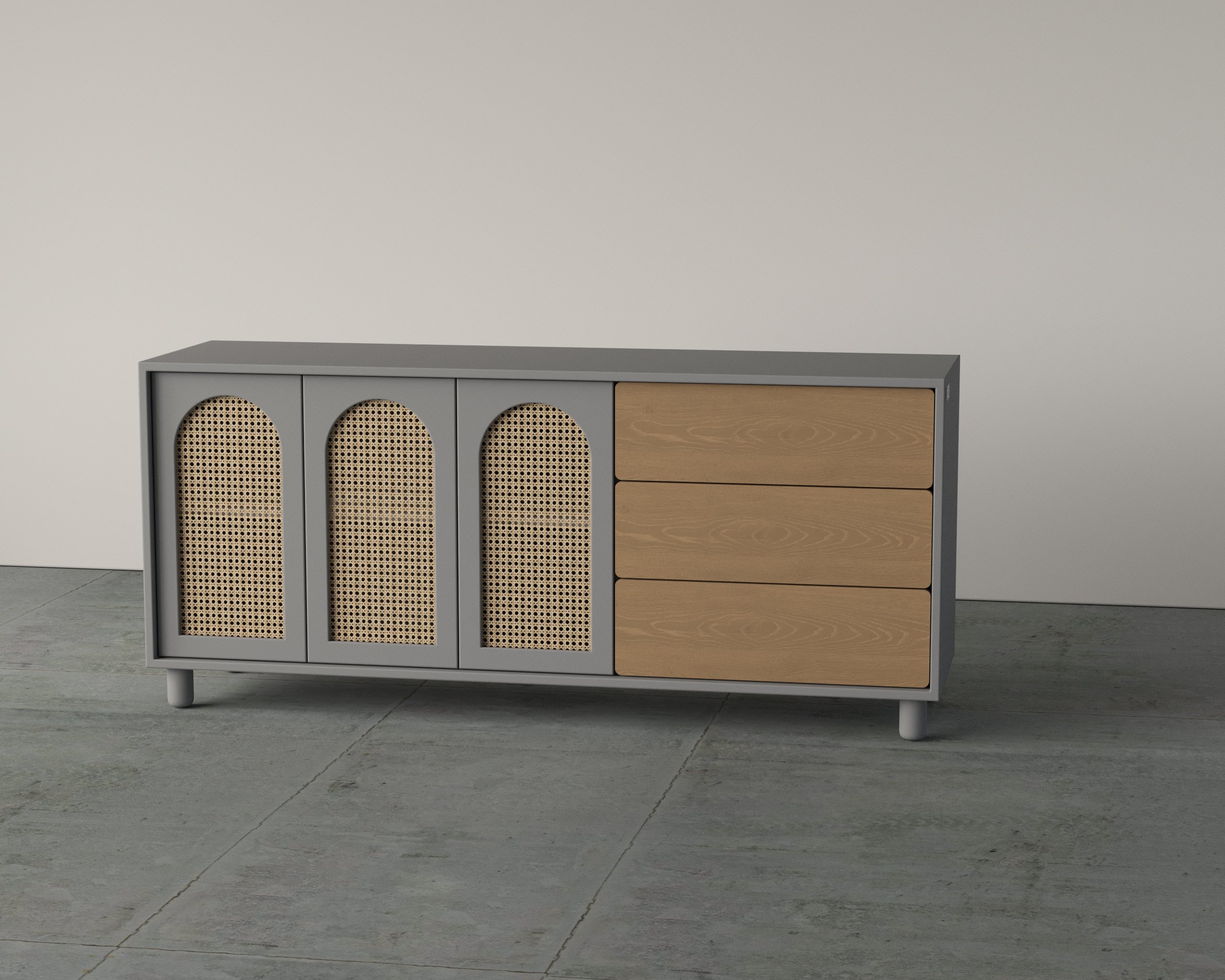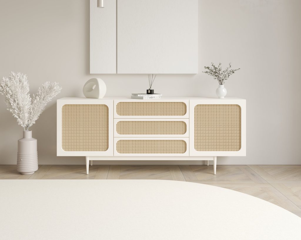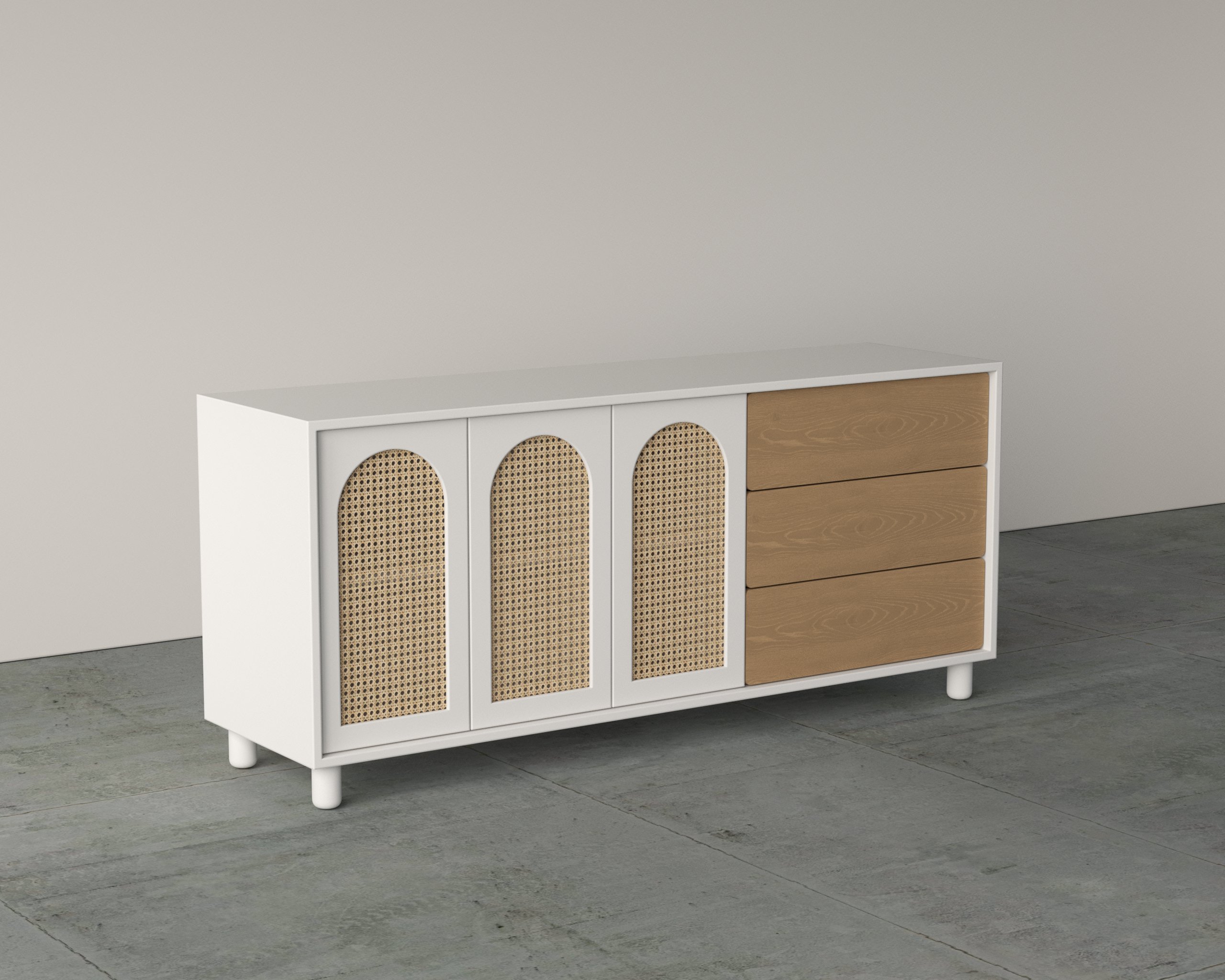 The Atelier Dresser blends refined craftsmanship with functional storage, featuring arched rattan wood–finished panels and sleek drawer detailing for a timeless appeal.