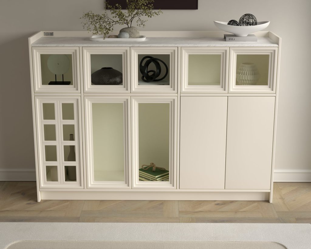 Designed with a balance of elegance and practicality, the Atelier Dresser showcases arched rattan wood–finished doors paired with smooth push-to-open drawers. Its thoughtfully structured interior offers ample storage while maintaining a light, architectural presence. Ideal for contemporary and classic interiors alike.