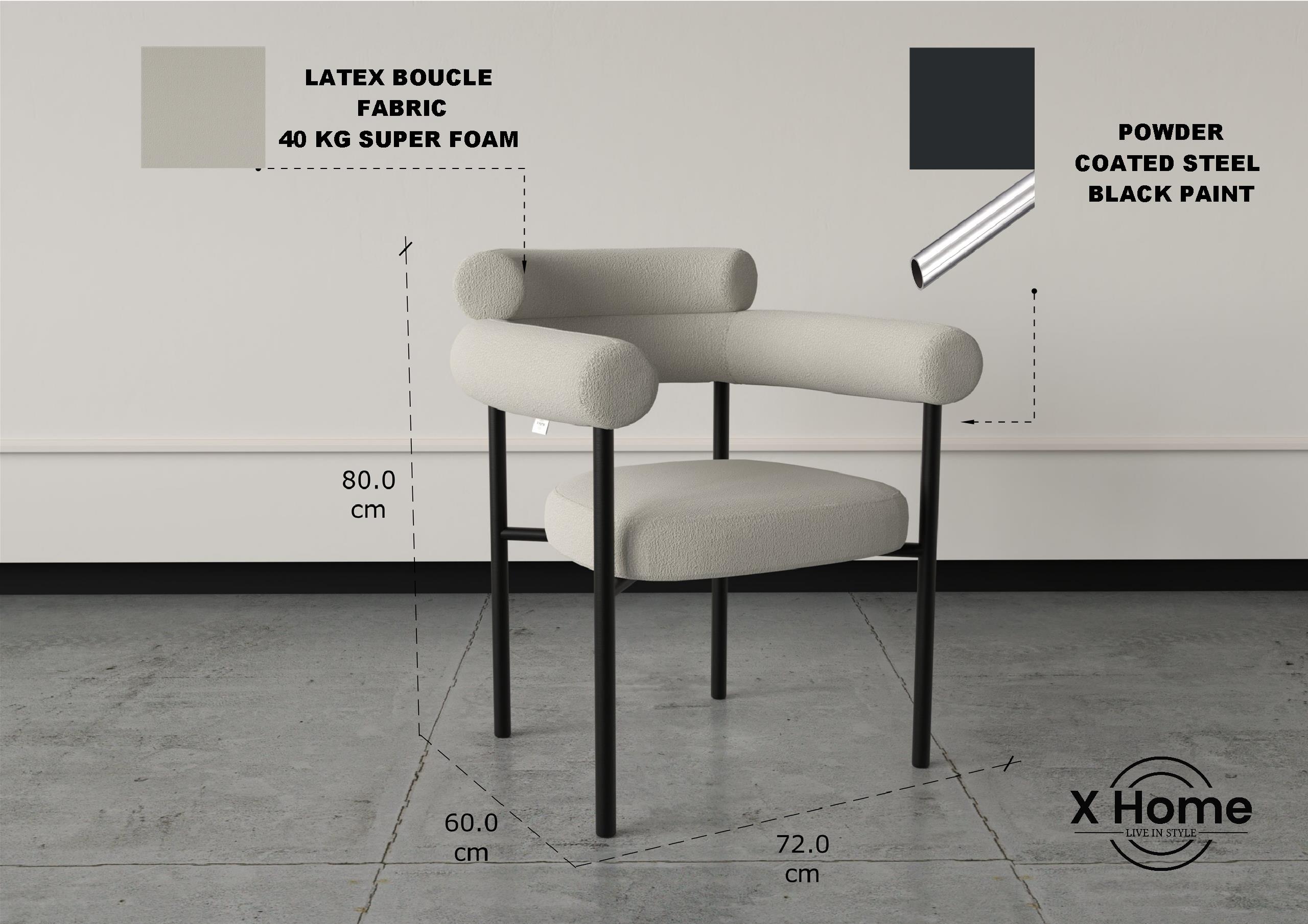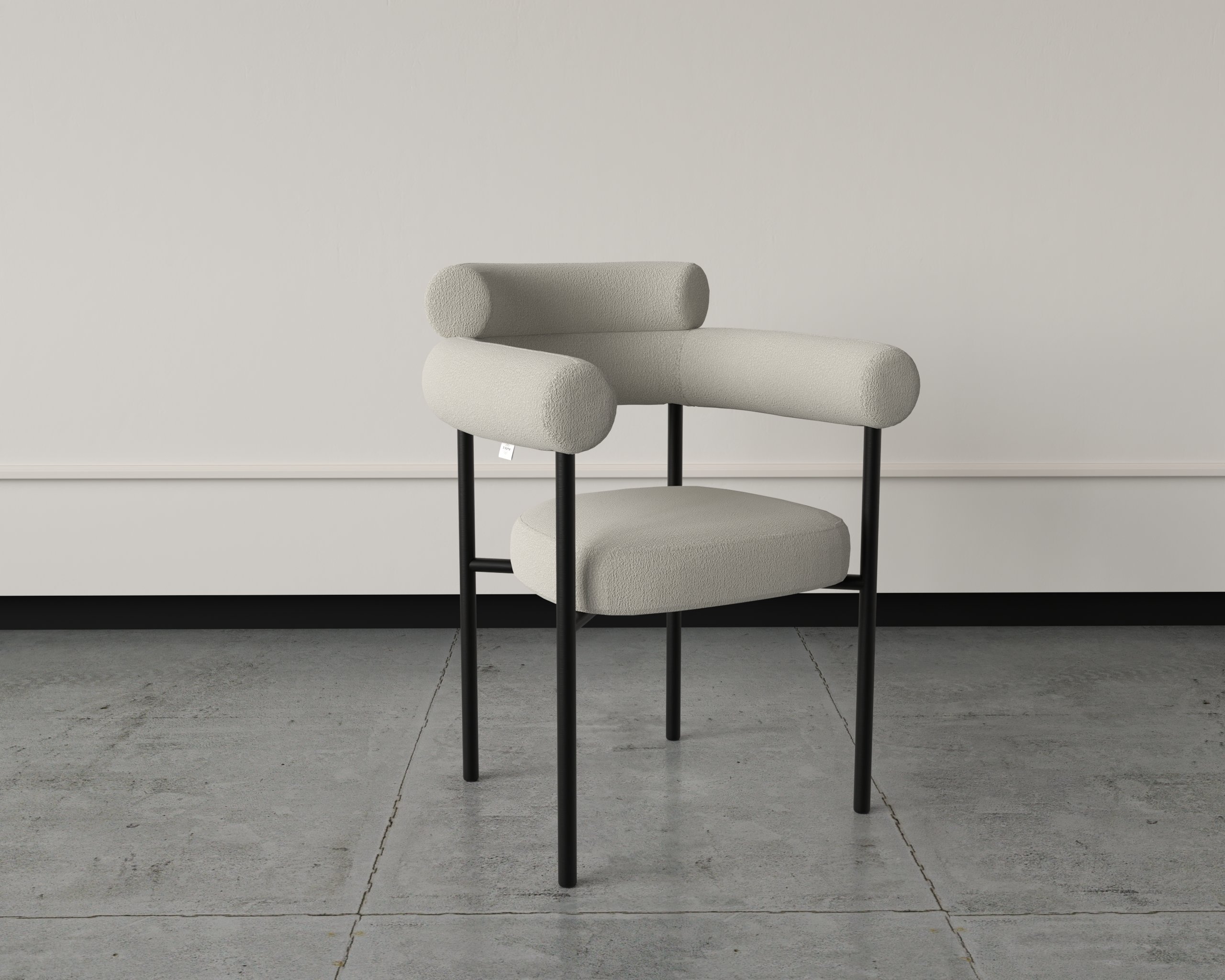 The Aurora Boucle Chair blends plush boucle upholstery with a clean powder-coated steel frame, creating a refined balance between softness and structure. Its rounded cushions offer ergonomic comfort, while the open-frame design enhances visual lightness. Perfect for modern interiors seeking both comfort and artistic form.