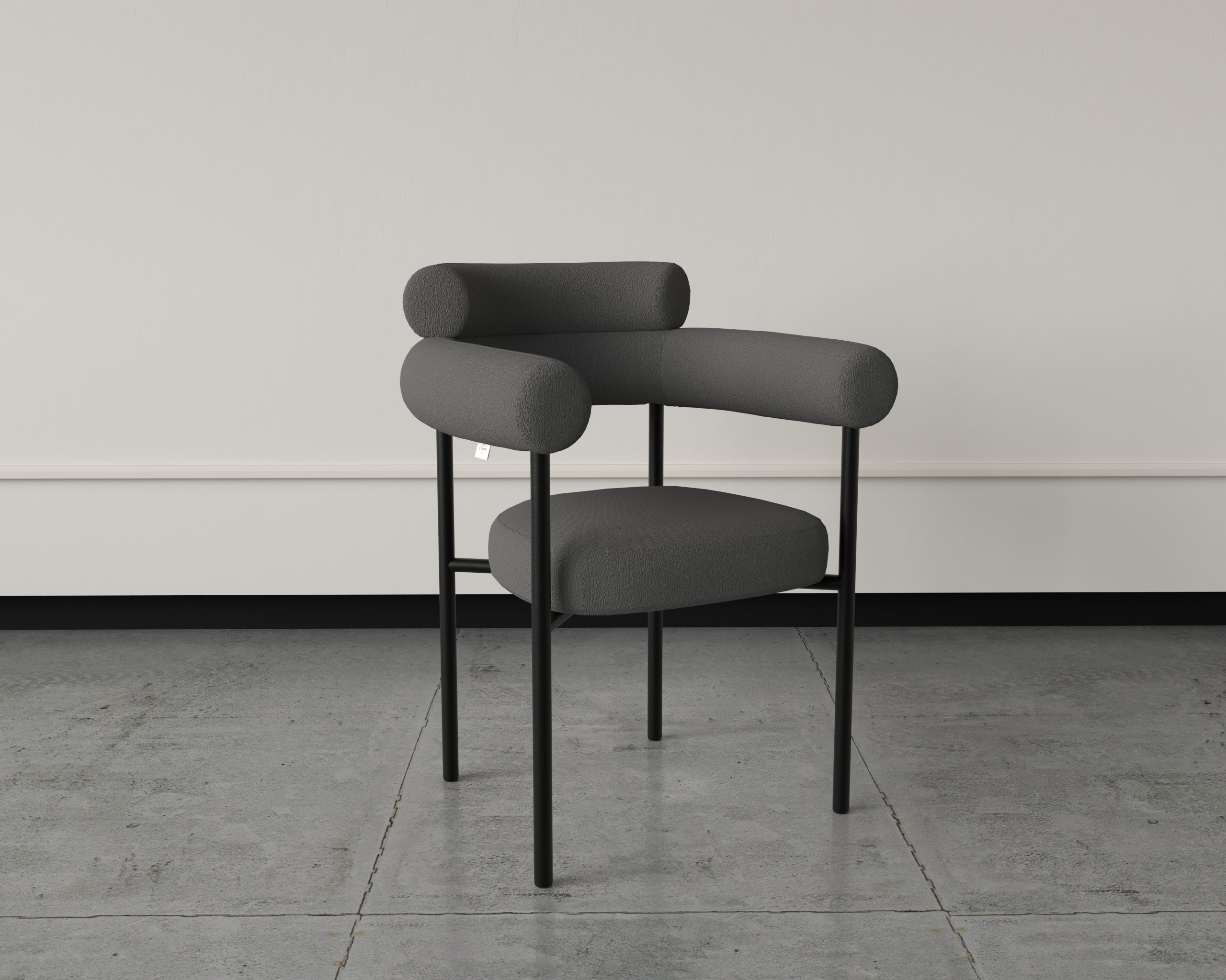 A modern boucle chair featuring sculpted cylindrical cushioning and a sleek metal frame. Designed to offer comfort with a bold contemporary silhouette.