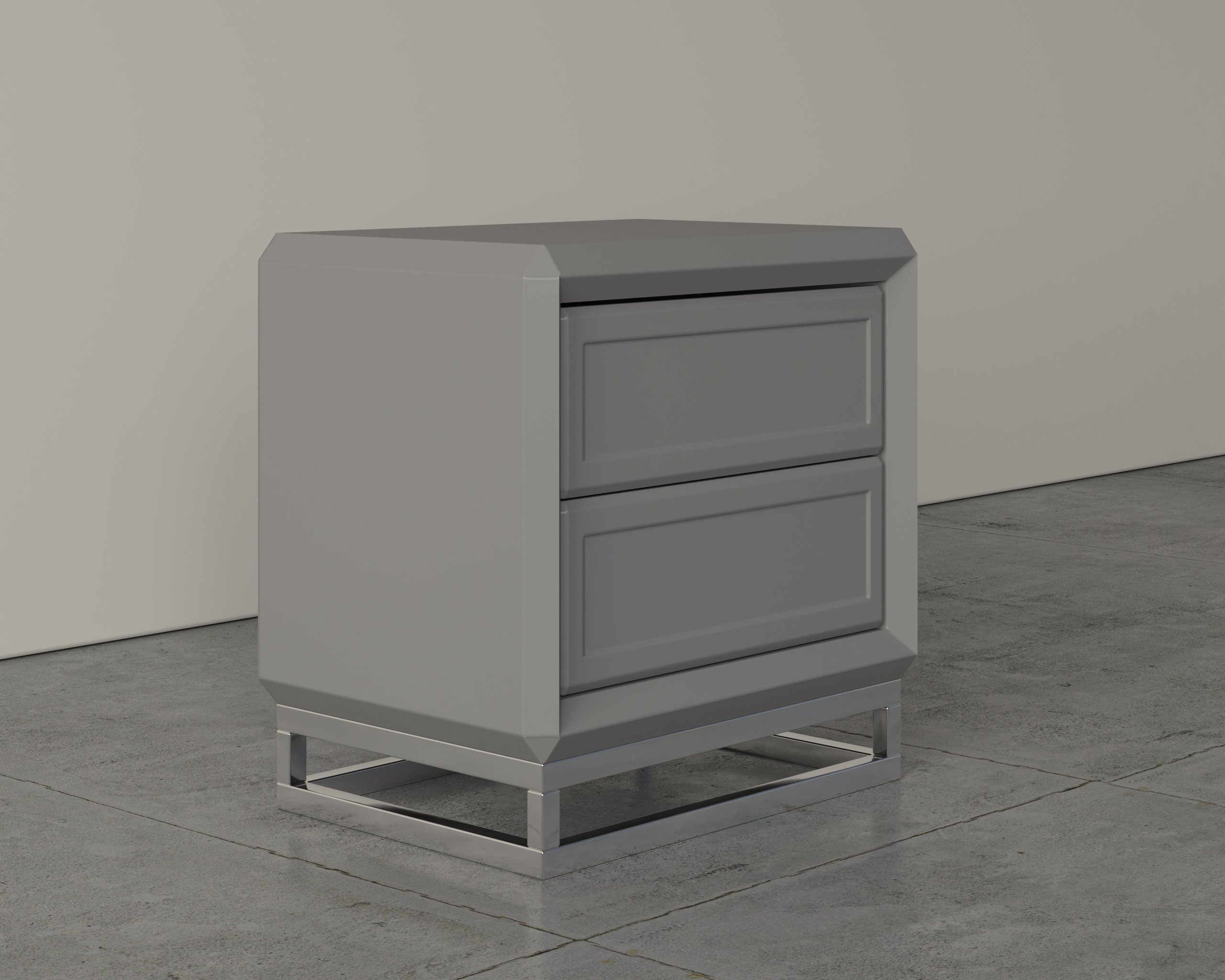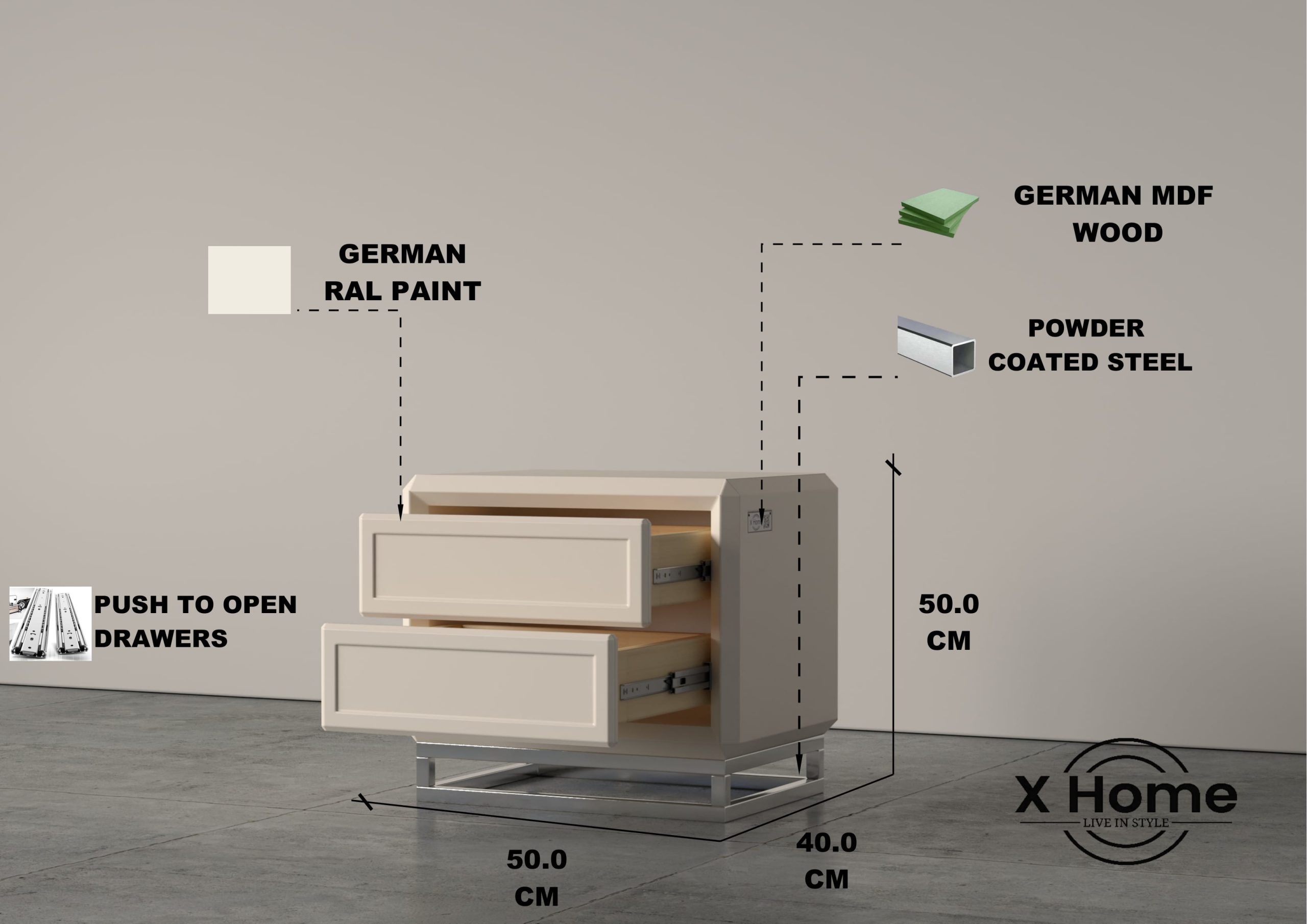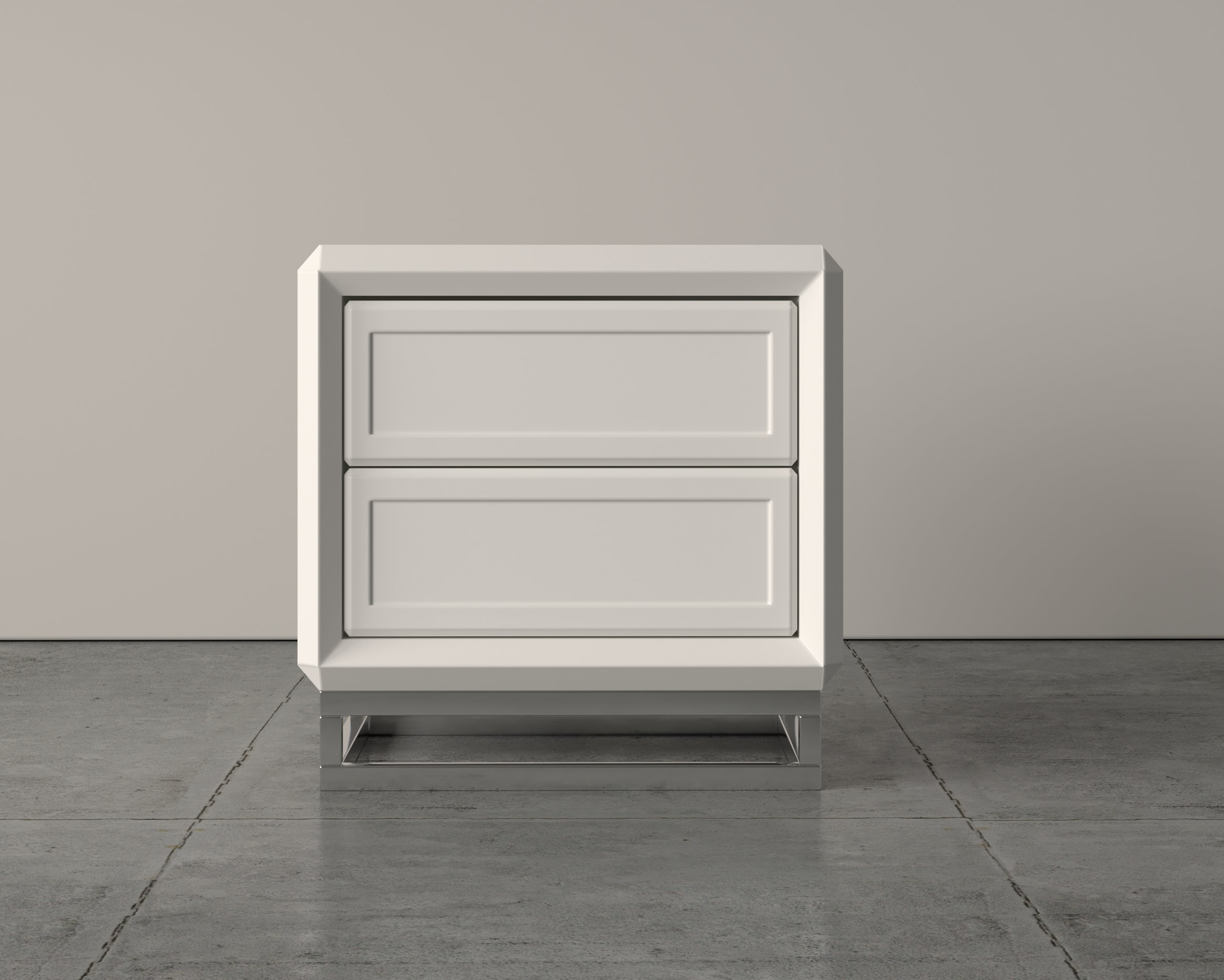 The Bianca Bedside Table pairs softness with strength. Featuring a beige body with clean grey drawer fronts and chamfered corners, its sculpted shape feels elegant yet functional. The metal open-frame base gives the piece an airy lift, while two spacious drawers offer practical bedside storage. Designed for modern and transitional spaces, Bianca brings effortless balance to any bedroom setup.