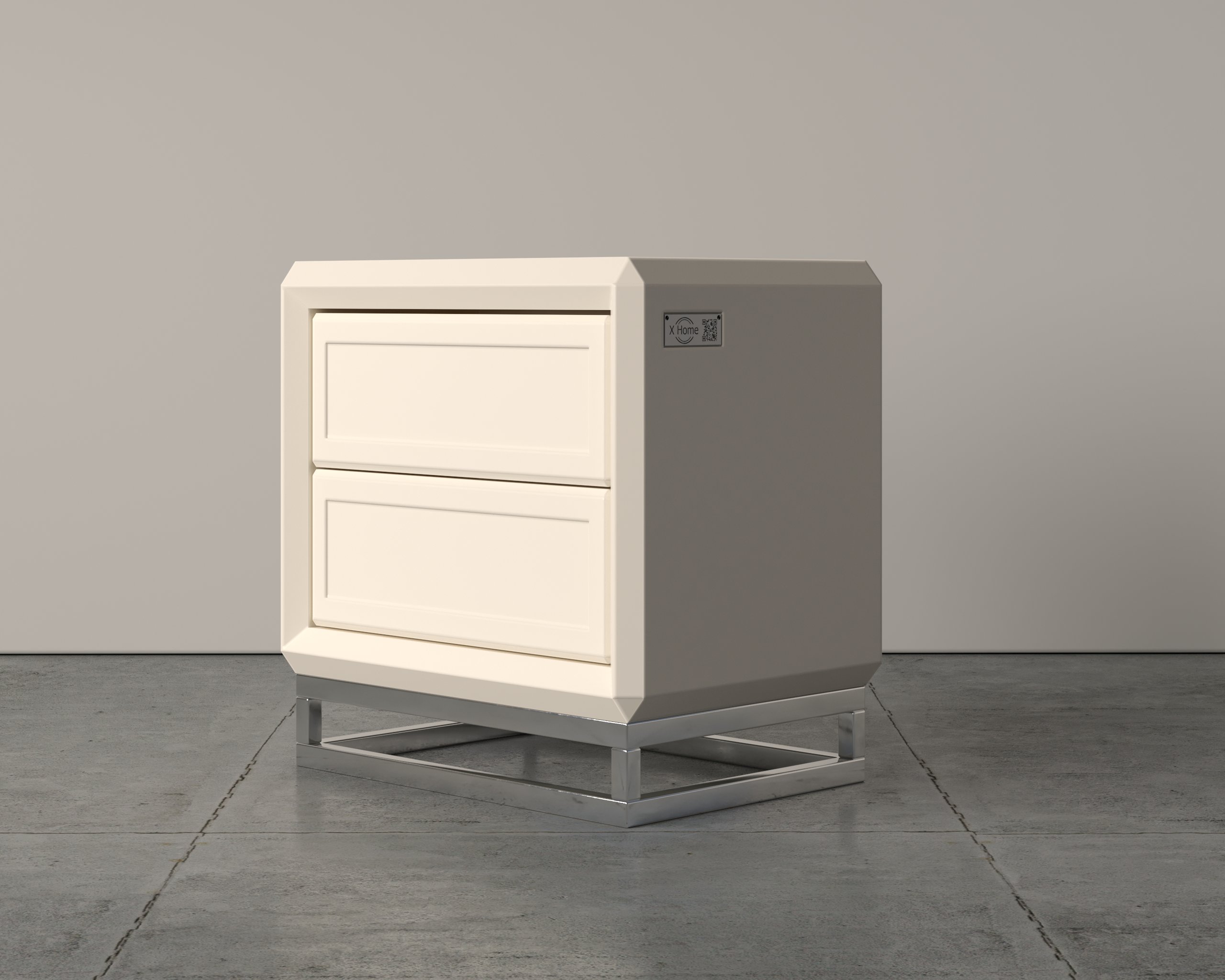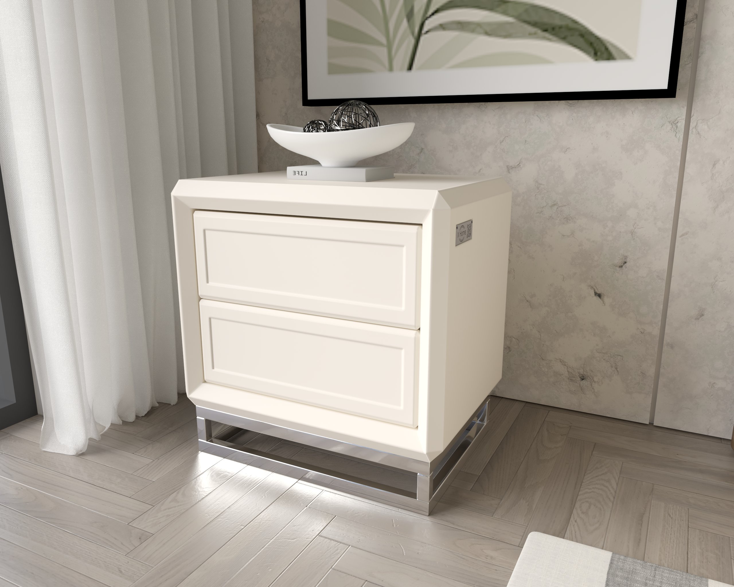 With clean lines and a metallic base, the Bianca bedside table blends soft tones and structured form in a luxurious modern silhouette.
