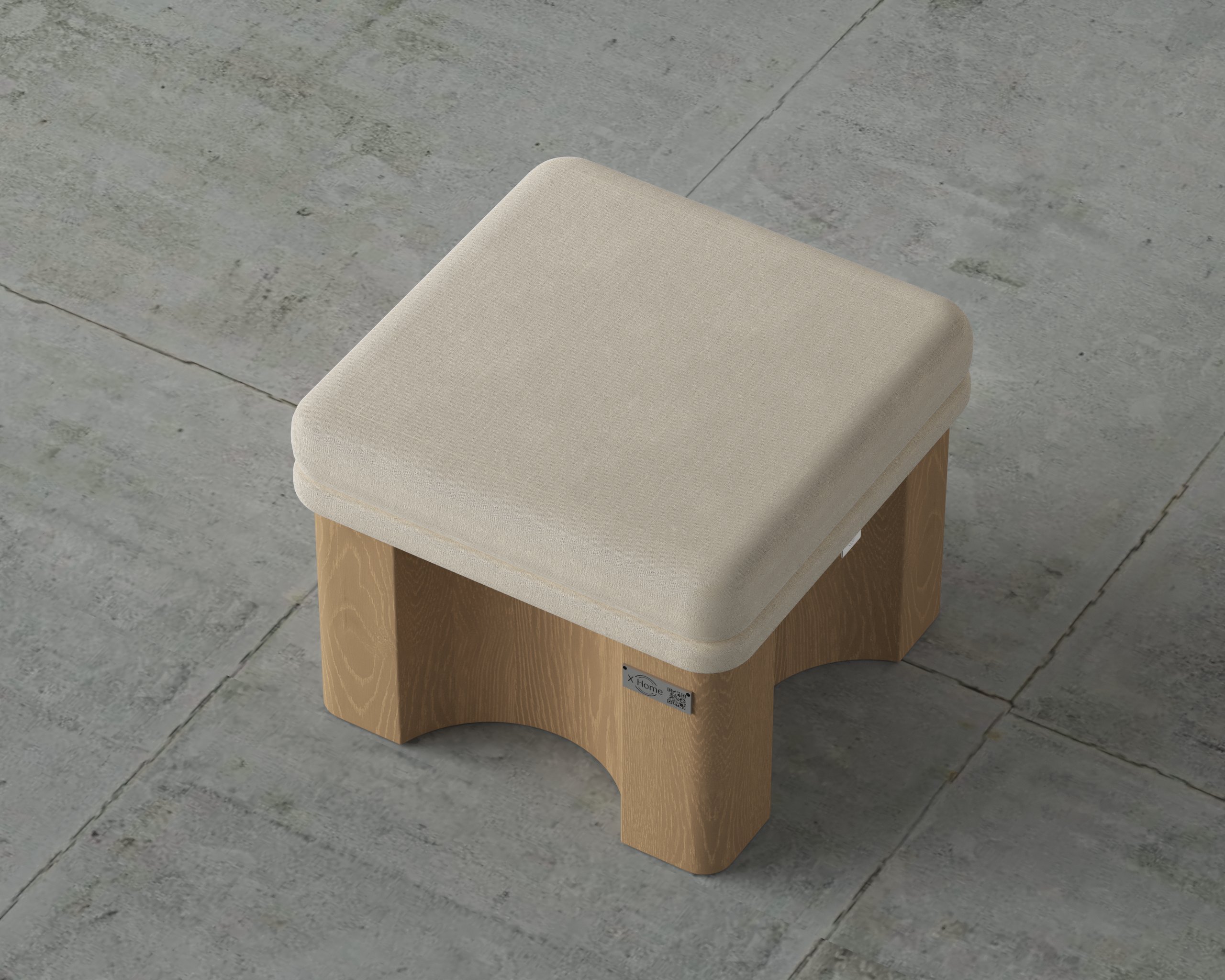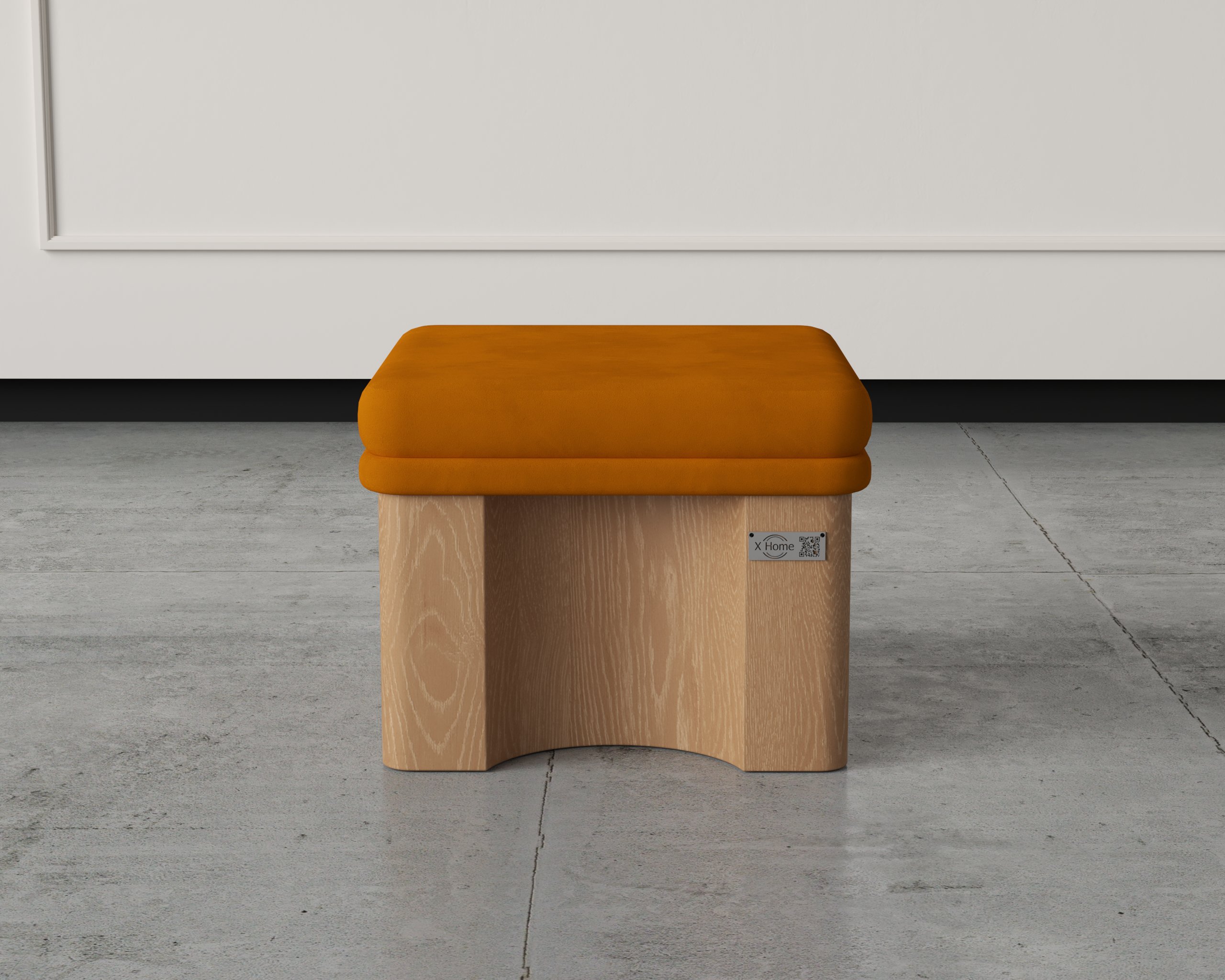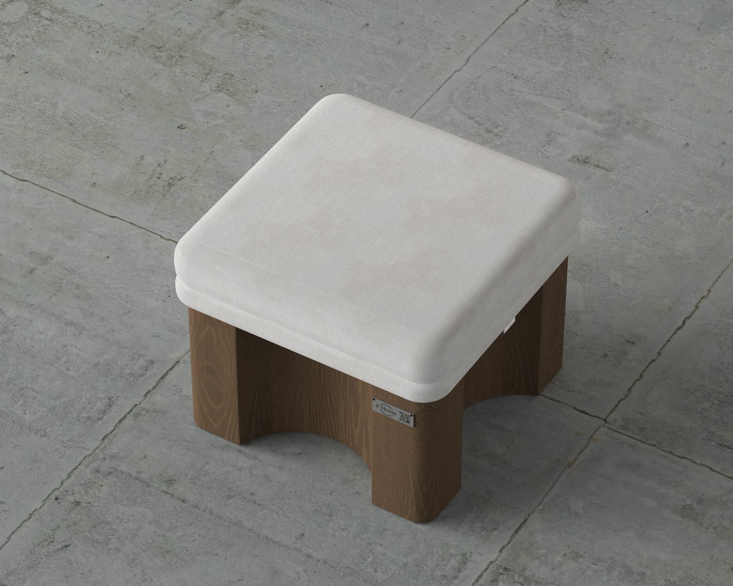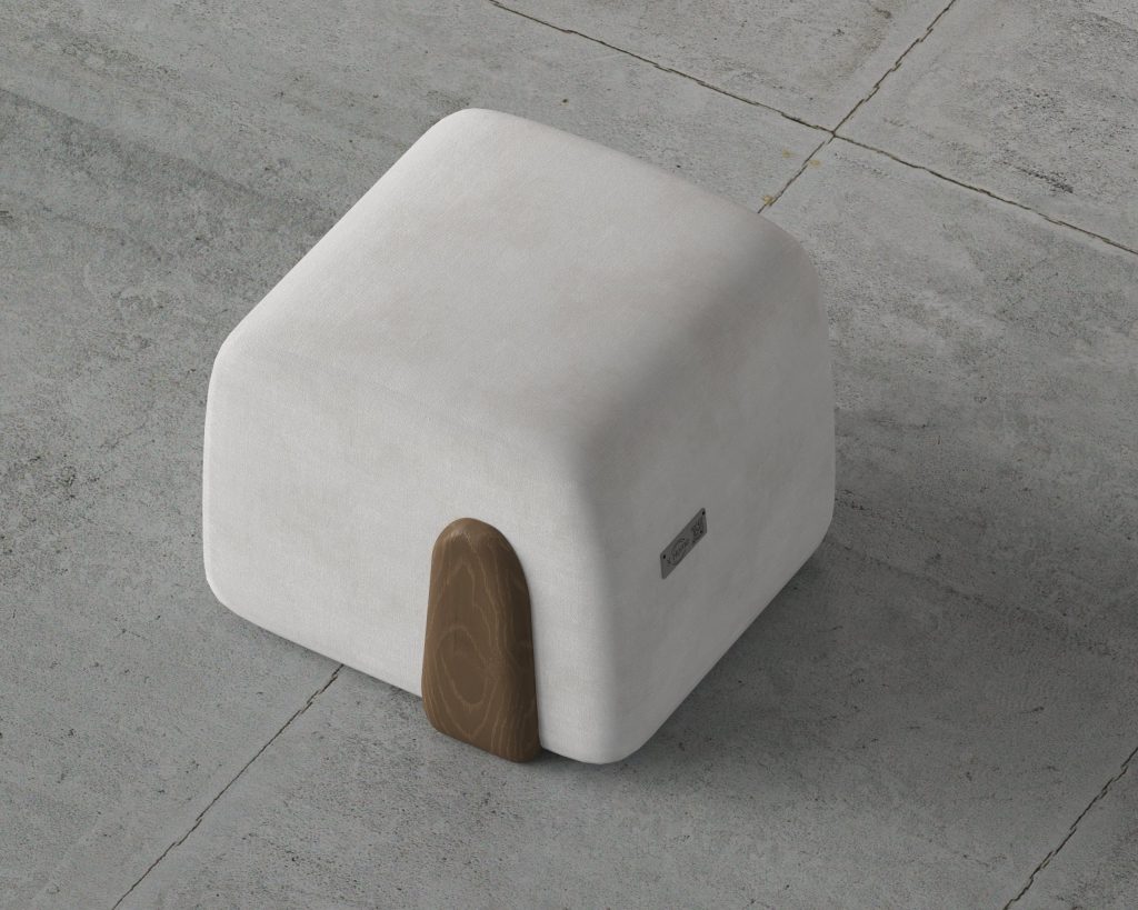 A sculpted cube-style bench combining a softly contoured seat with a bold architectural wooden base. Designed to add comfort and character to any modern interior.
