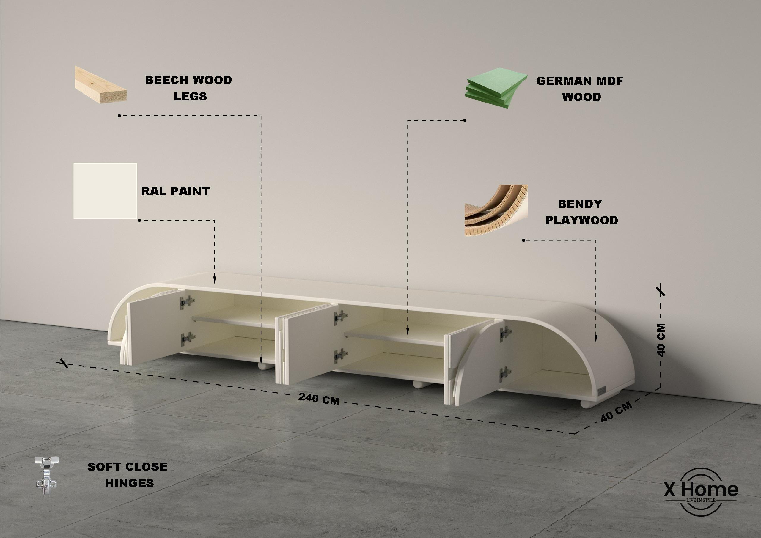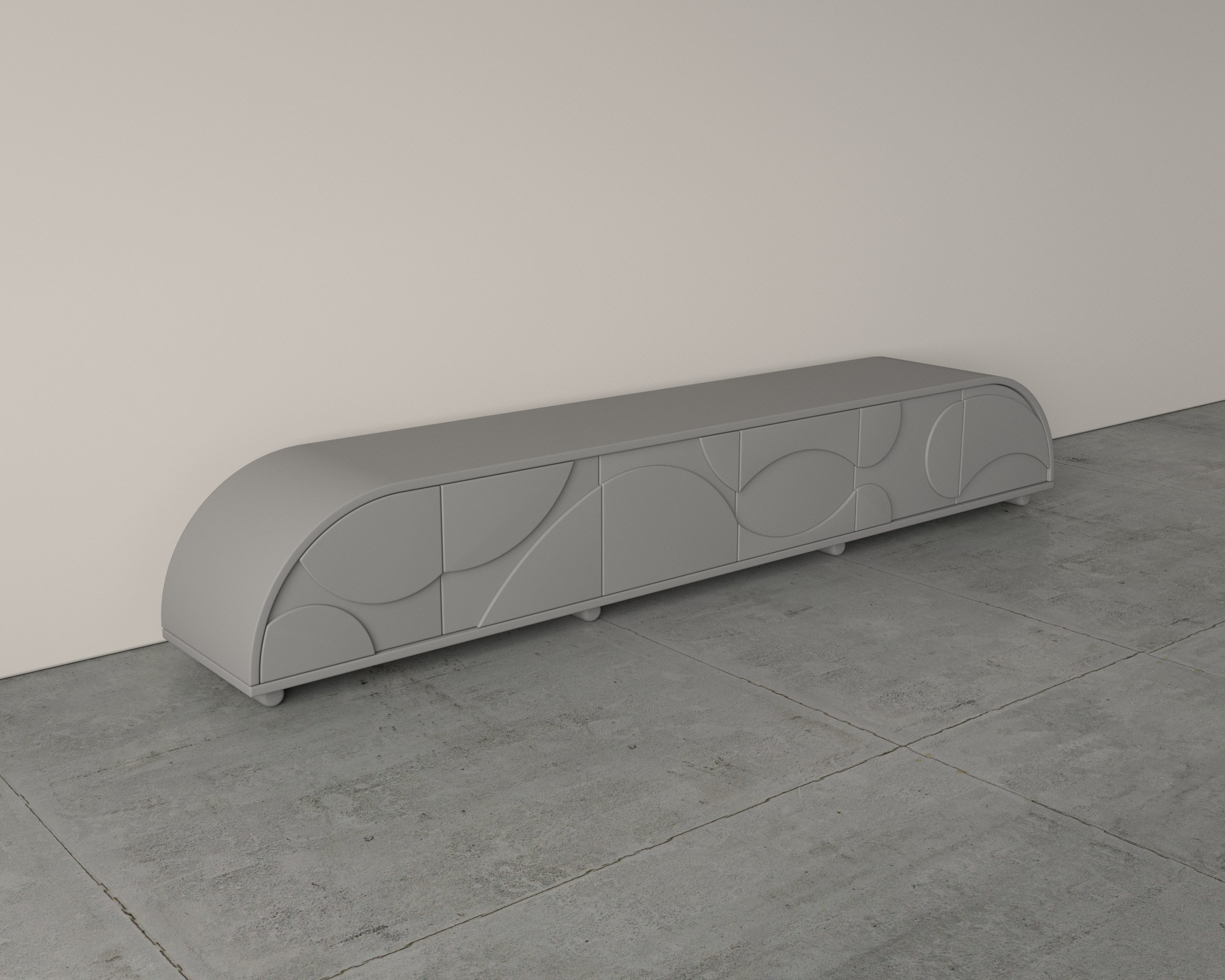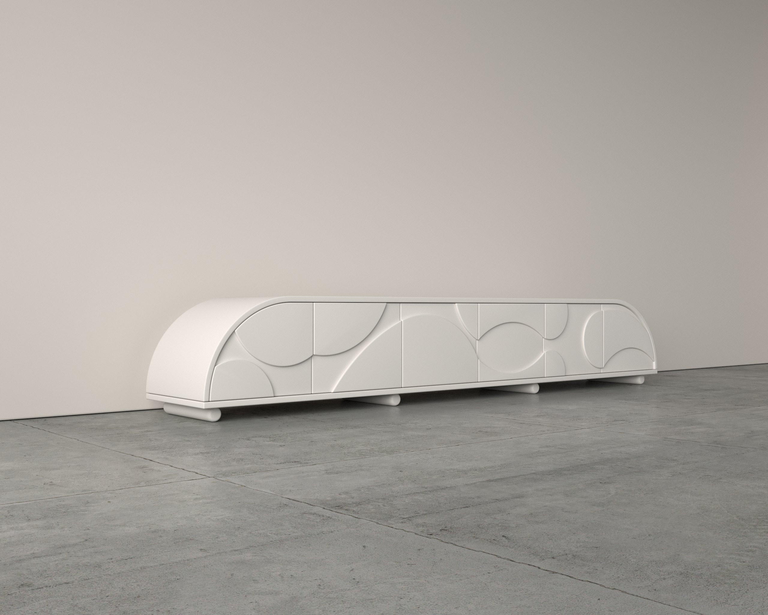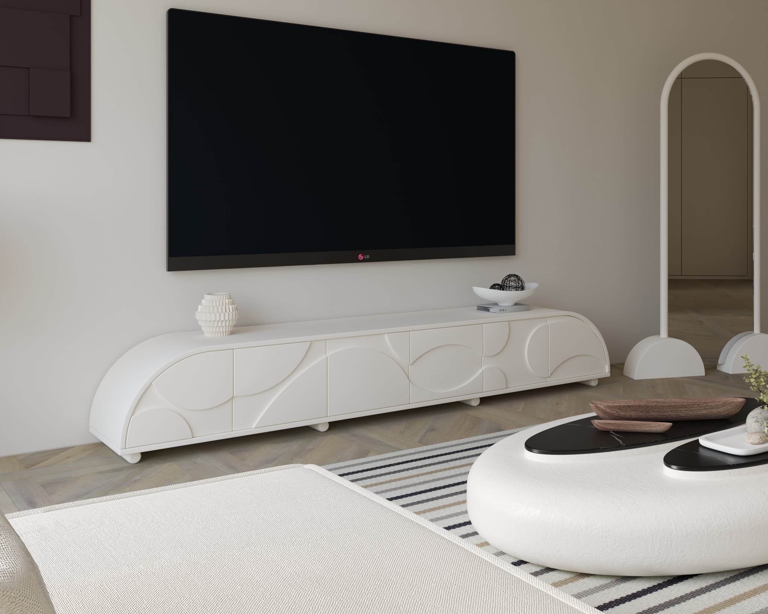 Circa TV Unit features a sculpted curved silhouette paired with artistic panel detailing for a contemporary, statement look. Designed with spacious storage and smooth functionality for modern living.