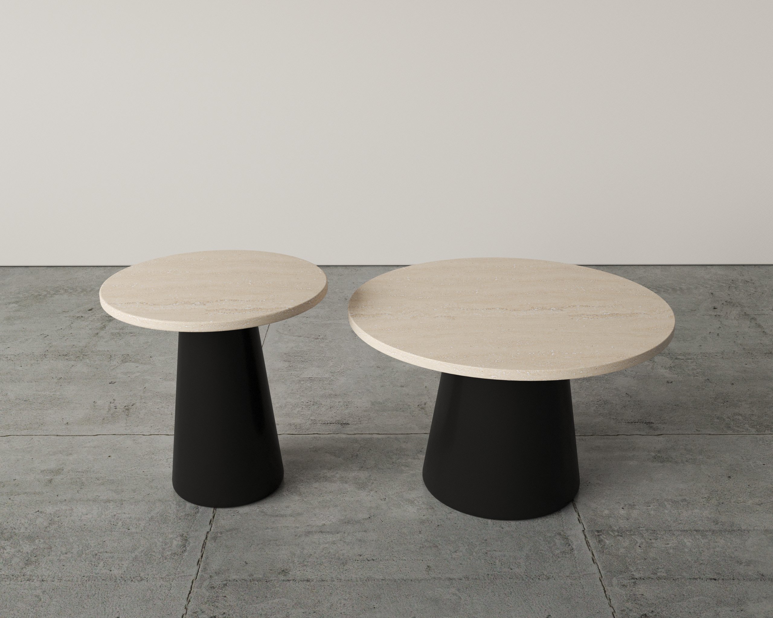 A sleek pair of sculptural coffee tables featuring a harmonious blend of natural stone and refined craftsmanship, perfect for contemporary interiors.