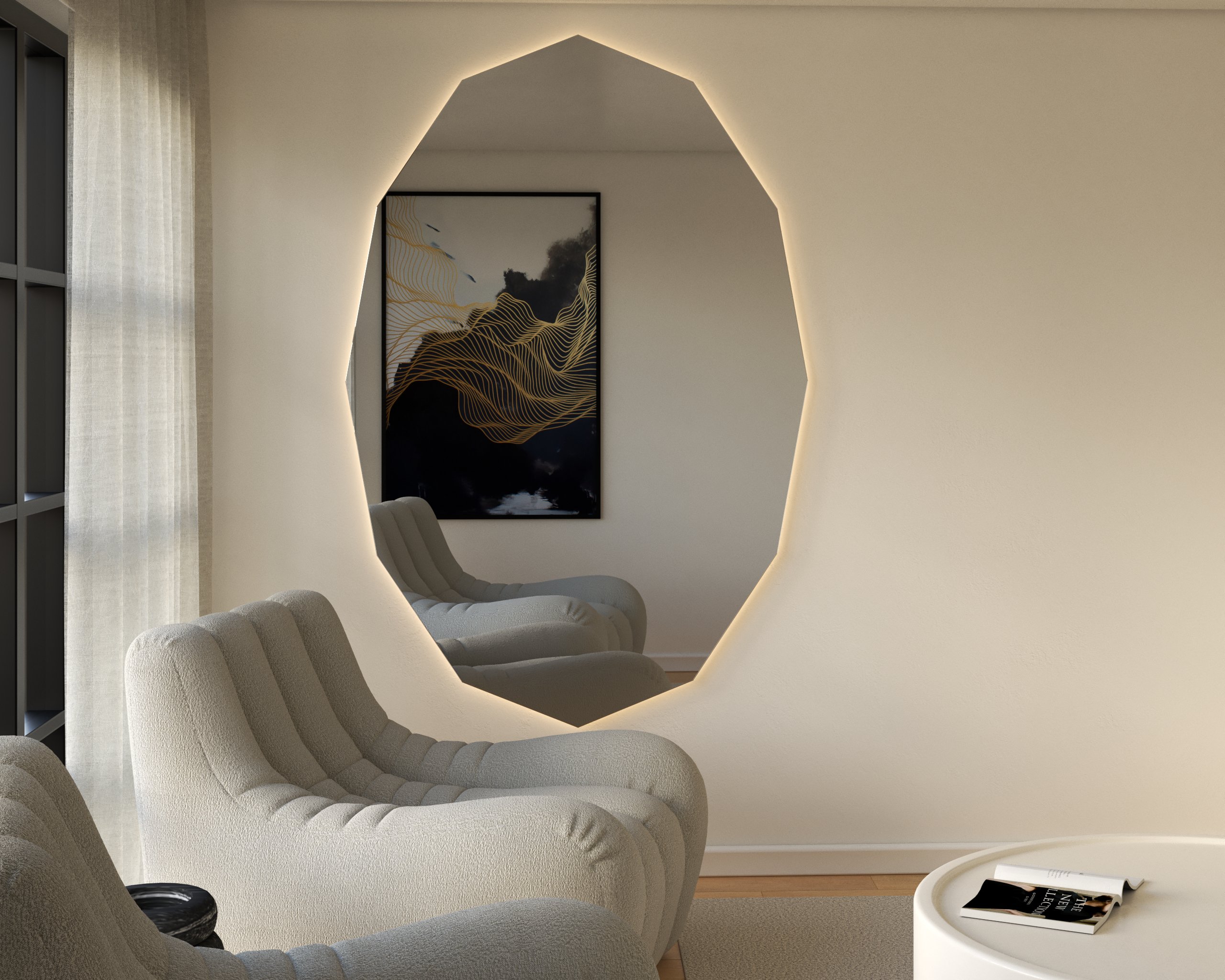 The CrystaGlow Mirror combines a sculpted, irregular crystal-like form with ambient LED backlighting, creating a warm and luxurious atmosphere. Its premium Belgium mirror surface offers exceptional clarity while the artistic shape becomes a striking focal point in bedrooms, living rooms, or hallways. Crafted with precision using high-quality materials, it blends sculptural beauty with everyday functionality.
