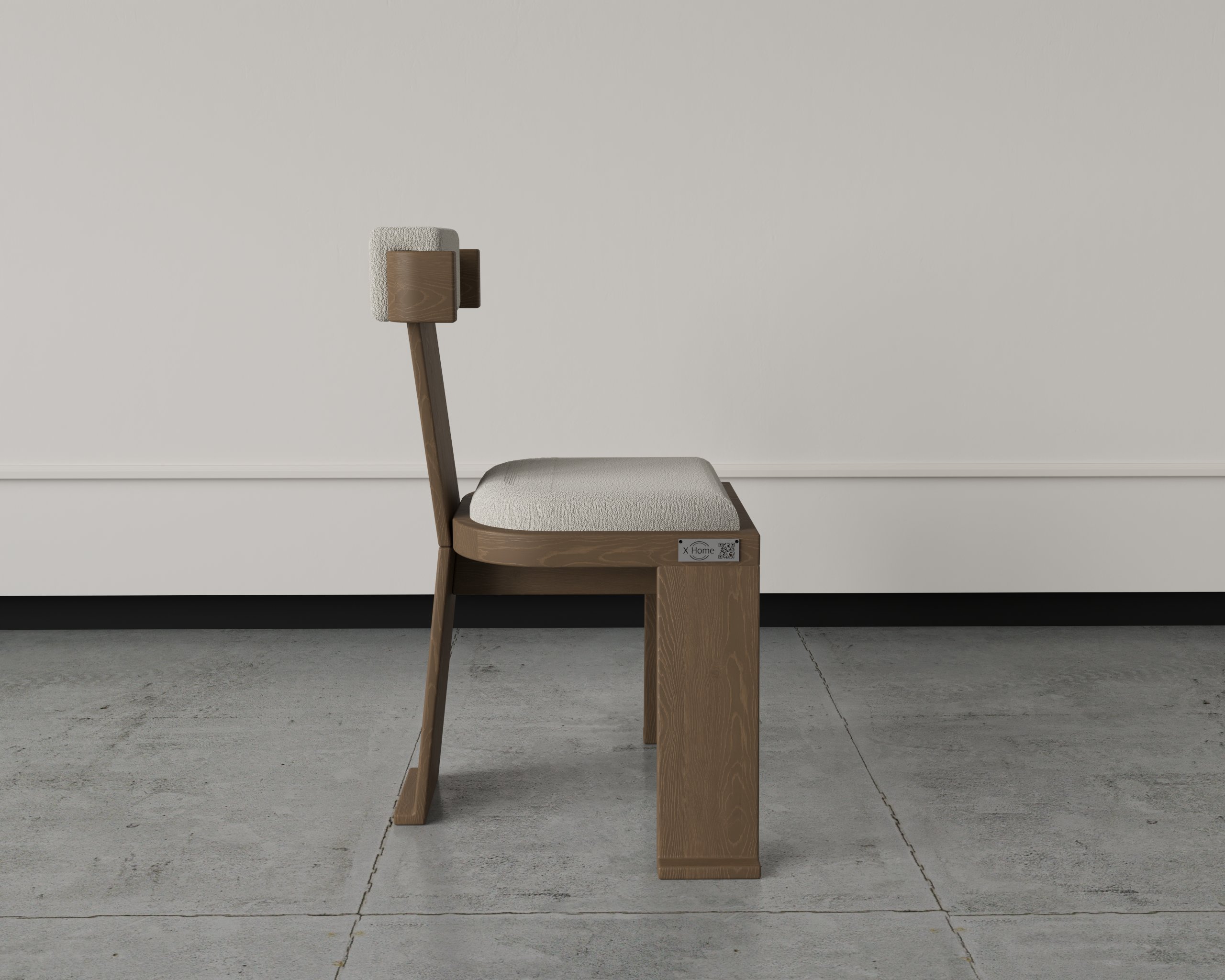The Dhruva Chair blends a sculpted wooden frame with a soft boucle-upholstered seat for elevated comfort and style. A bold contemporary form designed for both elegance and durability.