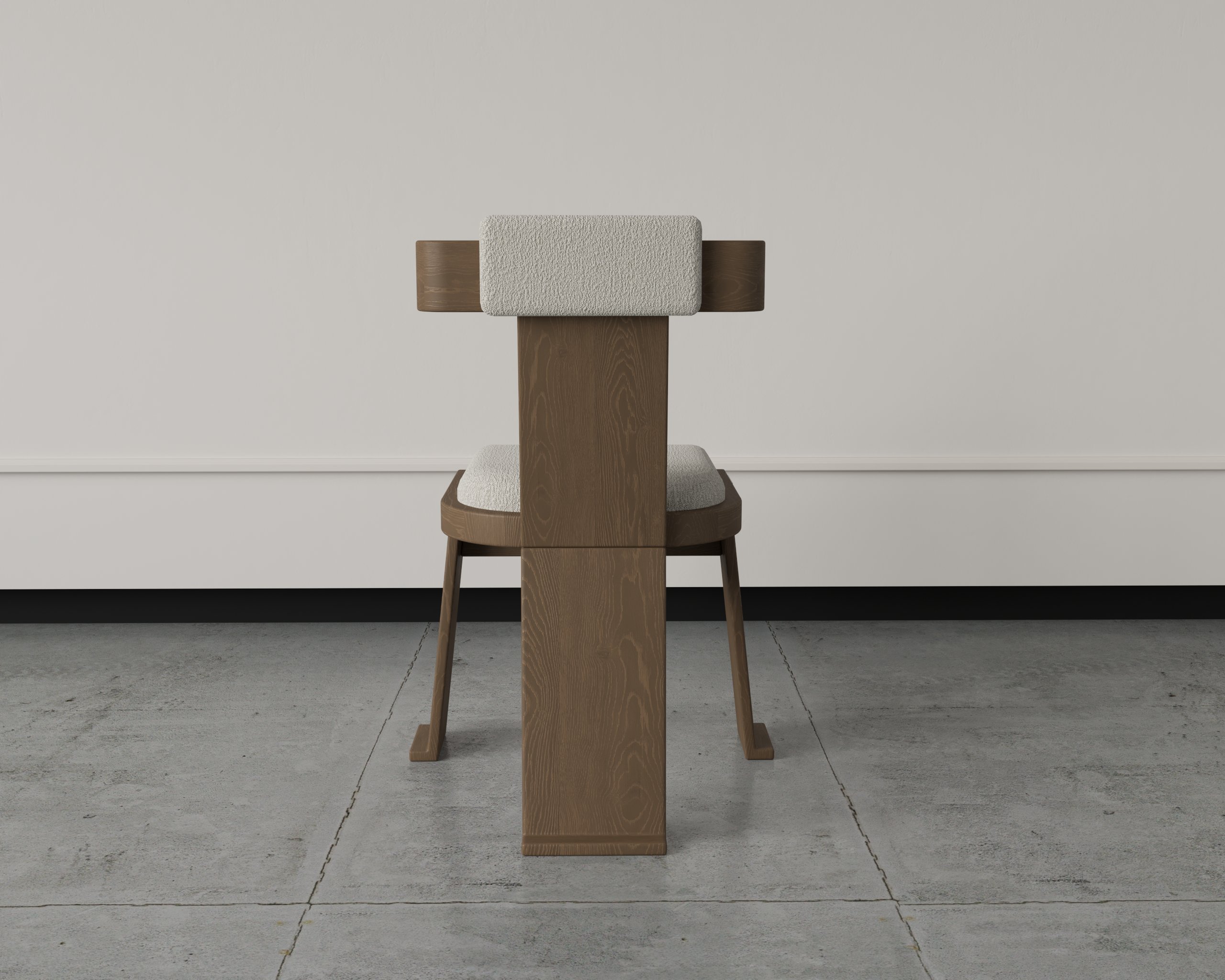 The Dhruva Chair features a solid wood structure paired with premium boucle fabric and high-density foam, offering a perfect mix of comfort and architectural design. Its expressive silhouette, angled legs, and supportive backrest make it a statement piece for modern interiors. Crafted with precision, it enhances any dining or living space with timeless sophistication.