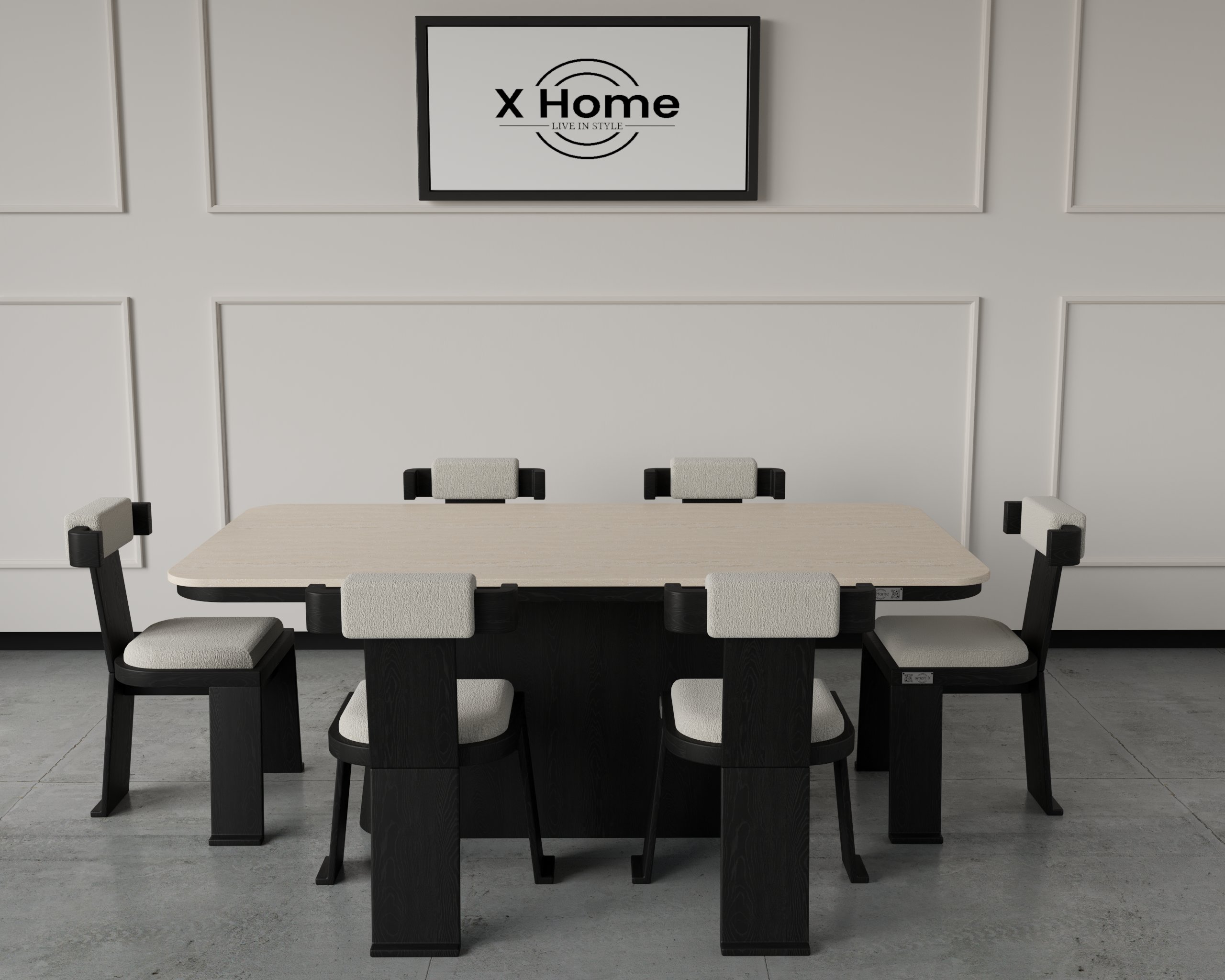 The Dhruva Dining Set showcases a solid wood table paired with ergonomically designed chairs featuring plush boucle-upholstered seats and supportive headrests. Its architectural silhouettes and smooth rounded edges bring sophistication to any dining space. Thoughtfully crafted with premium materials, it elevates both visual appeal and functional comfort.