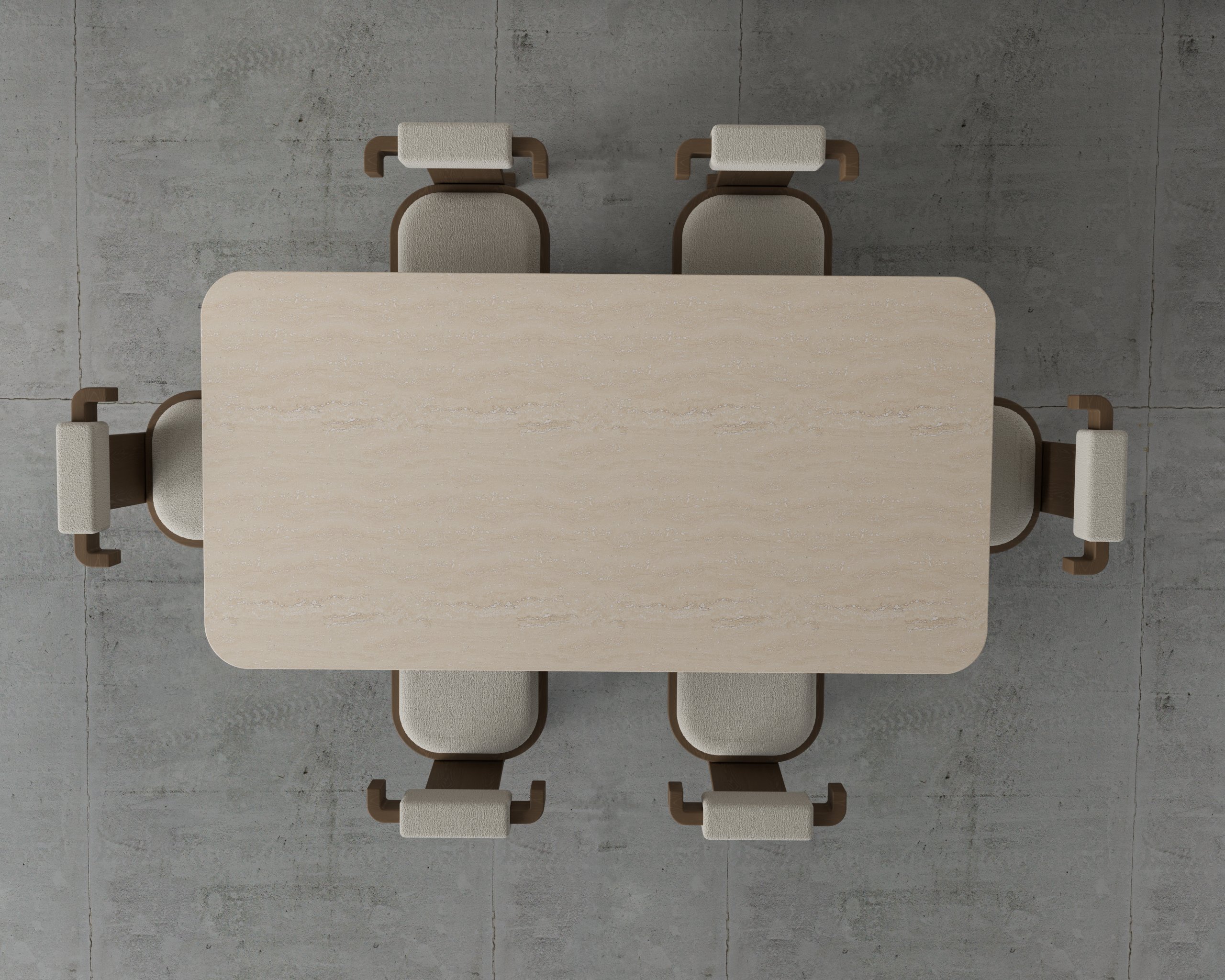 The Dhruva Dining Set blends sculptural wooden forms with soft upholstered seating, creating a refined balance of comfort and contemporary design. A modern centerpiece crafted for everyday living and elegant gatherings.