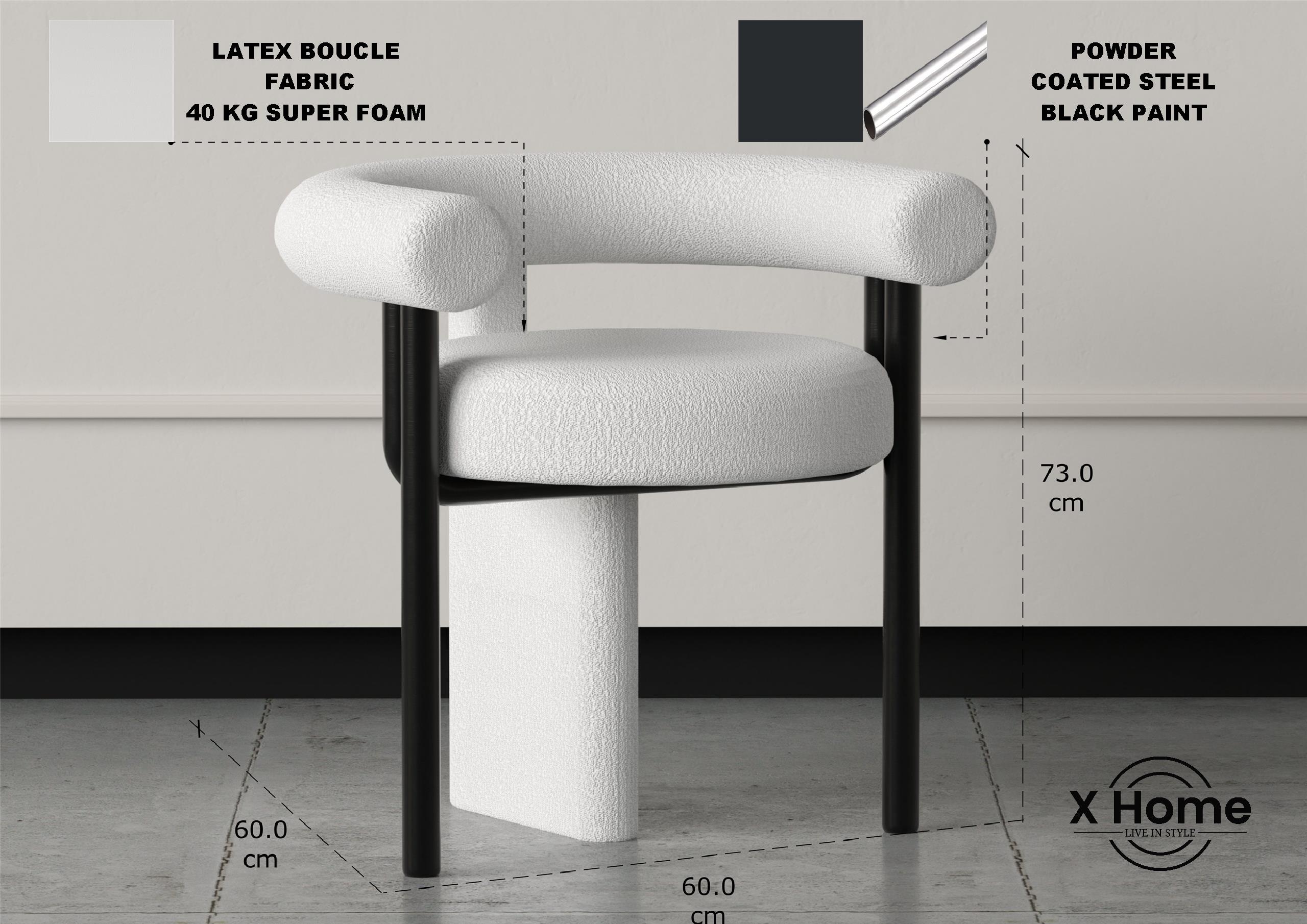 - Plush boucle chairs with rounded cushions for superior comfort.