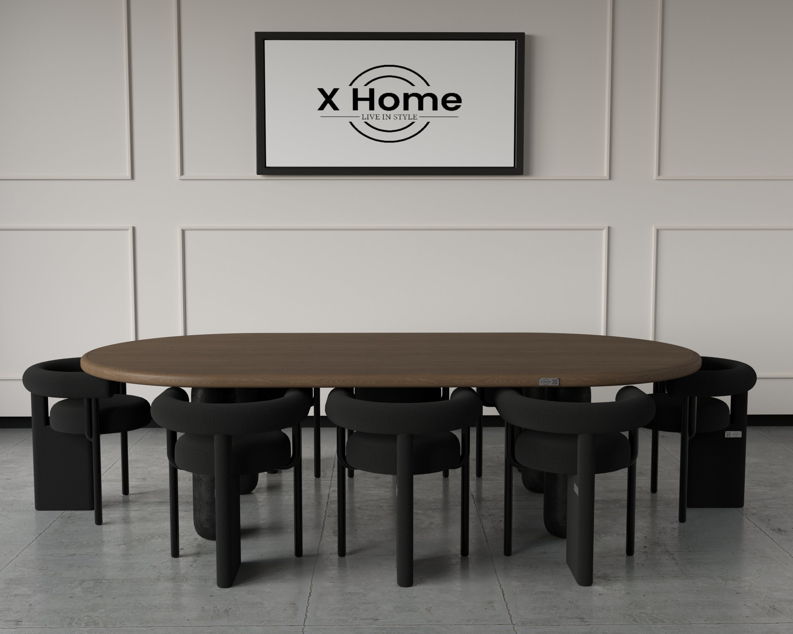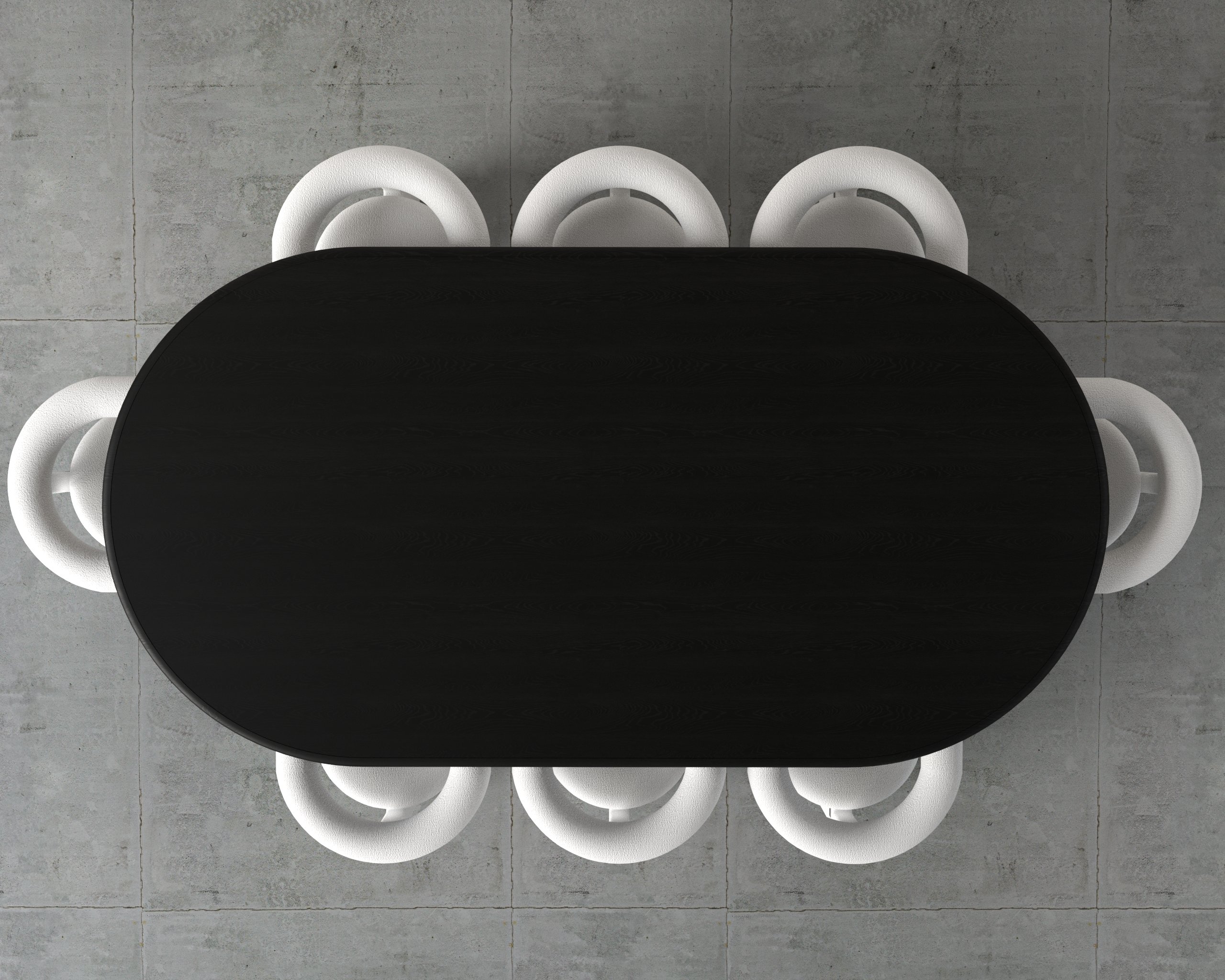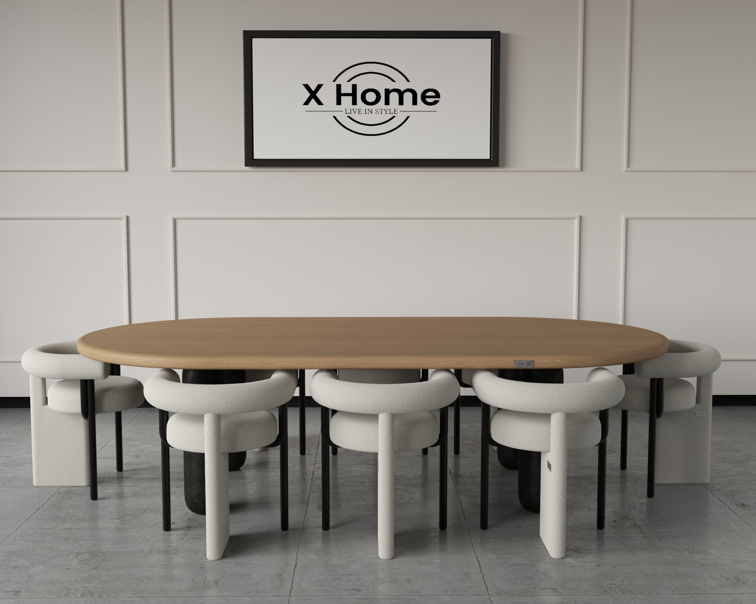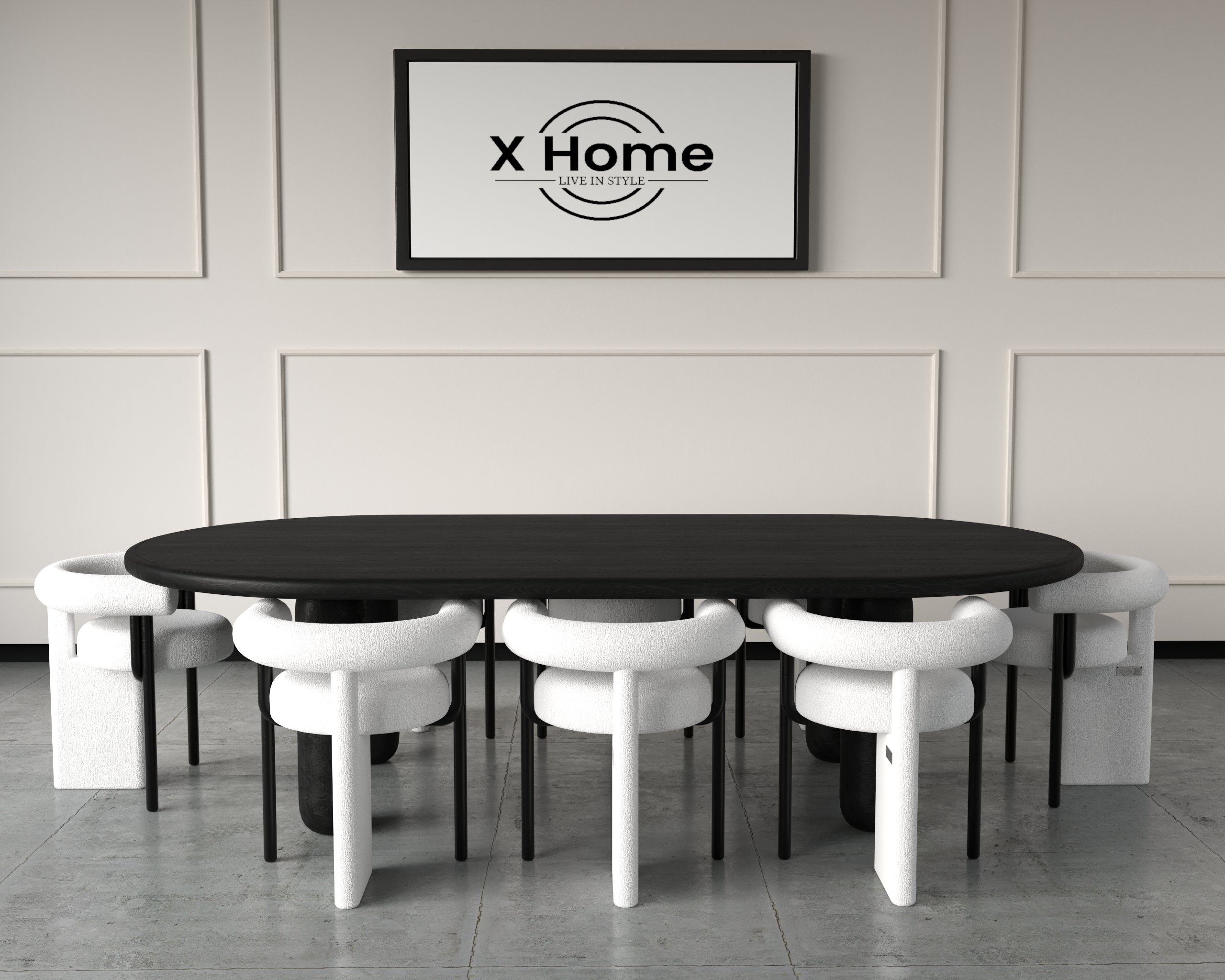 The Eclipse Chair Dining Set features an expansive oval table supported by cylindrical pillar legs, paired with uniquely sculpted boucle chairs that offer both comfort and visual appeal. The combination of solid craftsmanship and soft rounded forms creates a refined yet bold dining atmosphere. Ideal for modern homes and interiors seeking statement-making furniture.