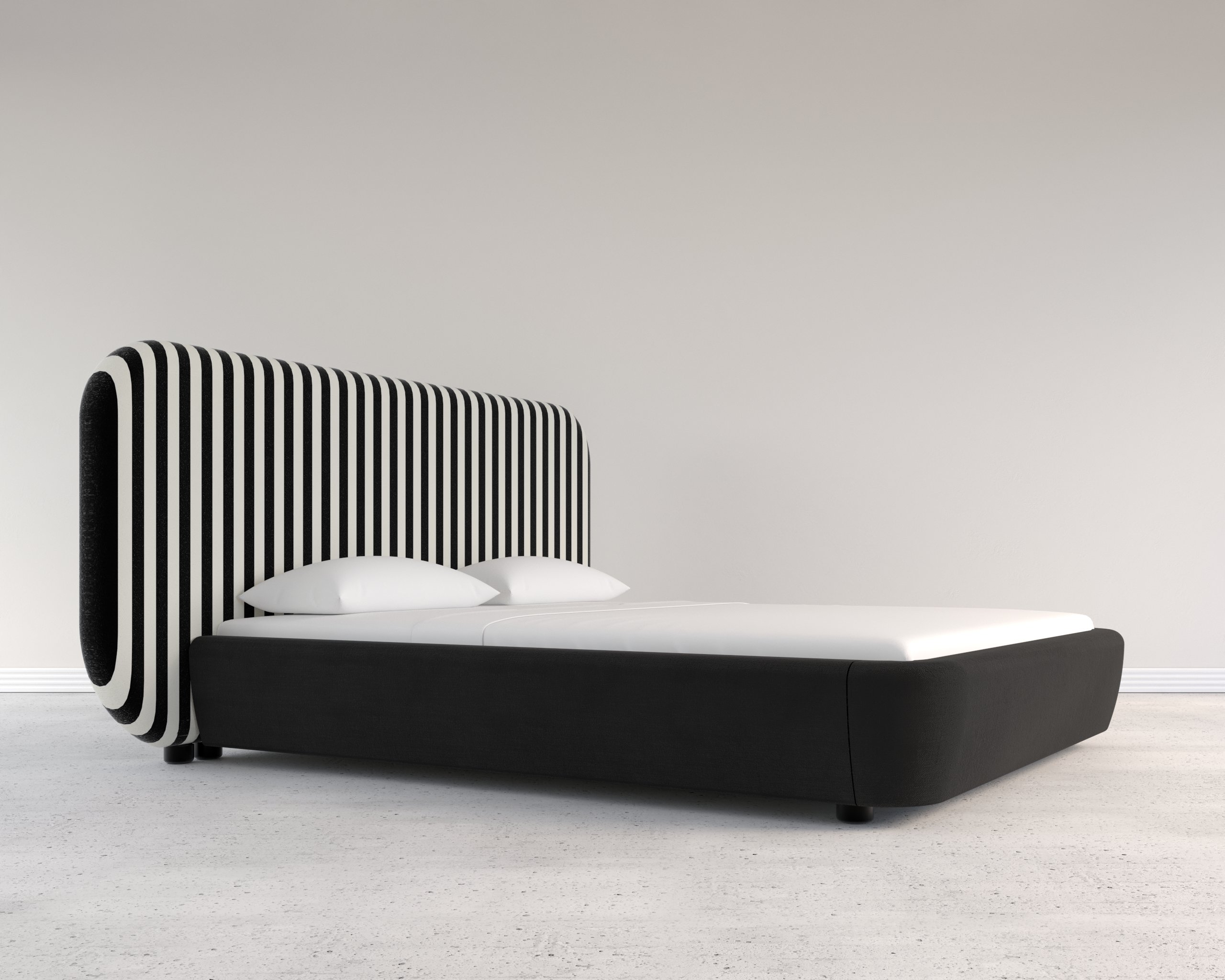 “The Harmony Bed is a confident expression of bold design principles fused with comfort. Its defining element, a towering upholstered headboard in alternating vertical stripes, introduces graphic rhythm and architectural flair. The curves soften its scale, creating a gentle silhouette even within a high-contrast palette.