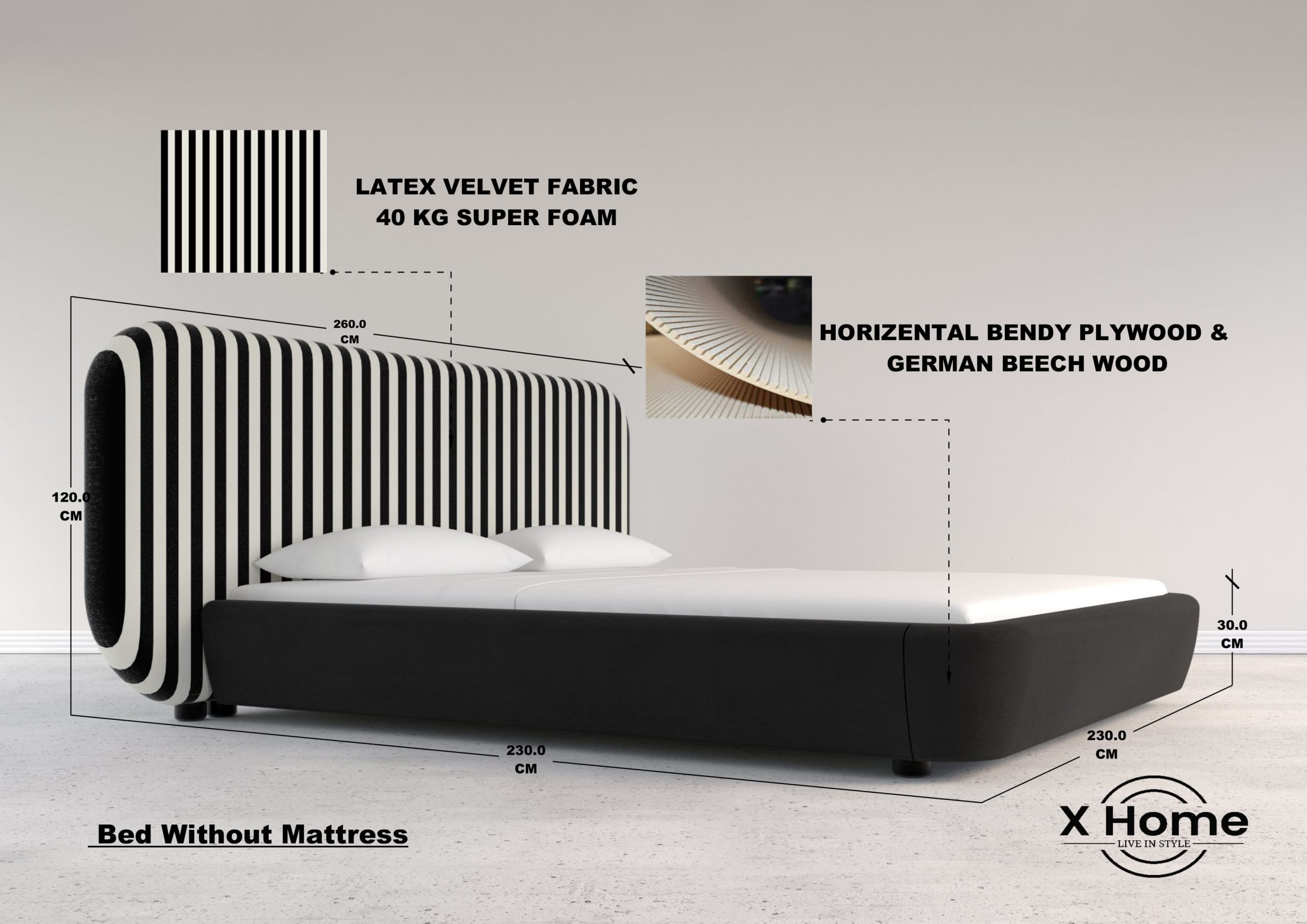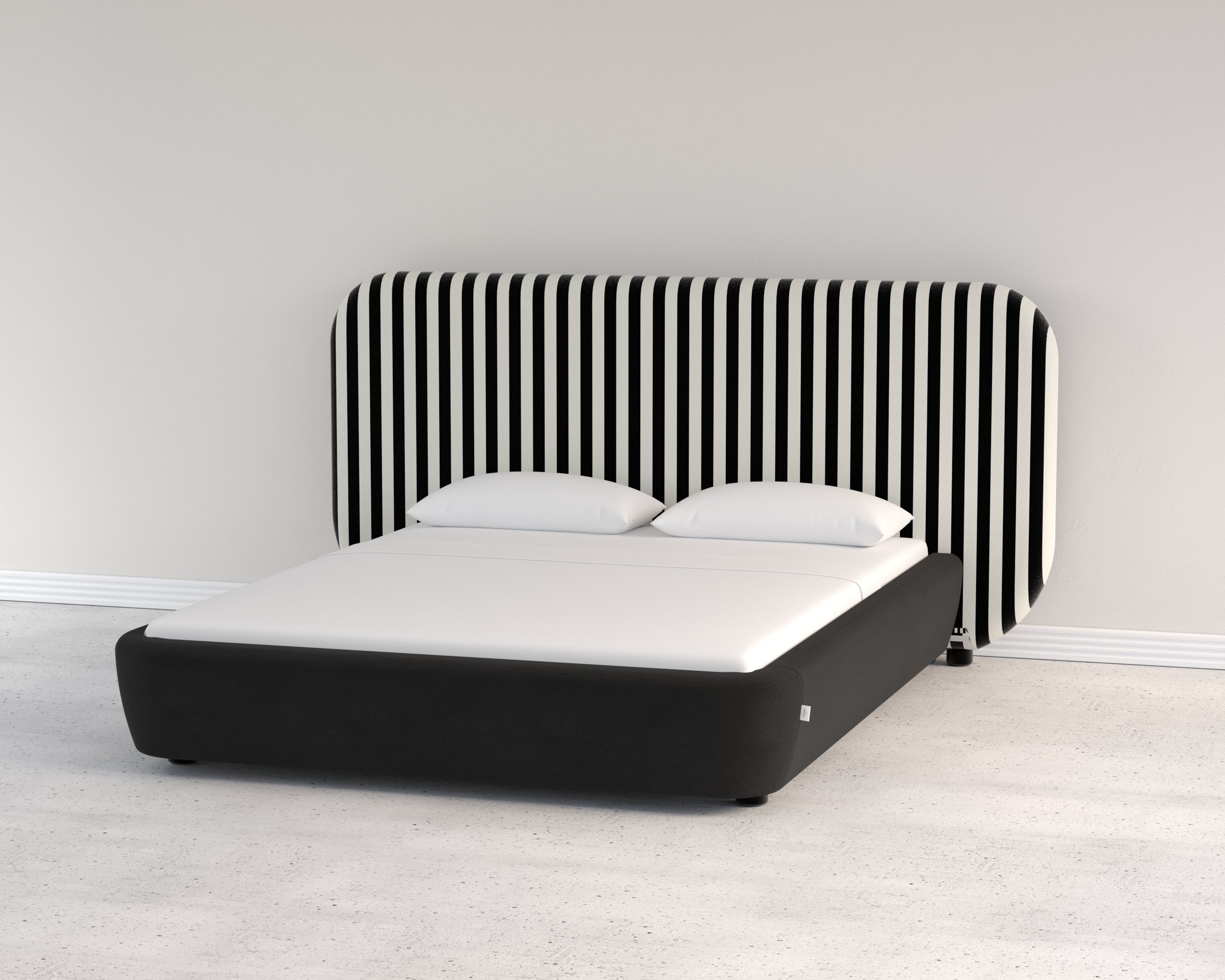 The platform base, measuring 230 cm x 230 cm, is upholstered in a plush black fabric that grounds the composition, offering a quiet contrast to the energetic headboard. With a 30 cm base height and 120 cm headboard, Harmony becomes an instant focal point in the bedroom — modern, sculptural, and refined.