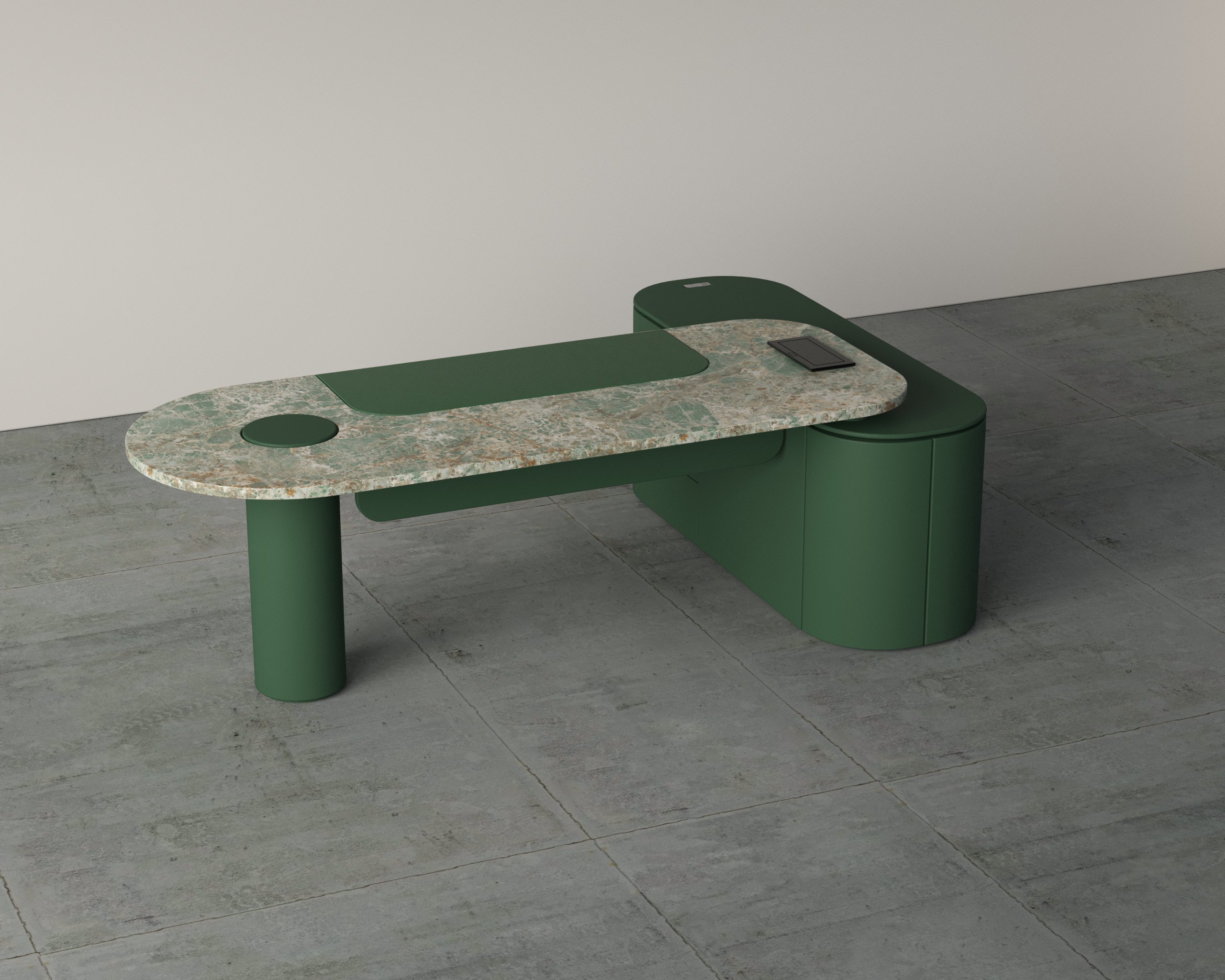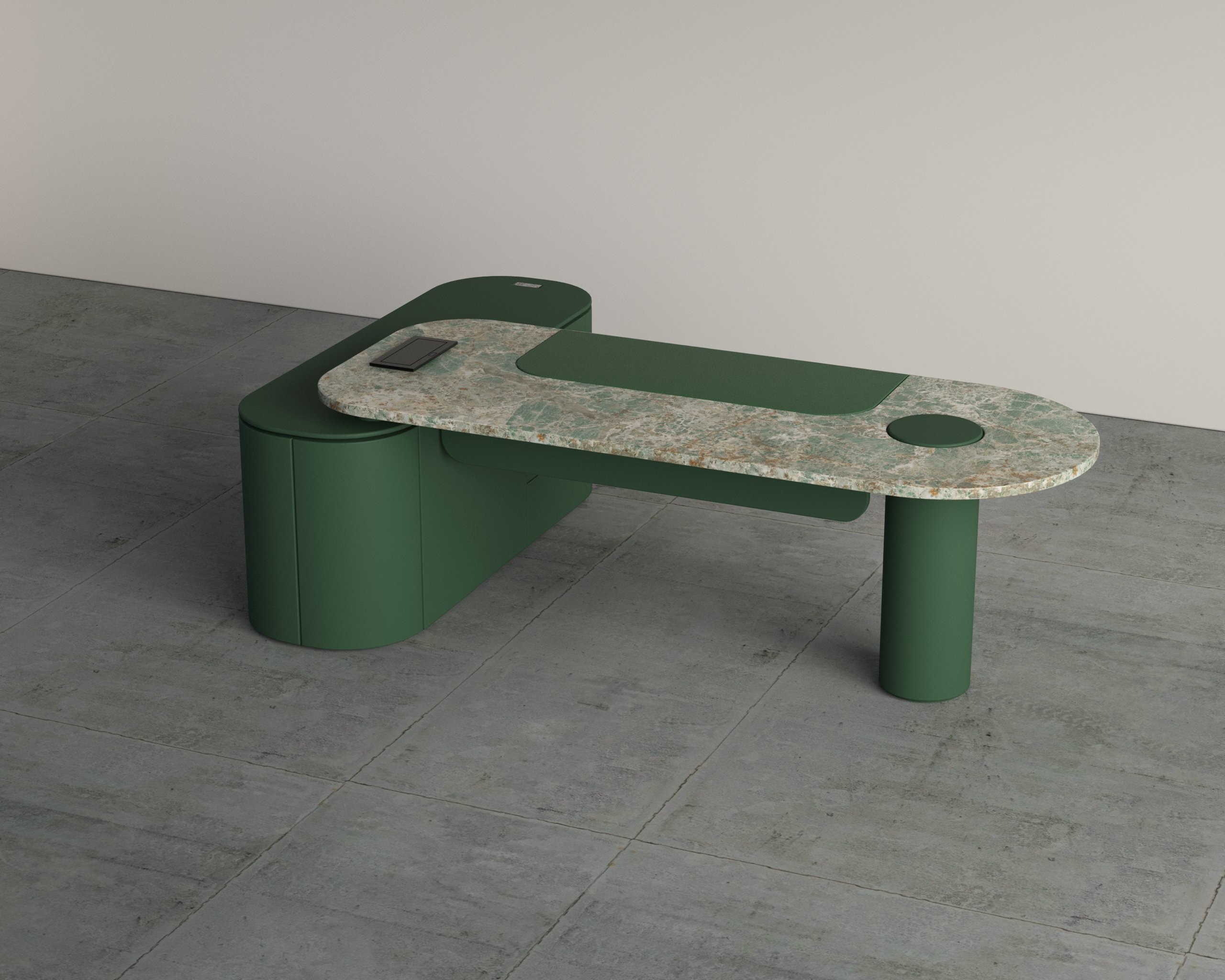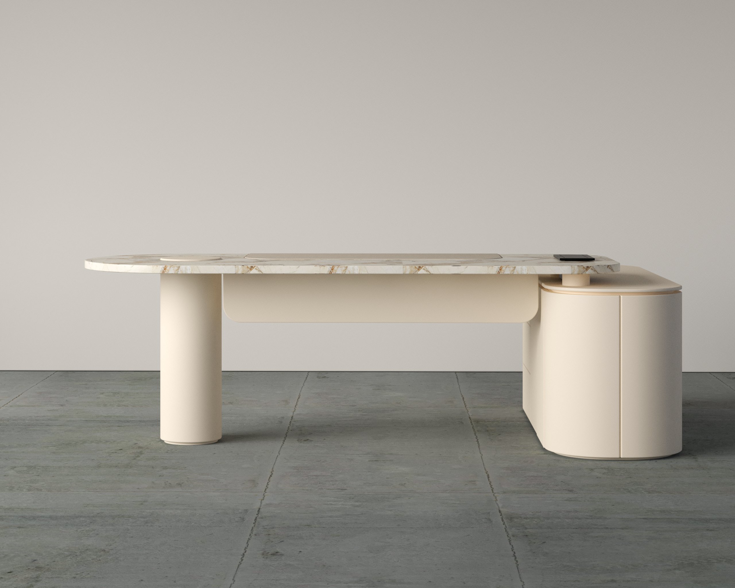 - Sculptural desk design with integrated side storage
