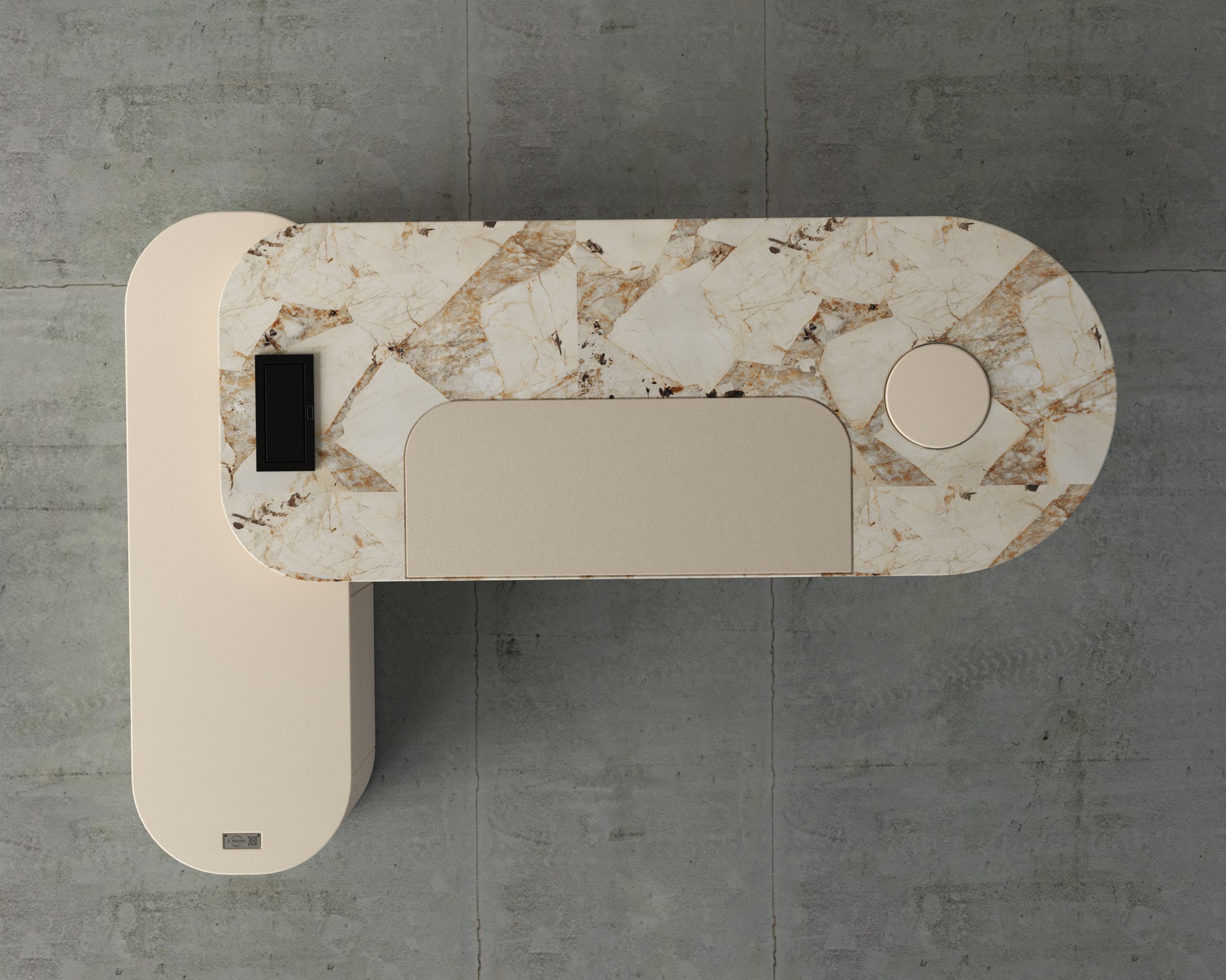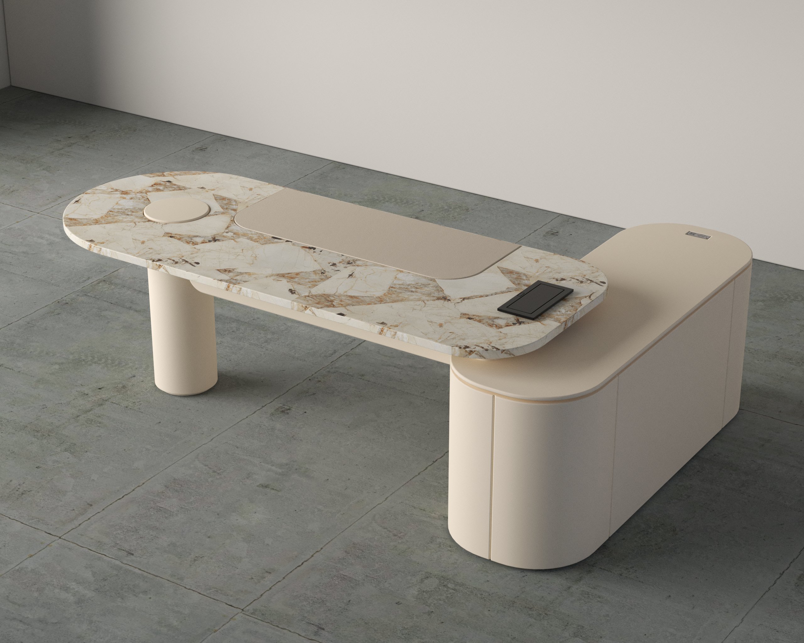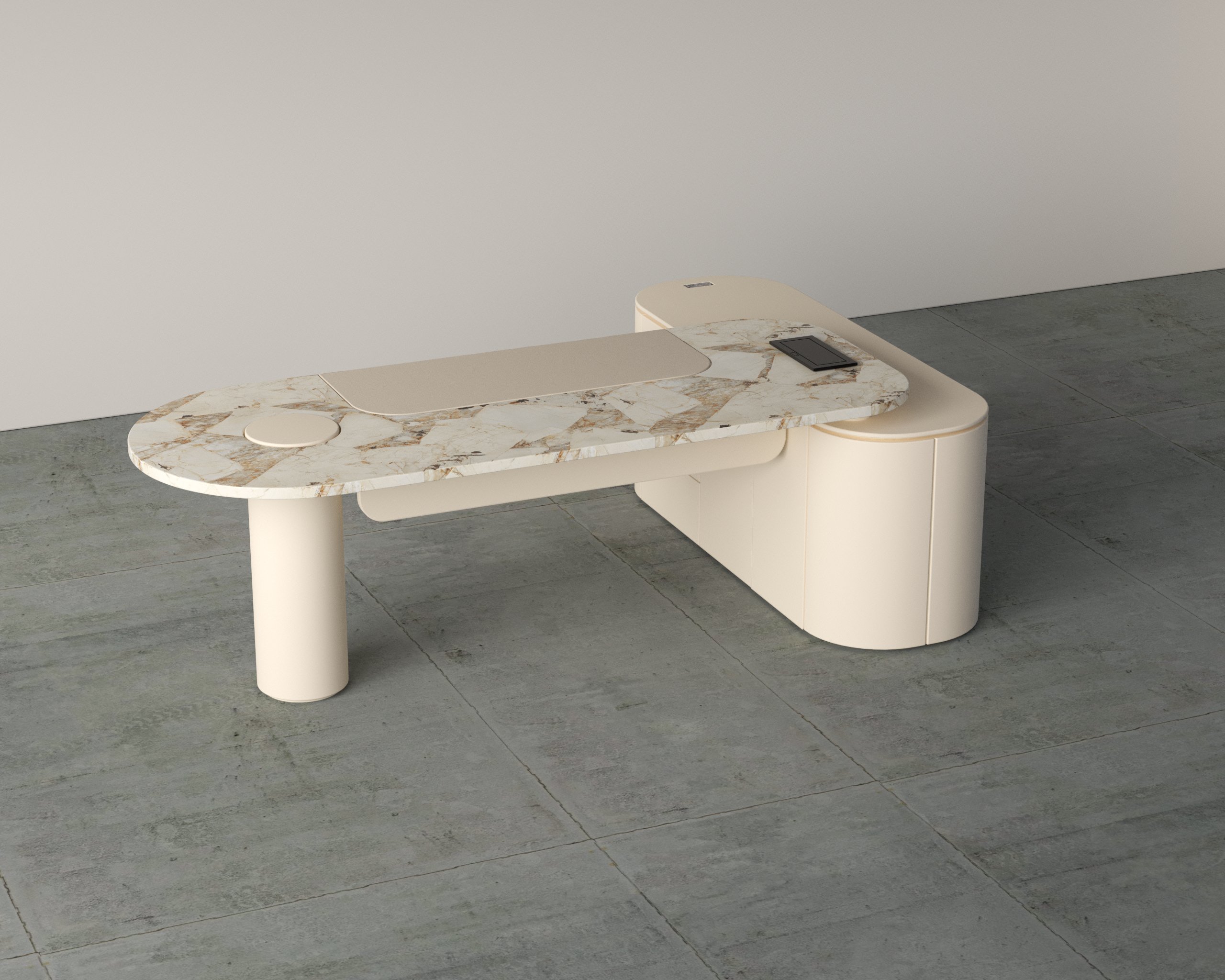 The Icon Desk with marble top finish presents a sculptural executive workspace with a strong architectural presence and refined detailing. Designed to balance elegance and functionality, it integrates storage and modern conveniences seamlessly.