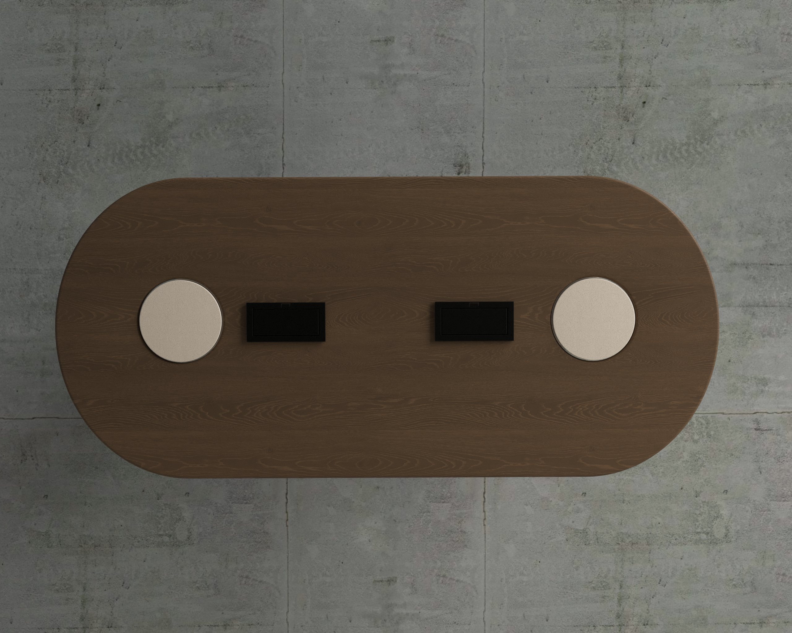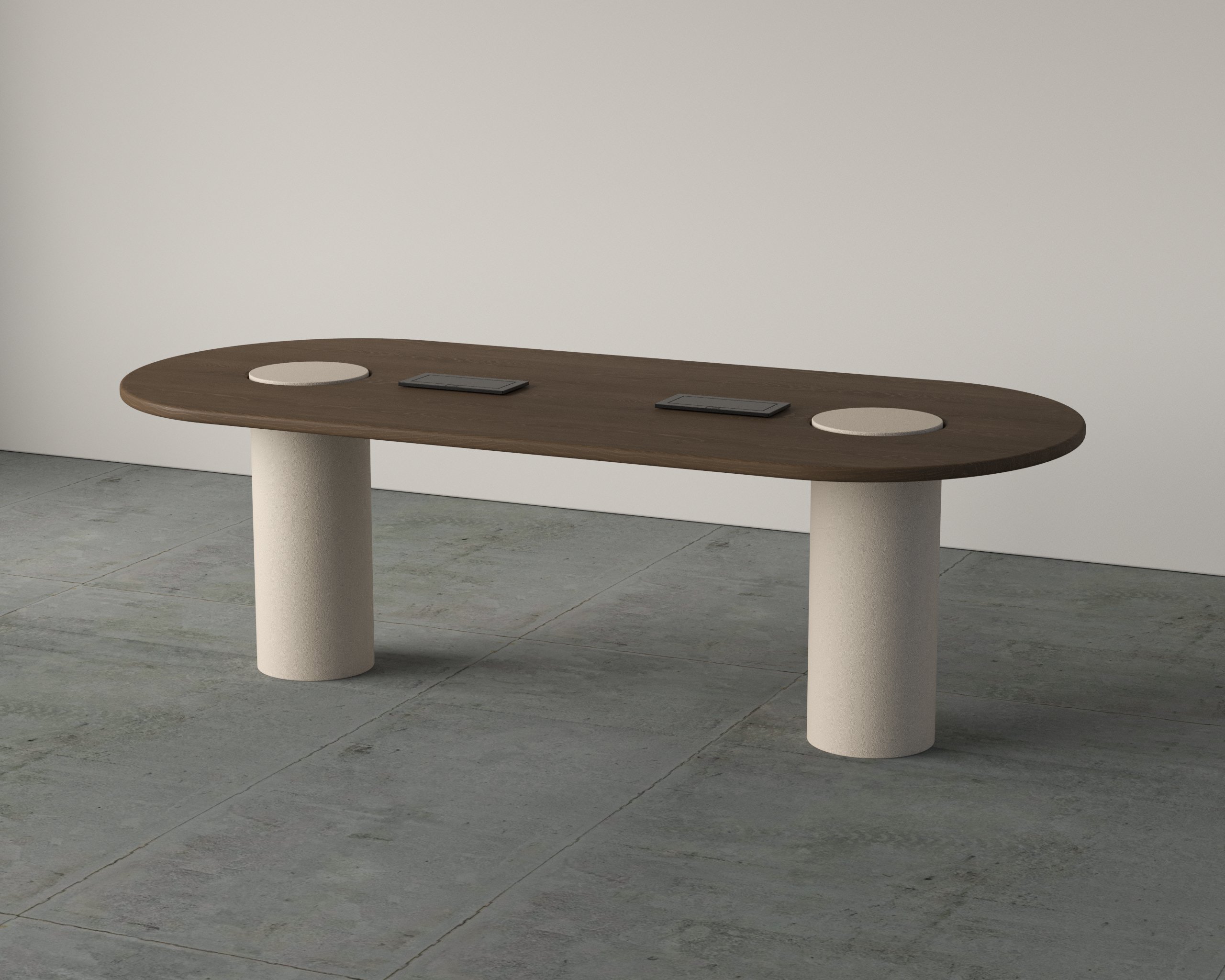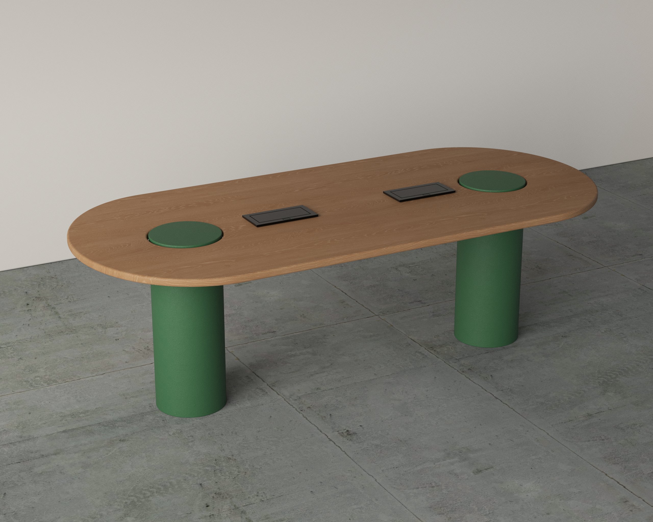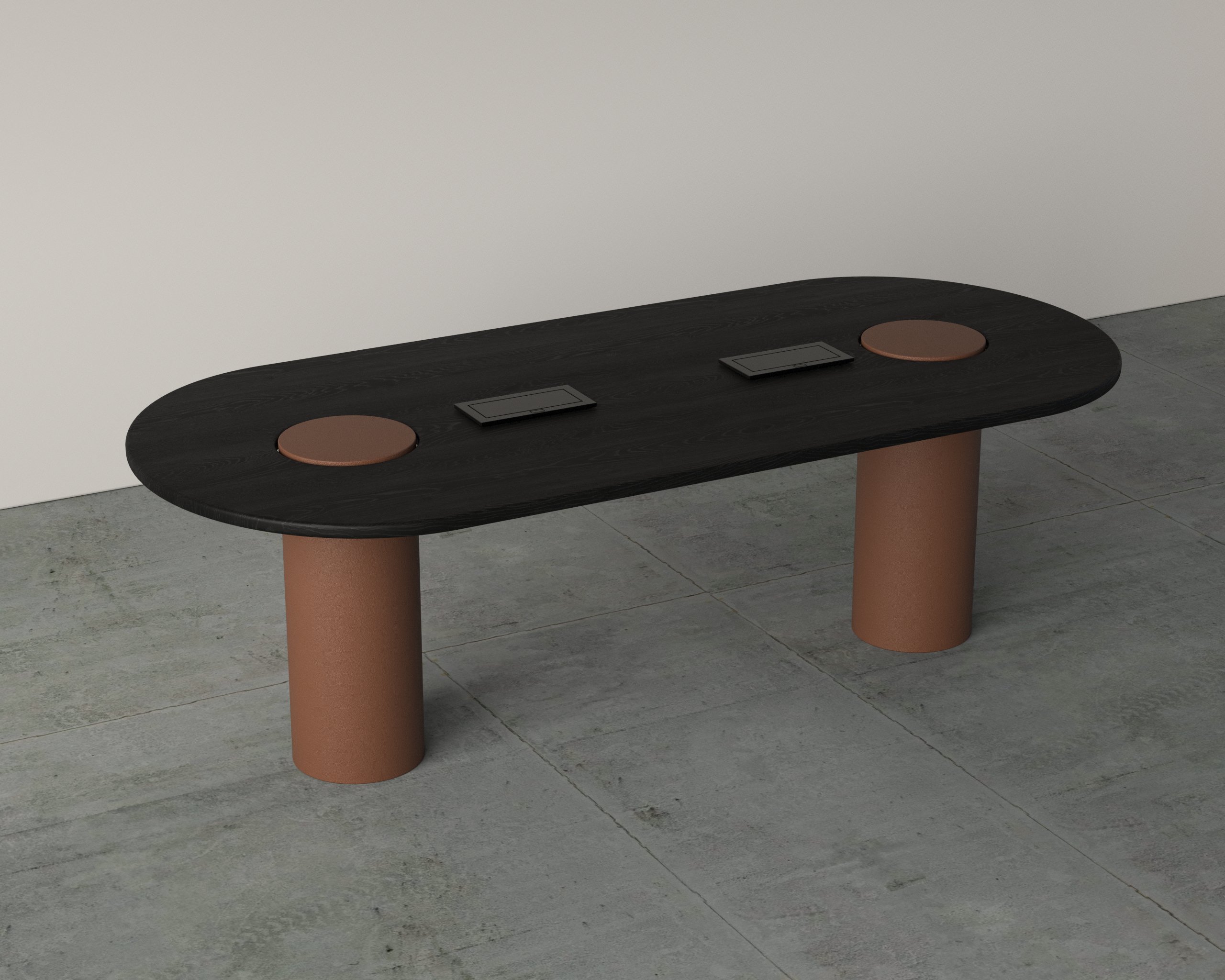 The Icon Meeting Table showcases a sculptural form enhanced with refined leather detailing.