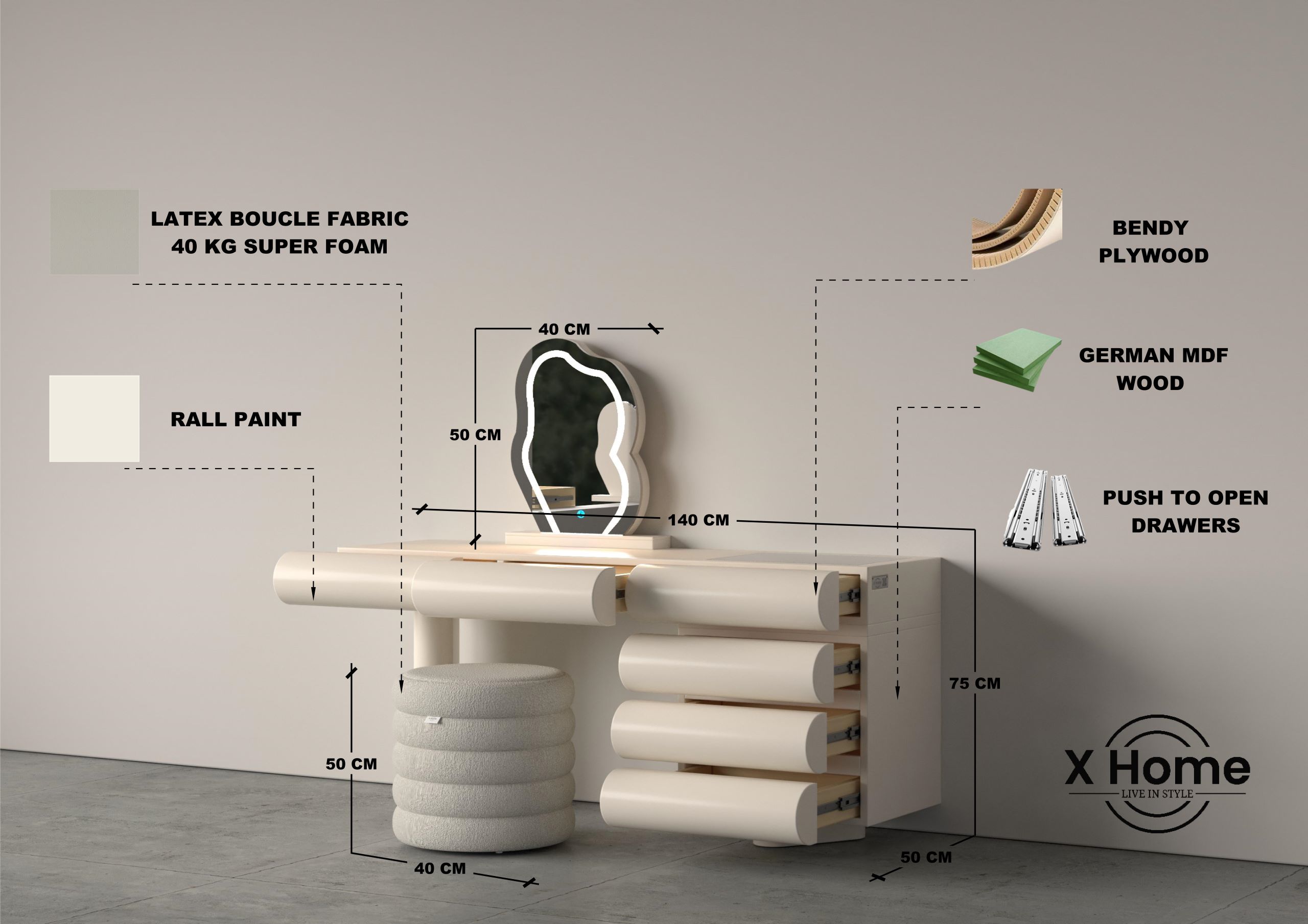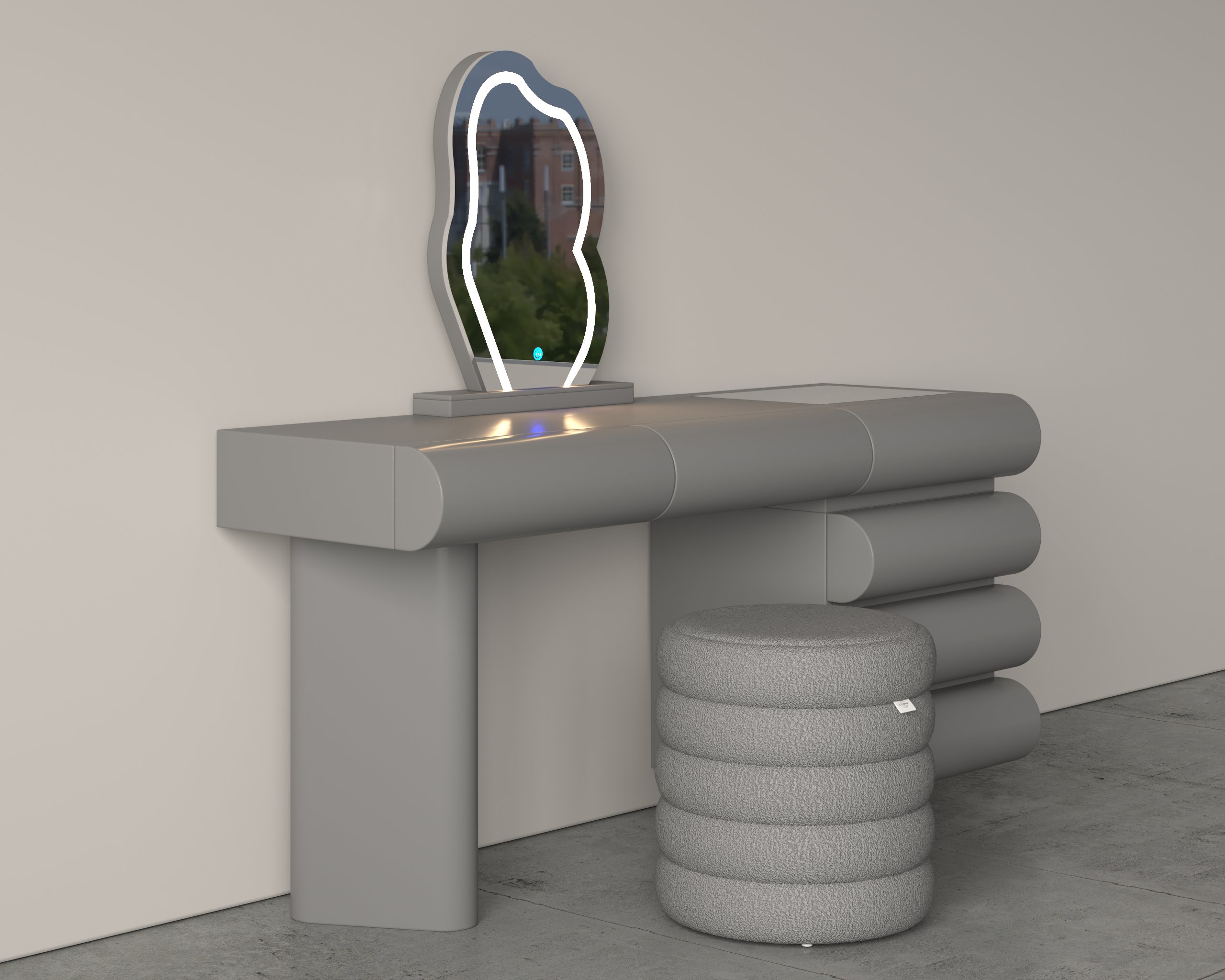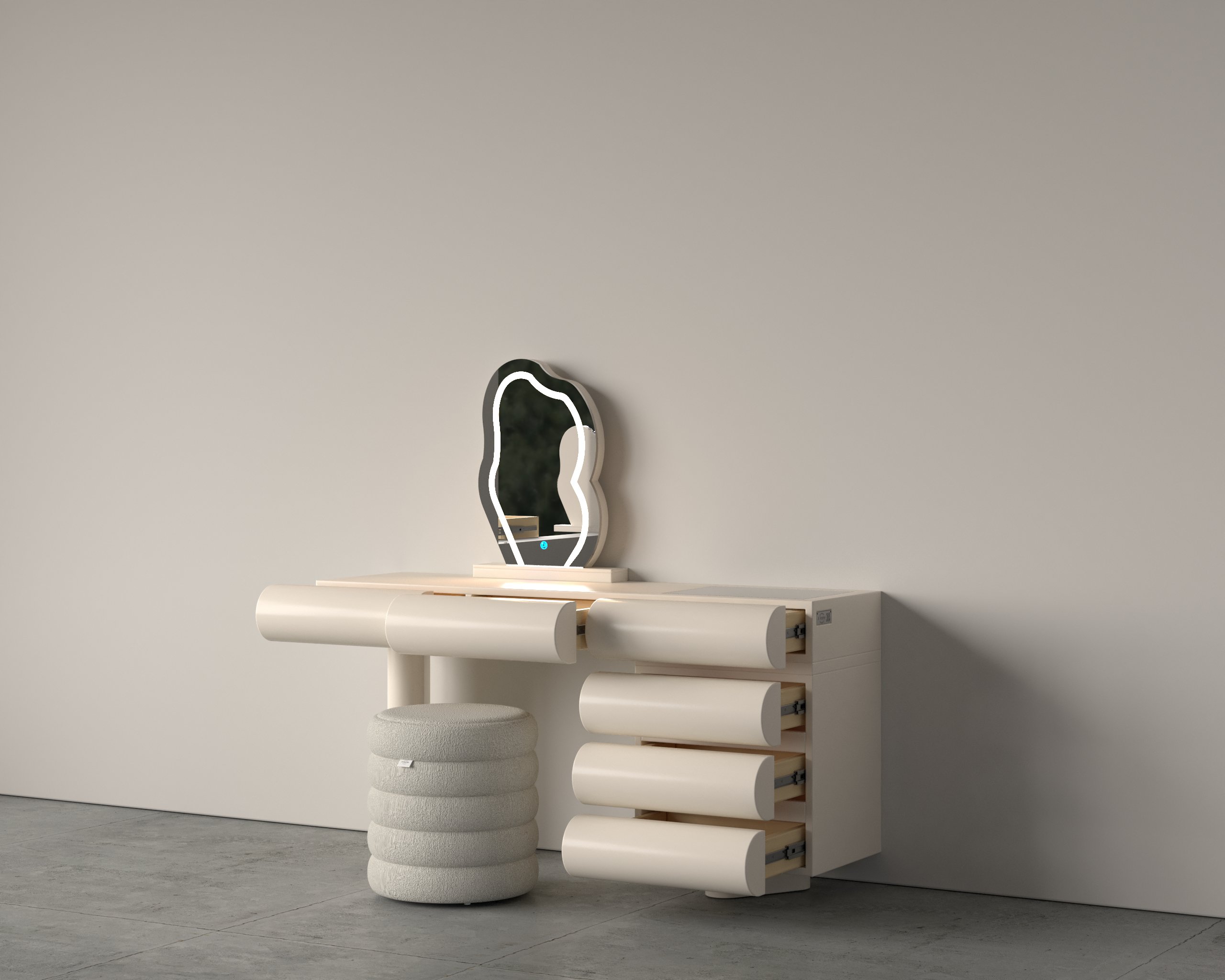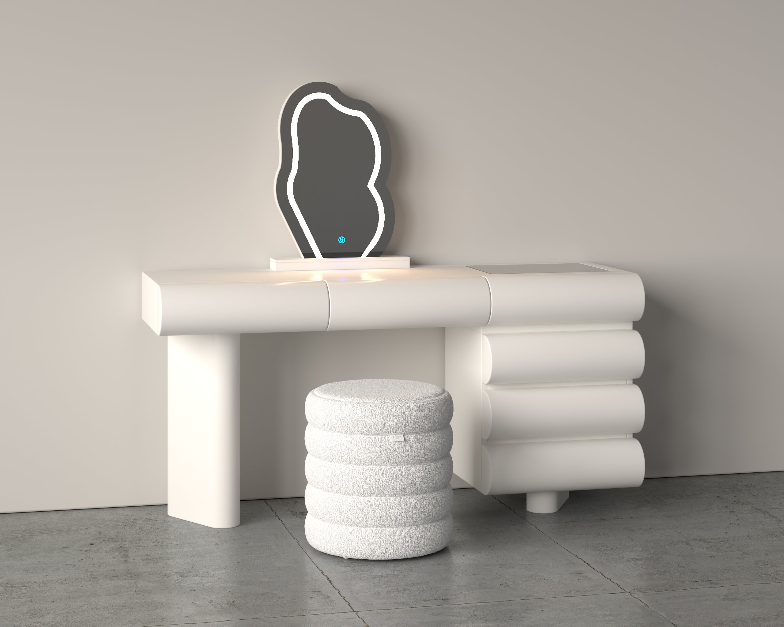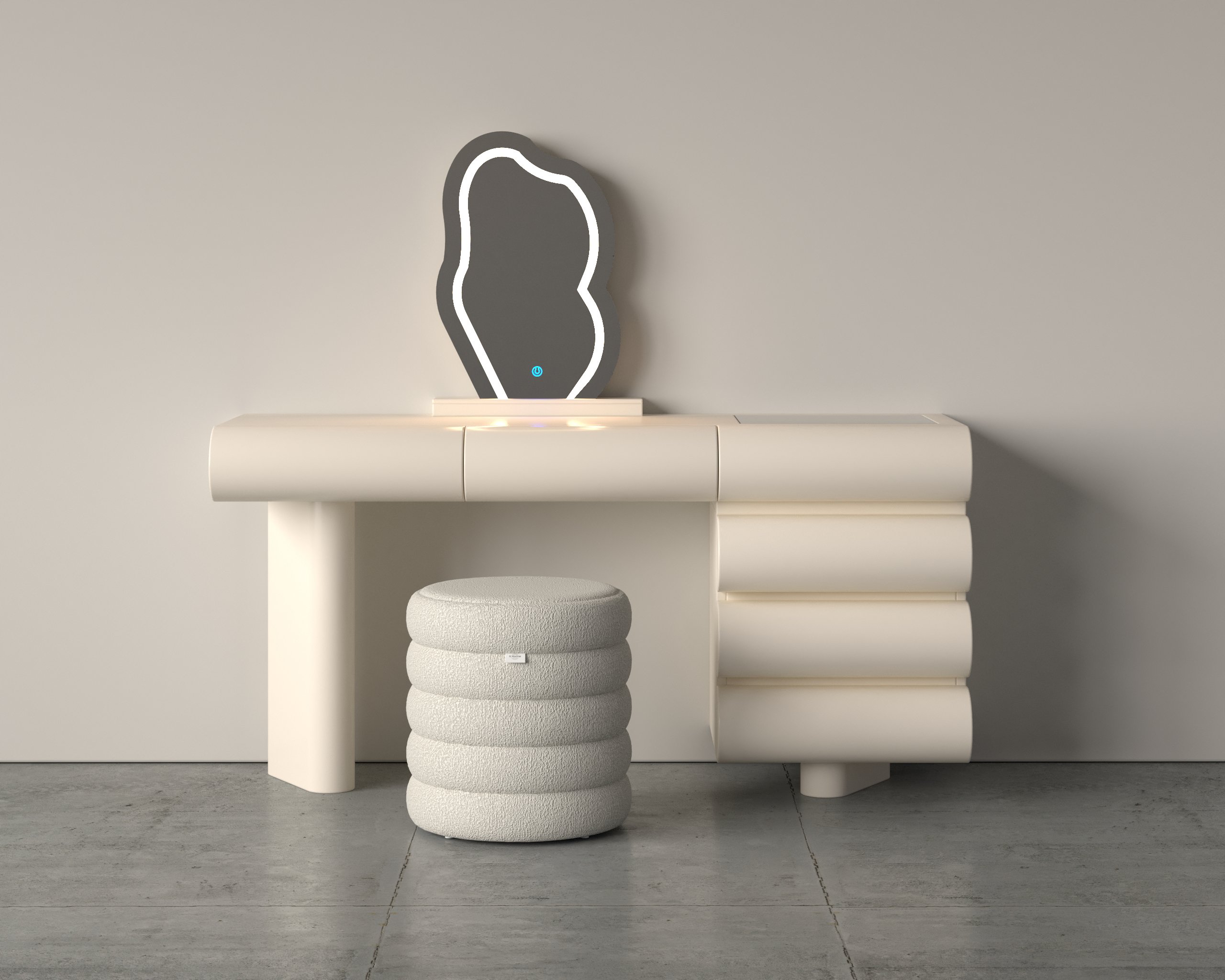 The Isola Vanity Set unites sculptural design with refined functionality. Centered around the graceful Isola Vanity, it features a uniquely shaped LED mirror that offers soft illumination and artistic character. The boucle stool adds comfort and texture, completing the ensemble with warmth and balance. Designed for modern living, this set transforms everyday rituals into a moment of calm sophistication and timeless style.
