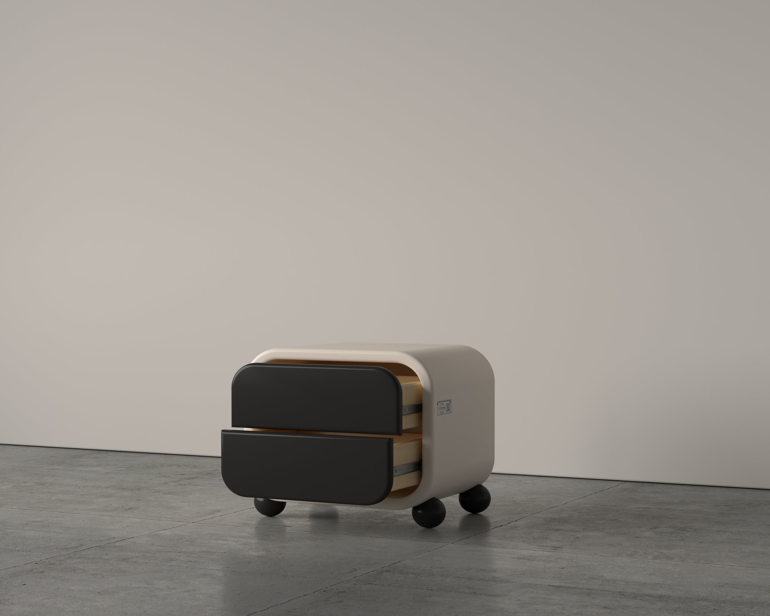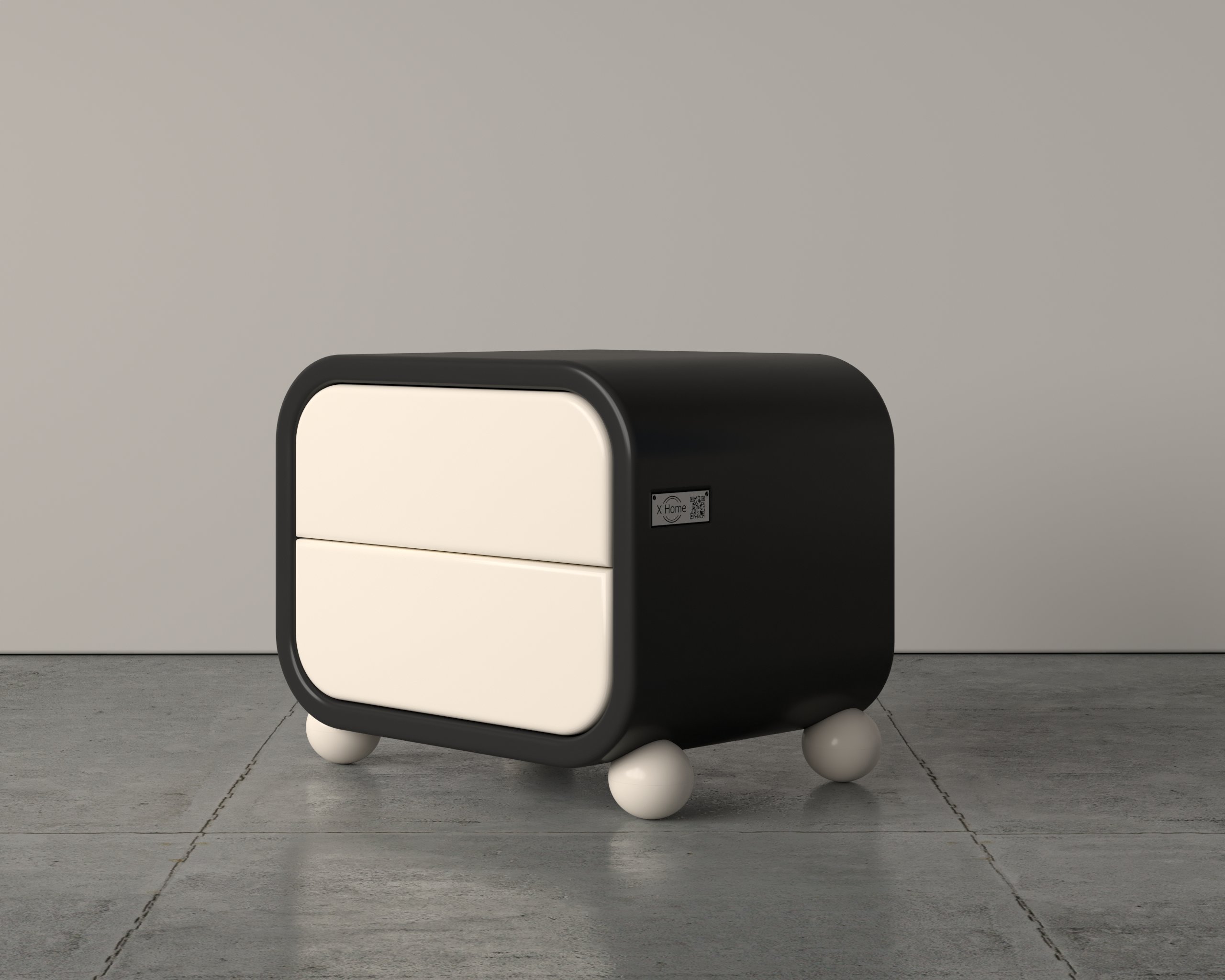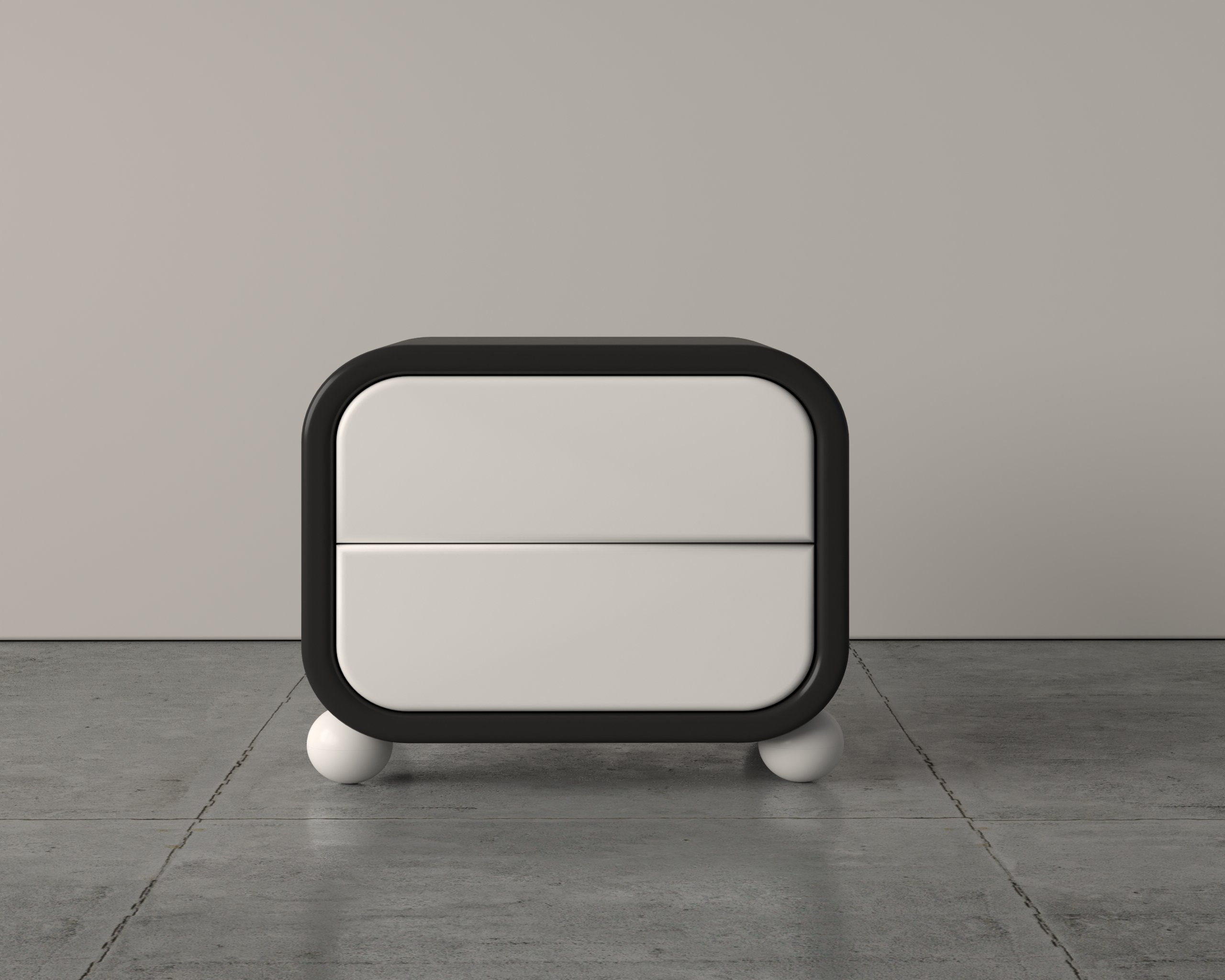 The Livia Bedside Table brings a spirited touch to modern bedrooms. Its black matte body features two soft beige drawers, framed by rounded corners and sculpted edges. Resting on four spherical white legs, it creates a sense of elevation and whimsy while remaining functional. With two roomy drawers and a compact footprint, Livia merges personality with everyday storage — perfect for bold minimalists, design lovers, or stylish kids’ spaces.