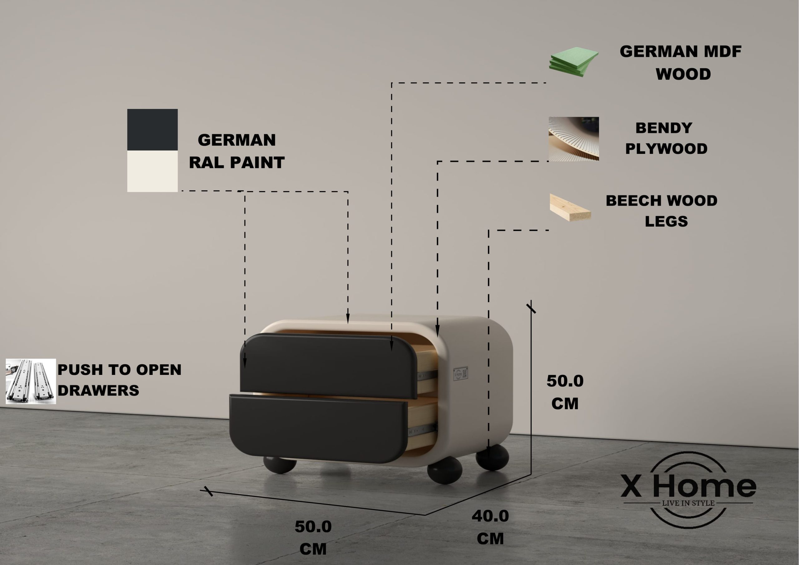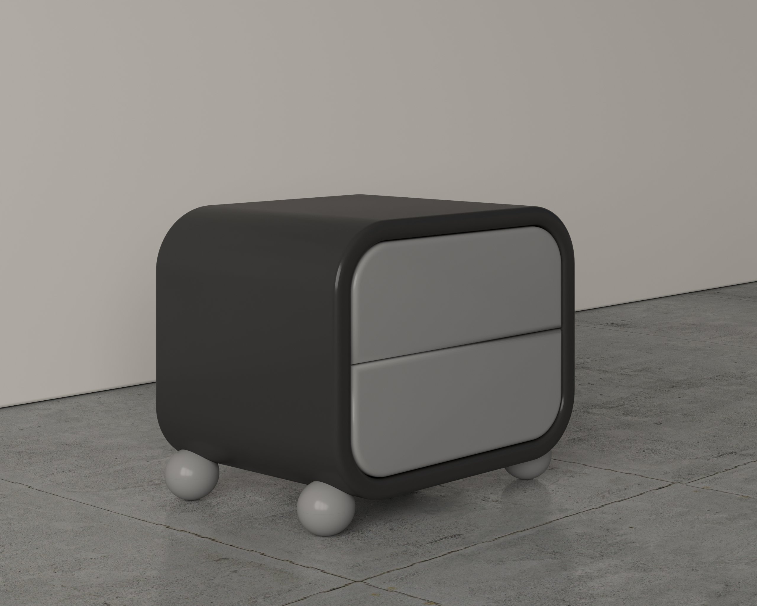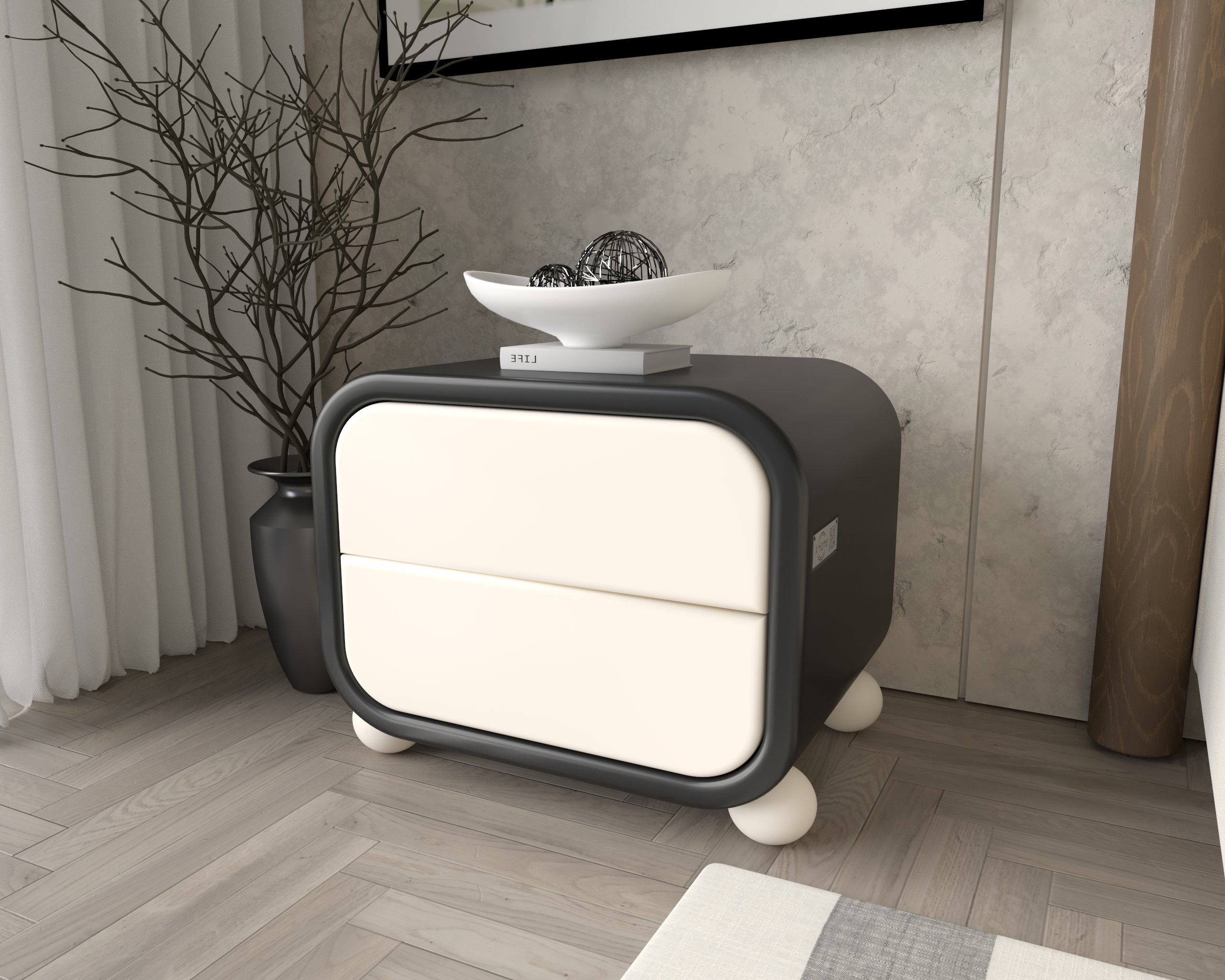 The Livia Bedside Table brings a spirited touch to modern bedrooms. Its black matte body features two soft beige drawers, framed by rounded corners and sculpted edges. Resting on four spherical white legs, it creates a sense of elevation and whimsy while remaining functional. With two roomy drawers and a compact footprint, Livia merges personality with everyday storage — perfect for bold minimalists, design lovers, or stylish kids’ spaces.