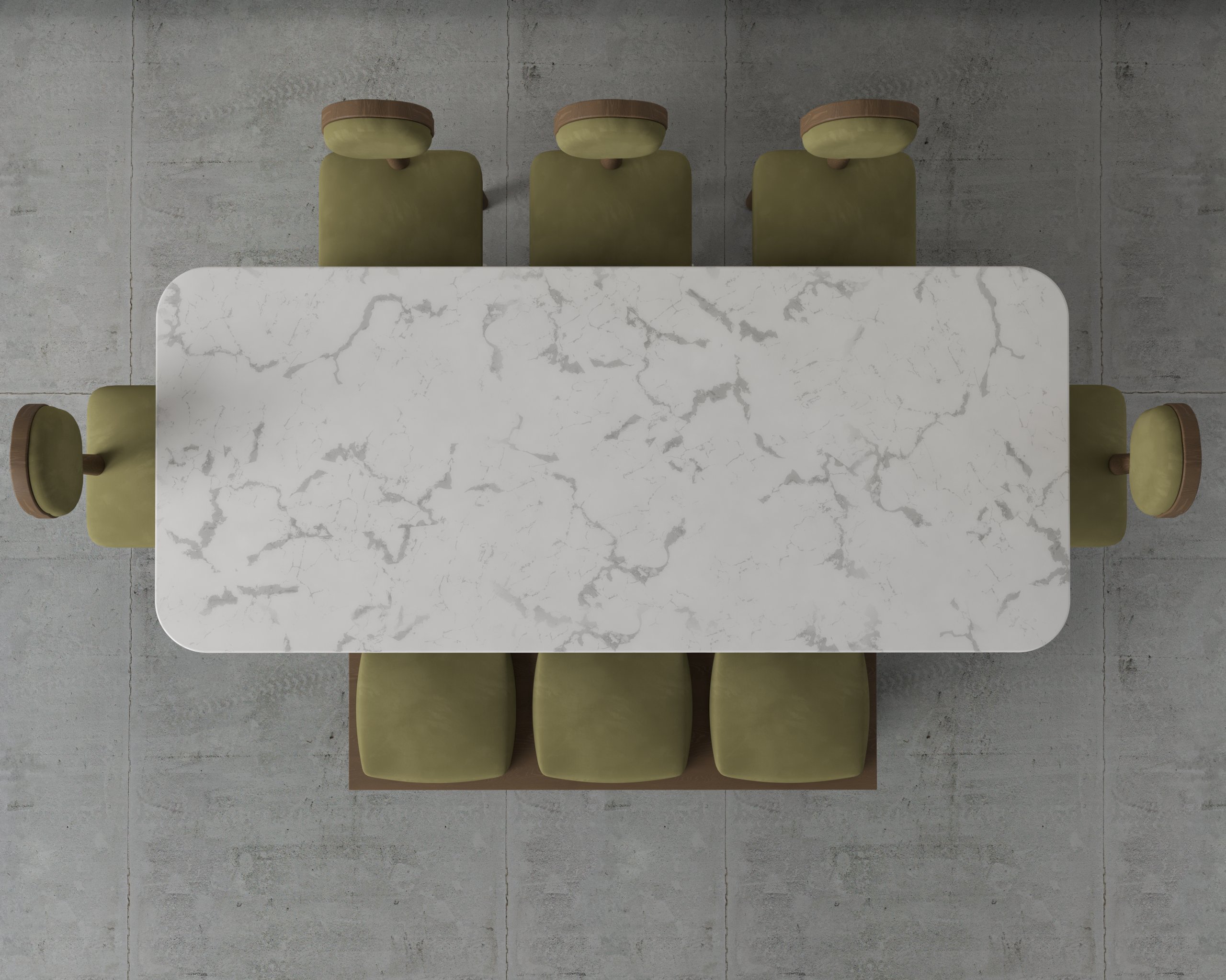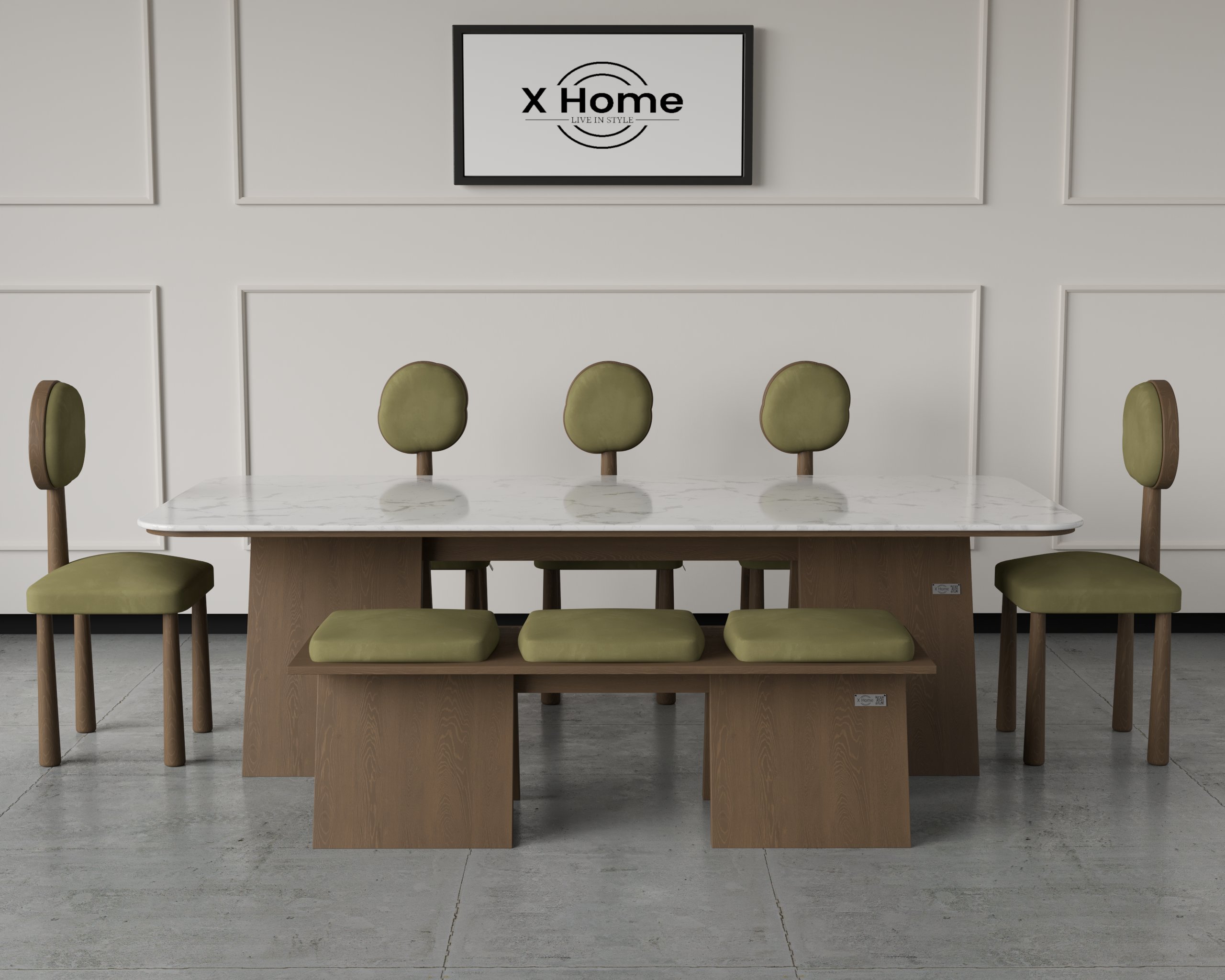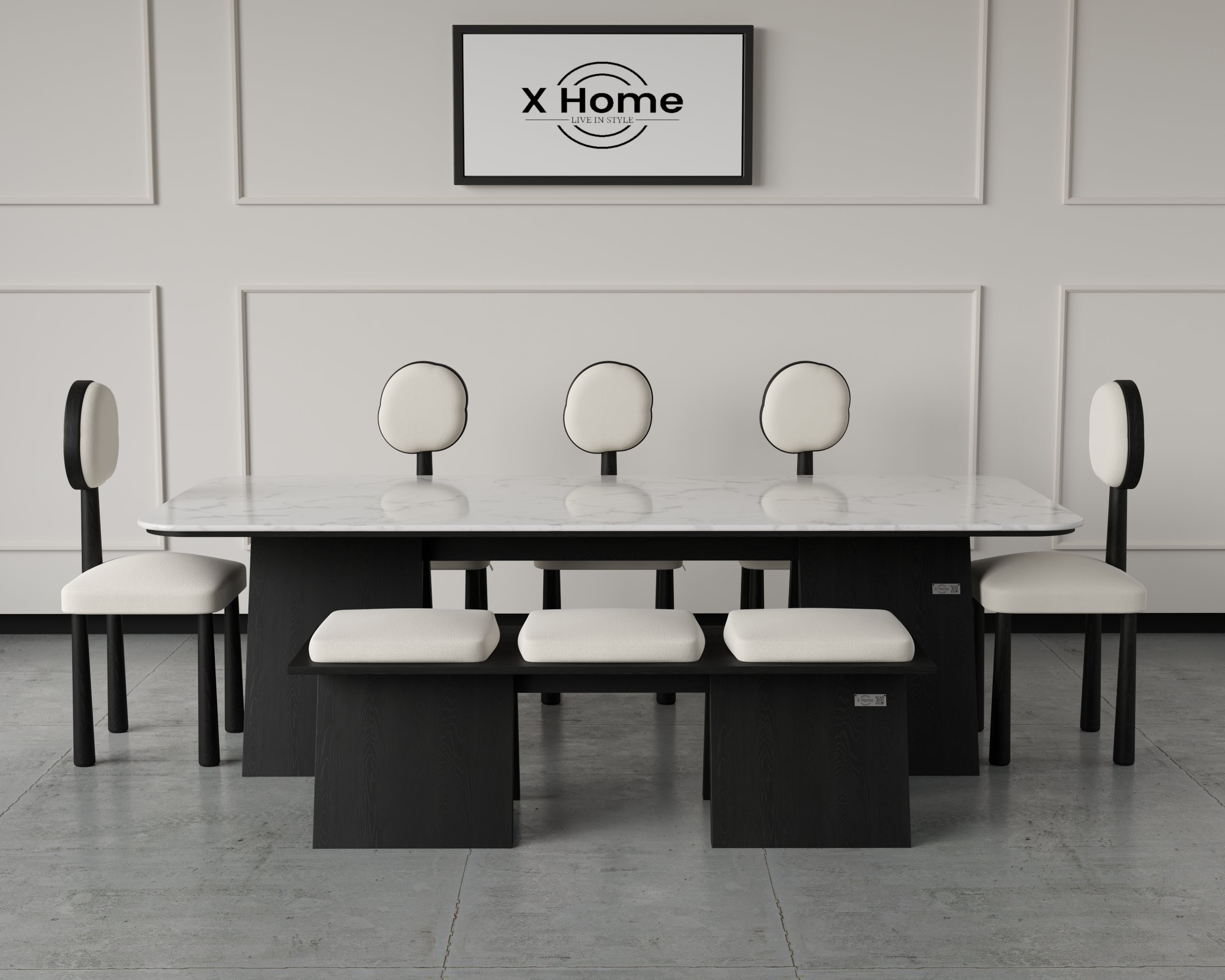 The Livius Dining Set pairs a sculpted marble-top table with rounded-back chairs for a refined, modern dining experience.