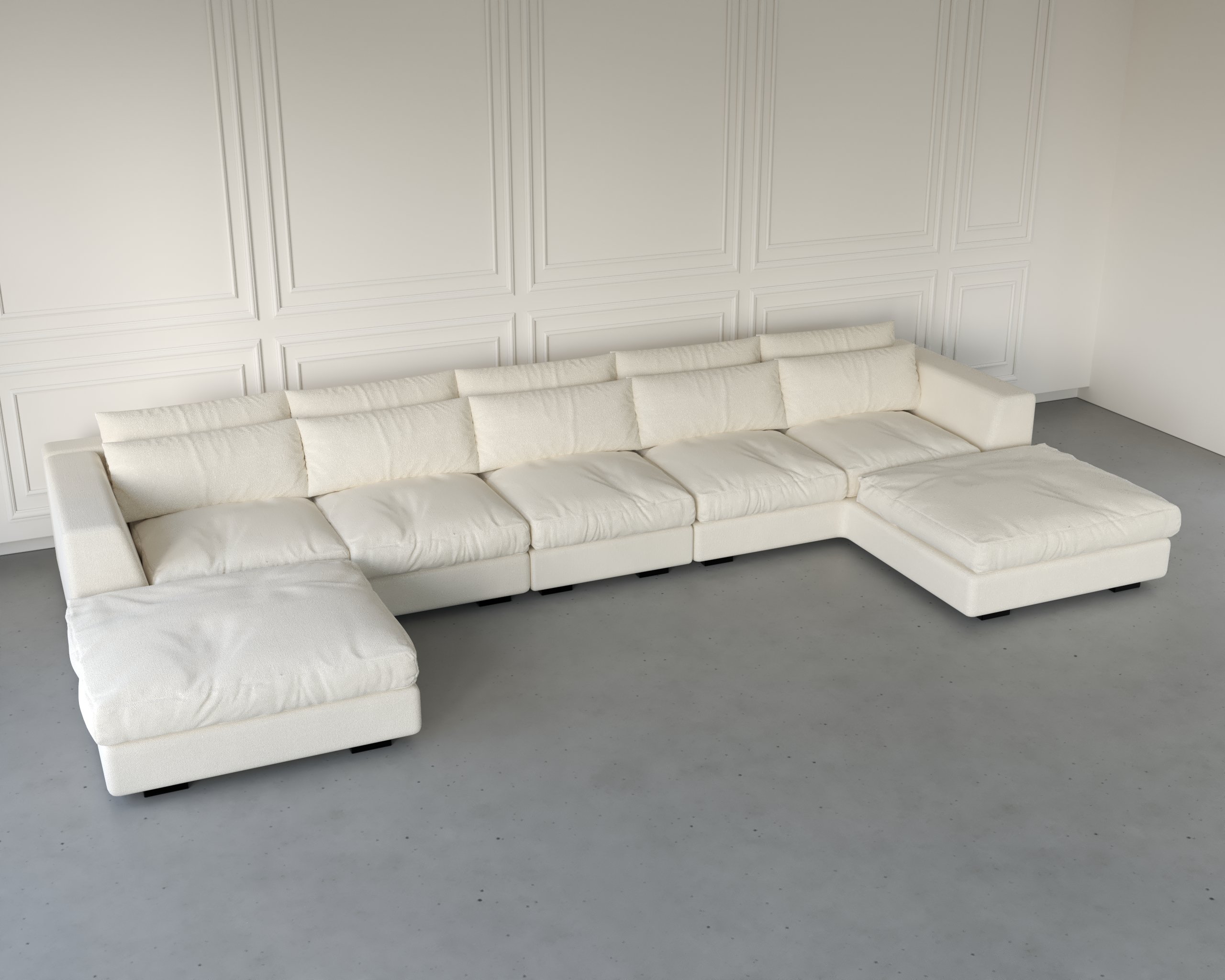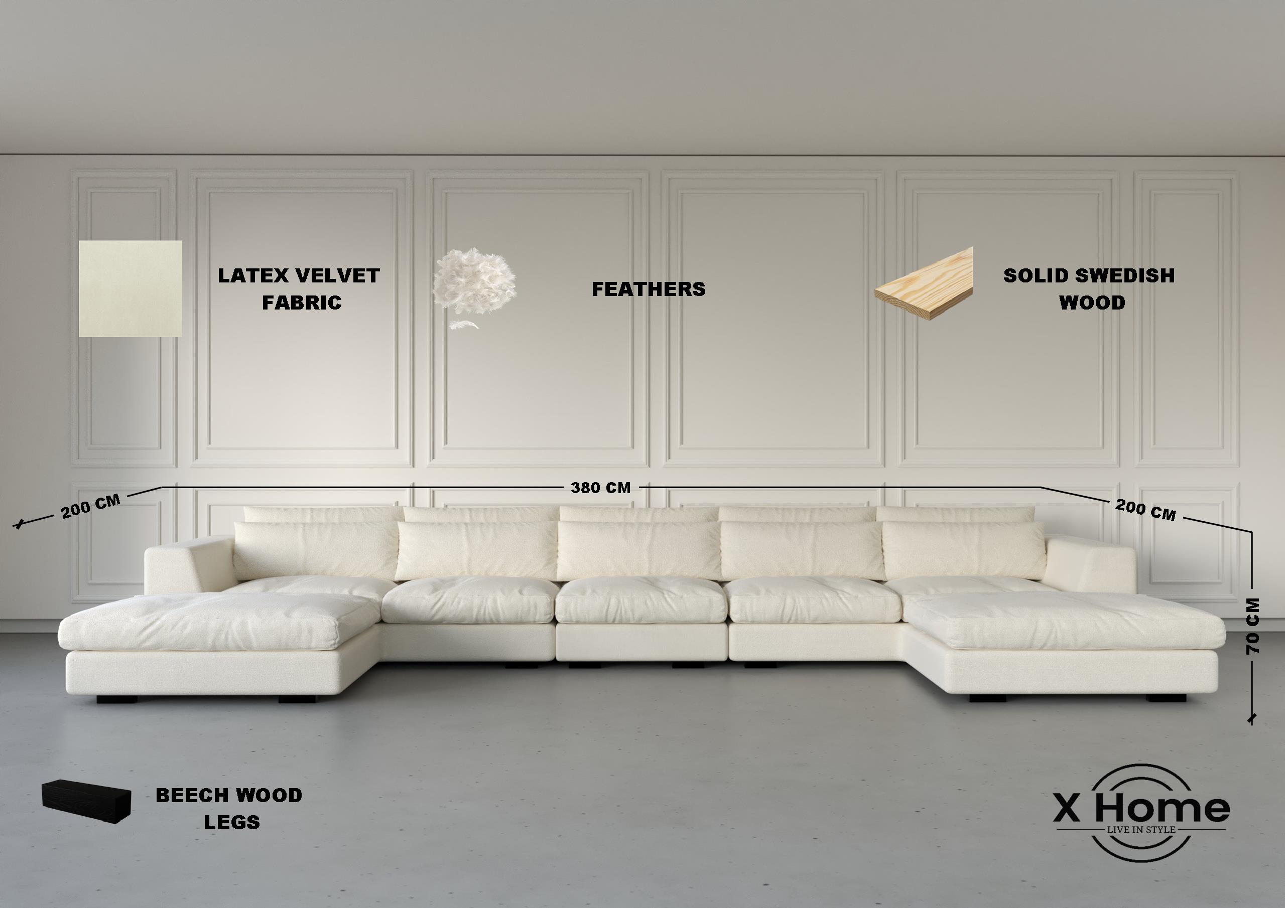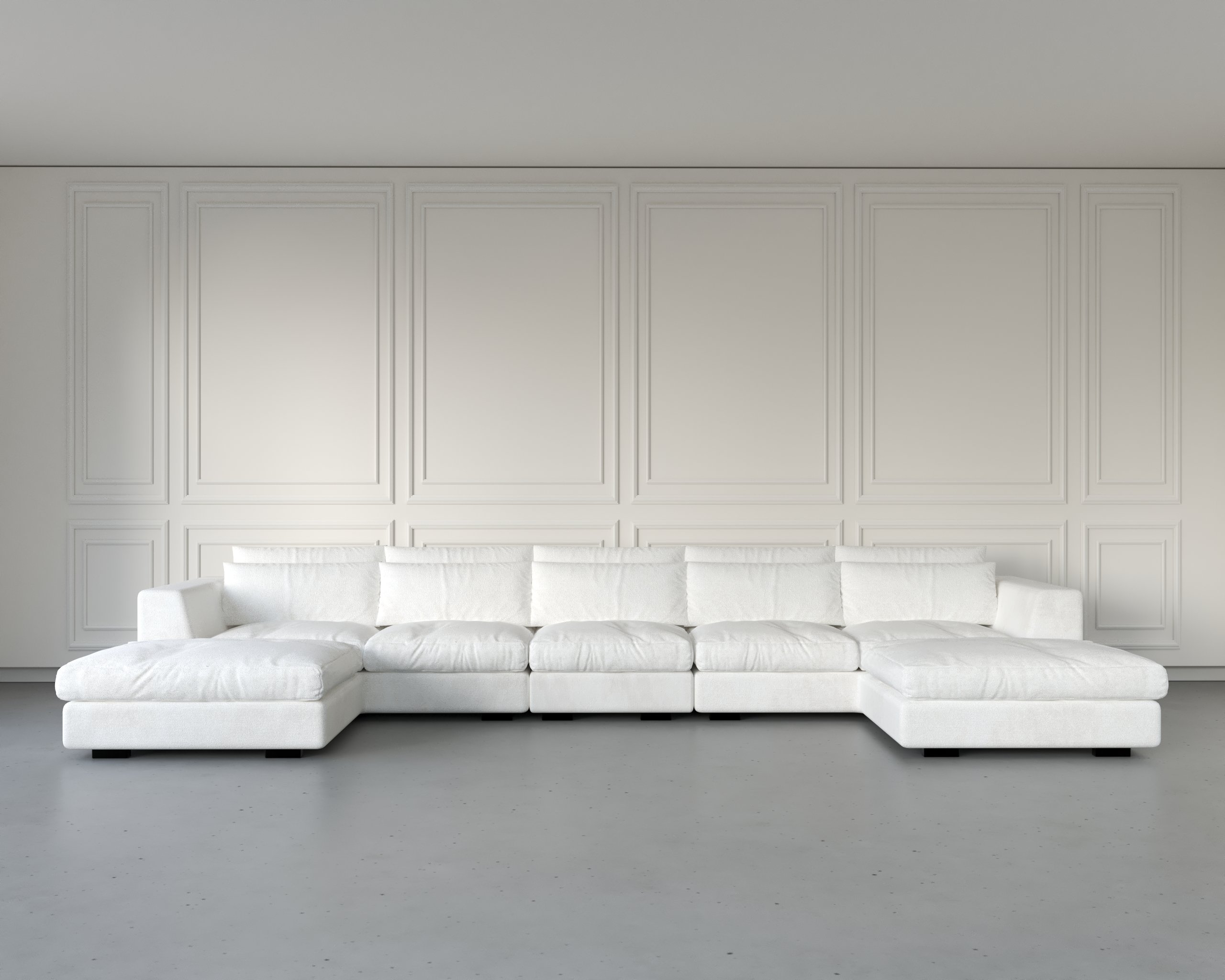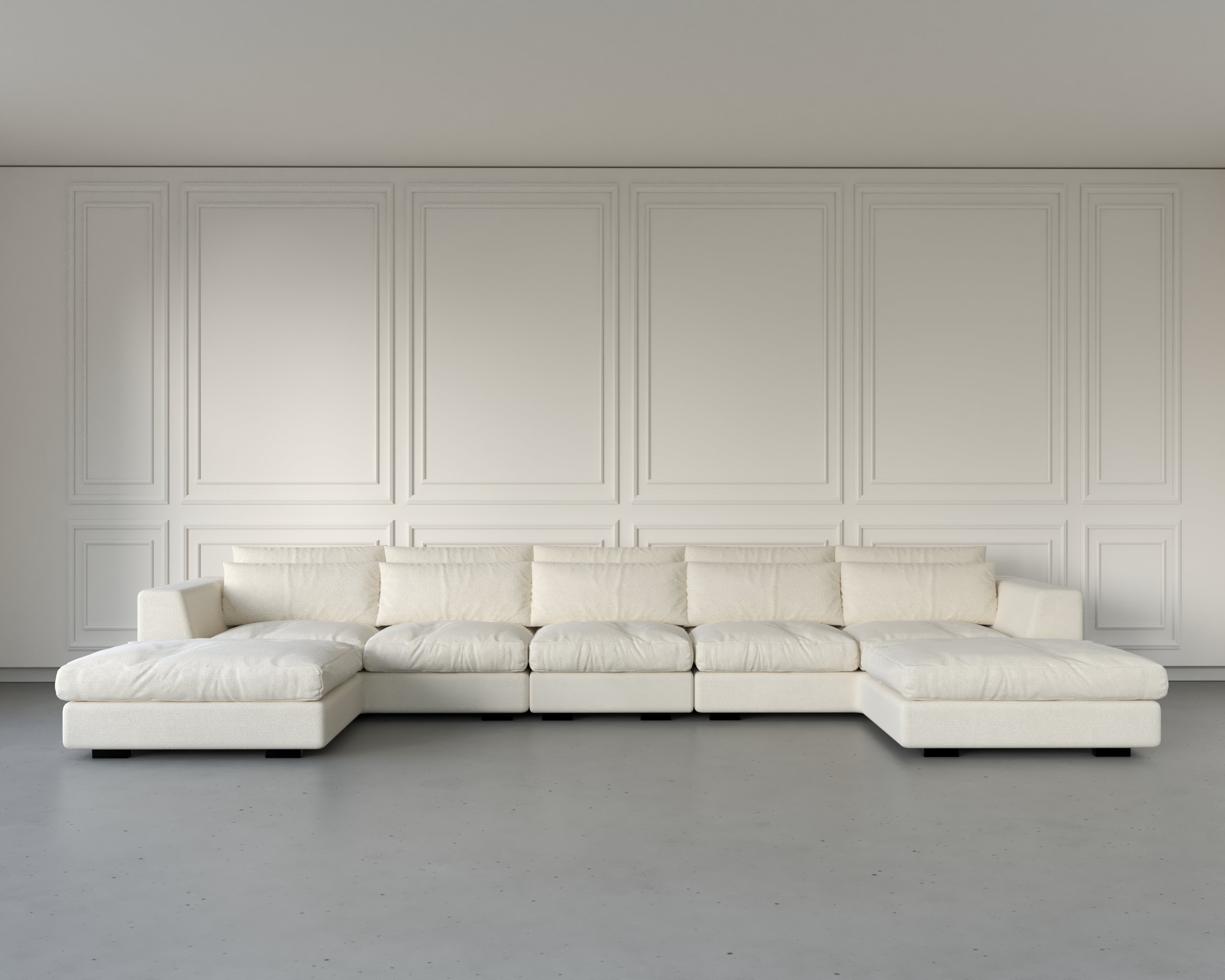 Modern U-shaped sectional sofa with wide armrests, chaise extensions, plush cushions, and a soft feather-touch feel.