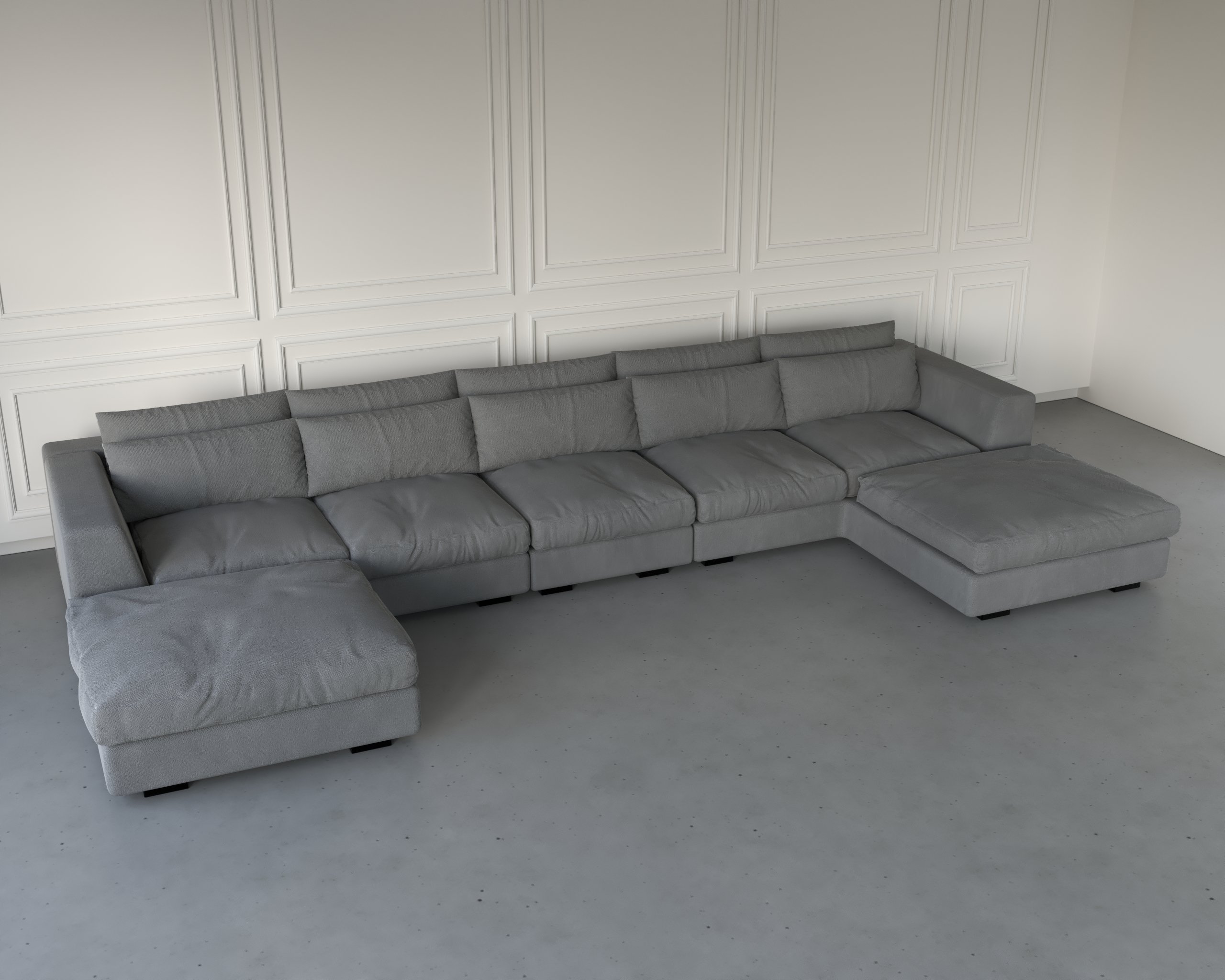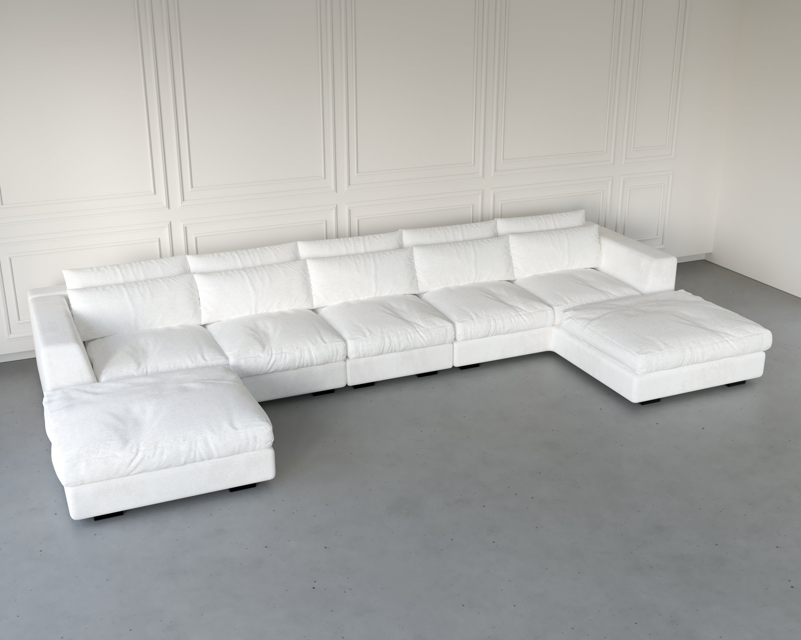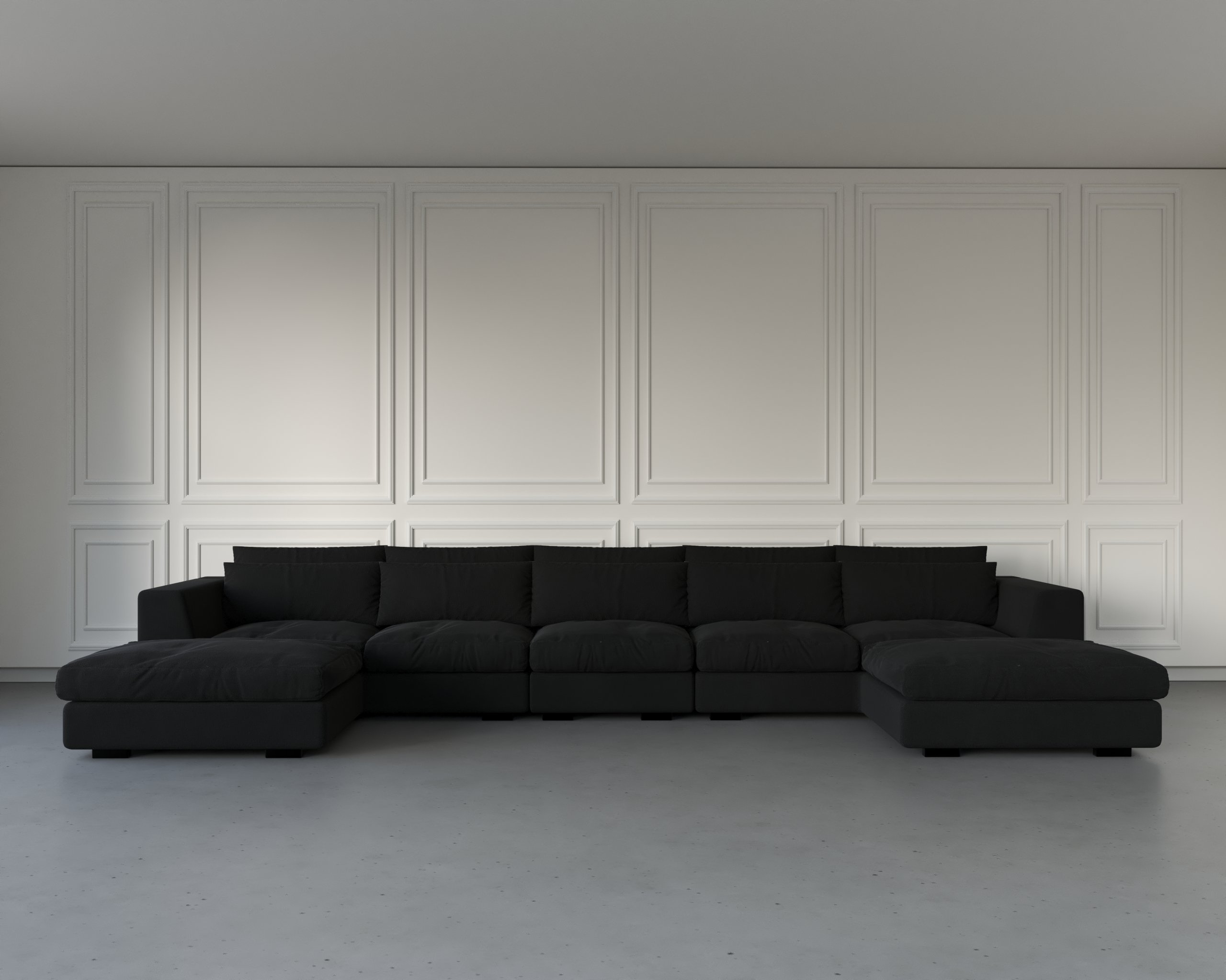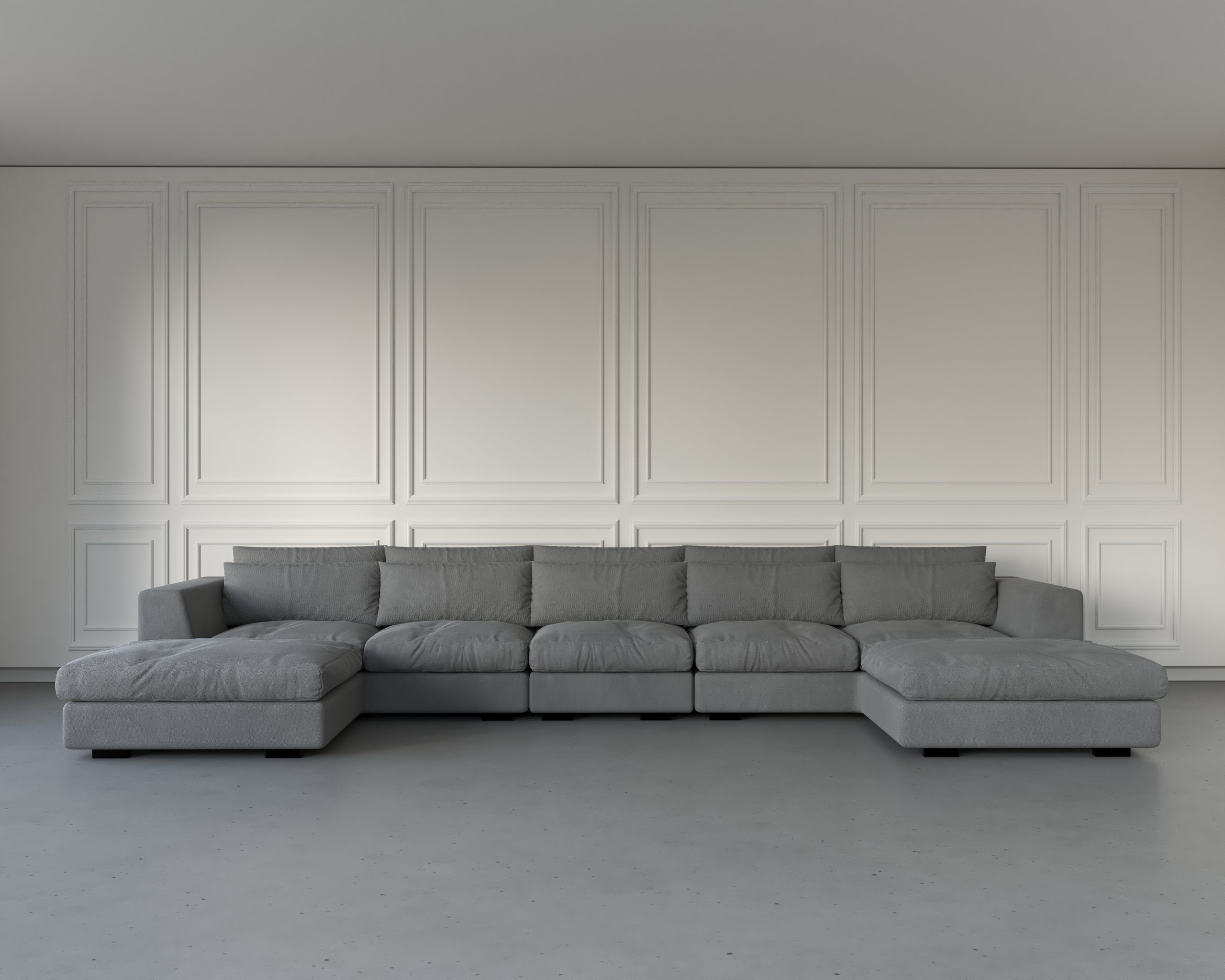 Modern U-shaped sectional sofa with wide armrests, chaise extensions, plush cushions, and a soft feather-touch feel.