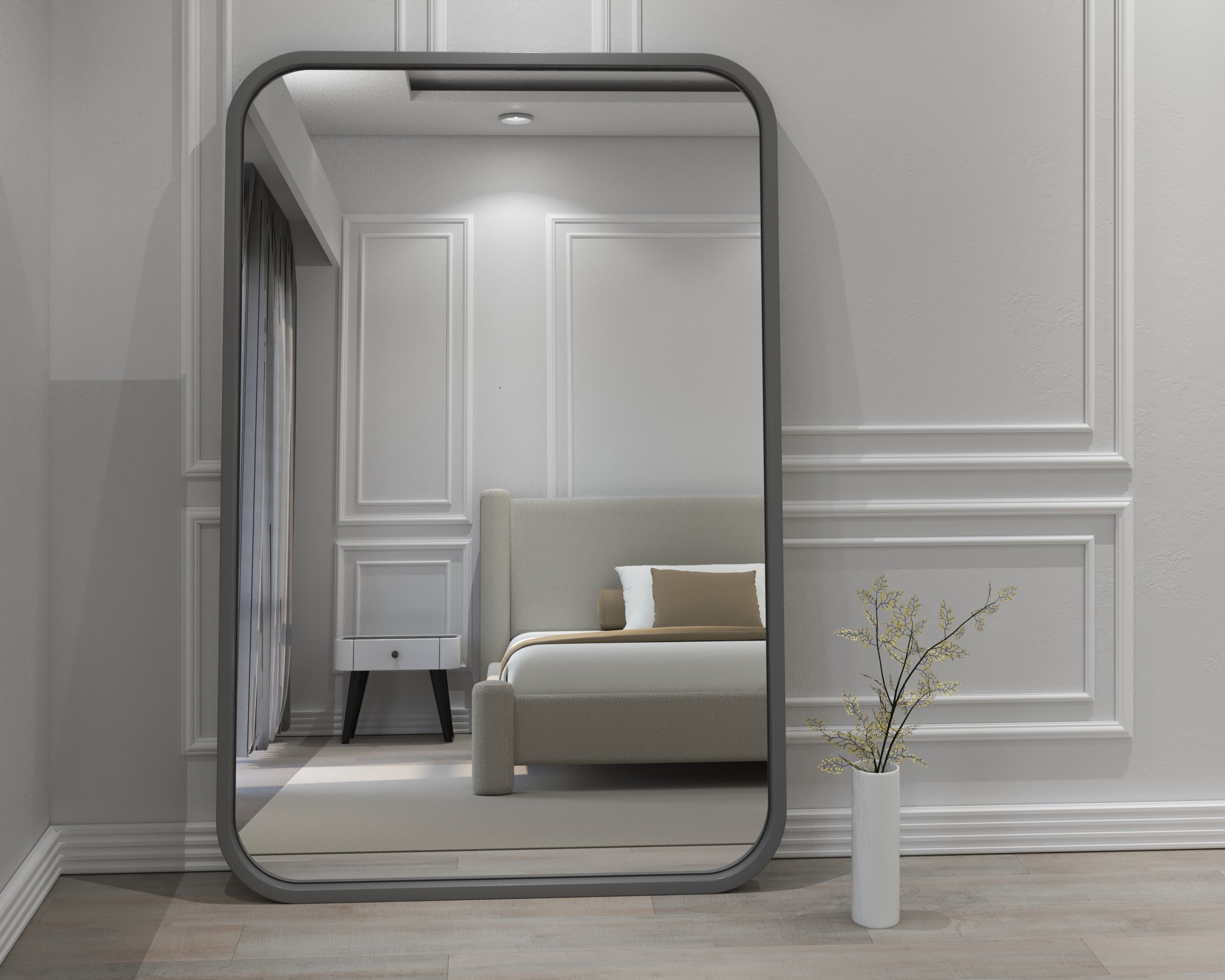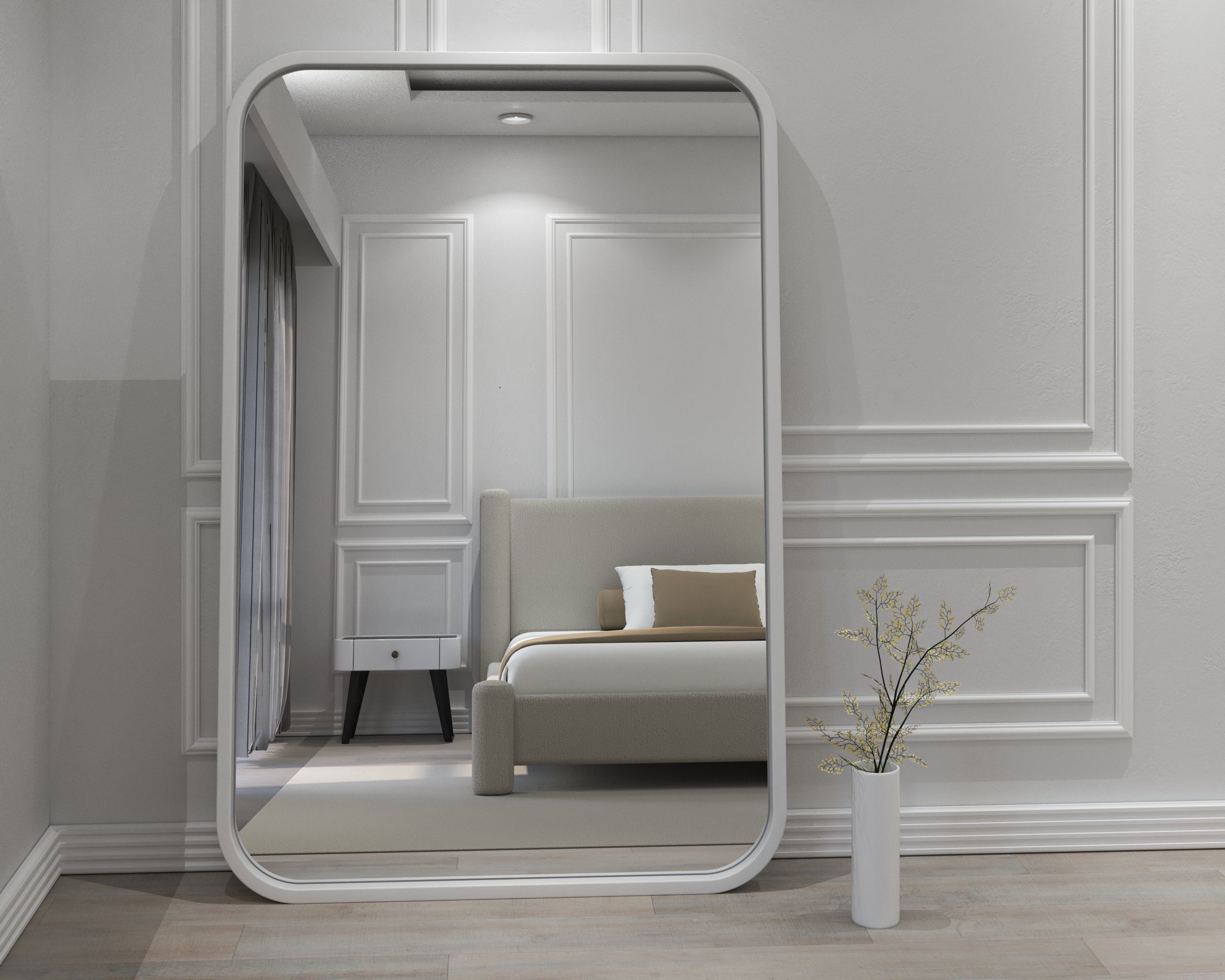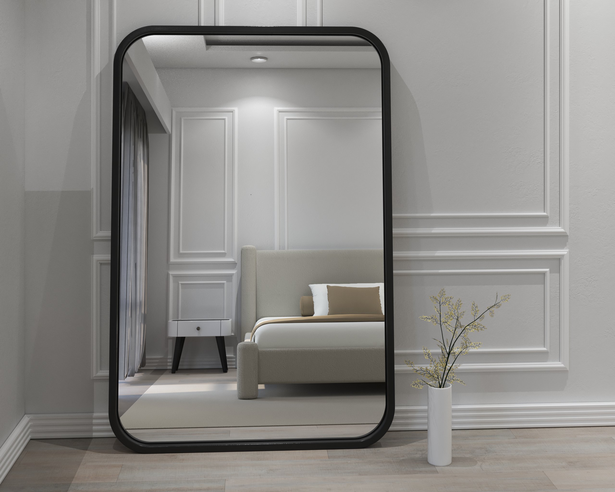The Melani Mirror blends clean contemporary lines with softly curved edges, creating an elegant full-length design suitable for bedrooms, living spaces, and studios. Its generous width and tall frame bring openness and refined symmetry to any room. Built with premium materials, it elevates daily living through both style and functionality.