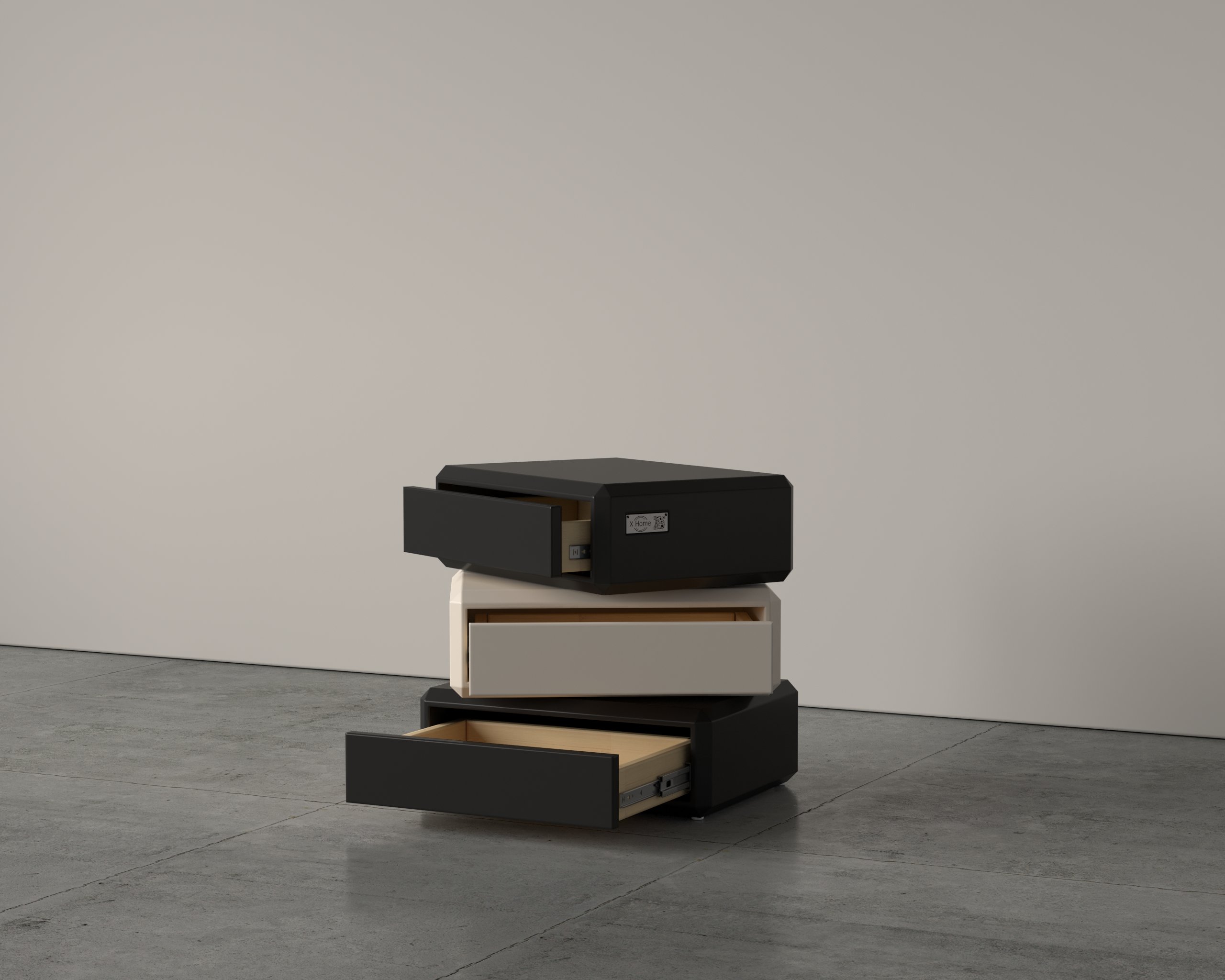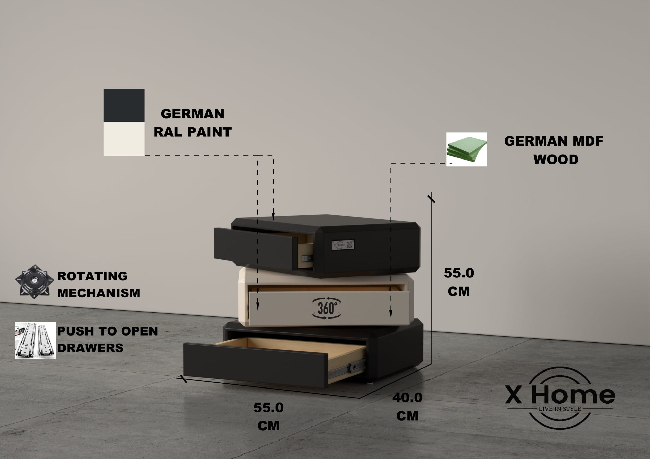 - German MDF Wood(Push open drawers),Melamine MDF Wood inside the drawers,German RAL paint, 360° Rotation Mechanism