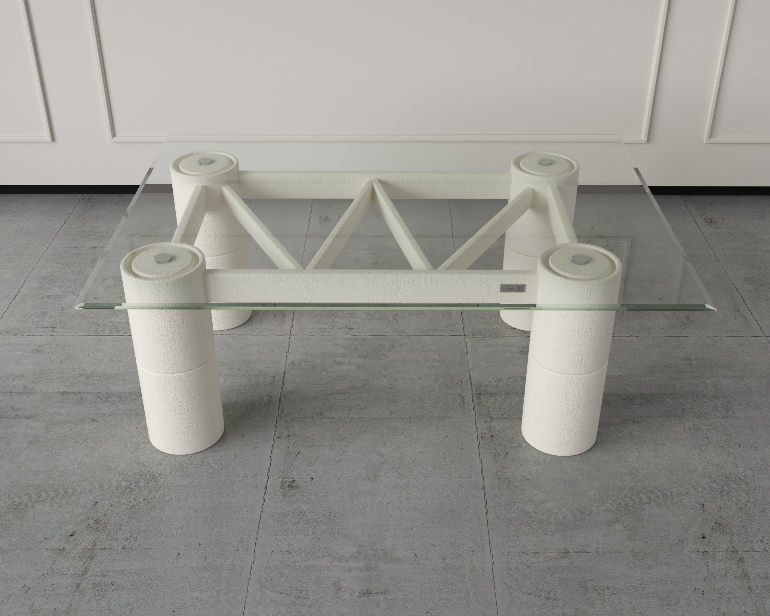 The Nebula Table blends sculptural geometry with a sleek glass surface for a striking contemporary centerpiece. Designed with bold cylindrical legs and an architectural frame for lasting stability and style.