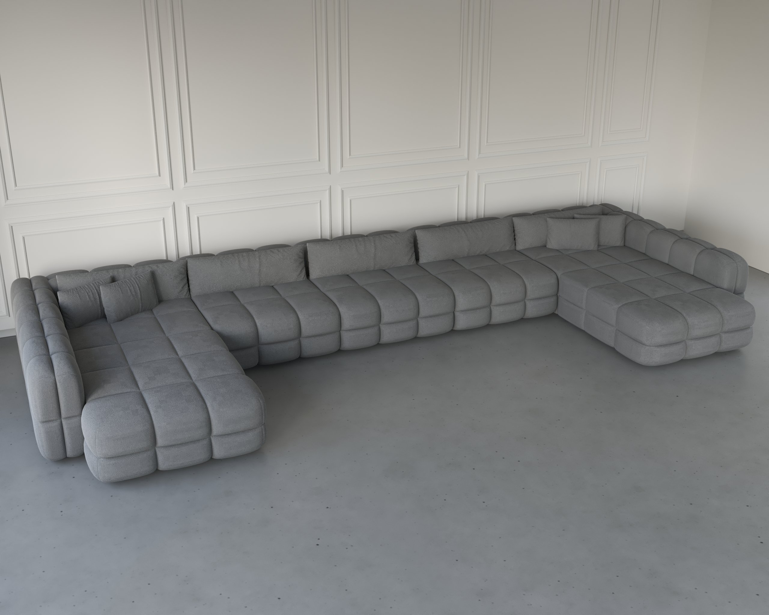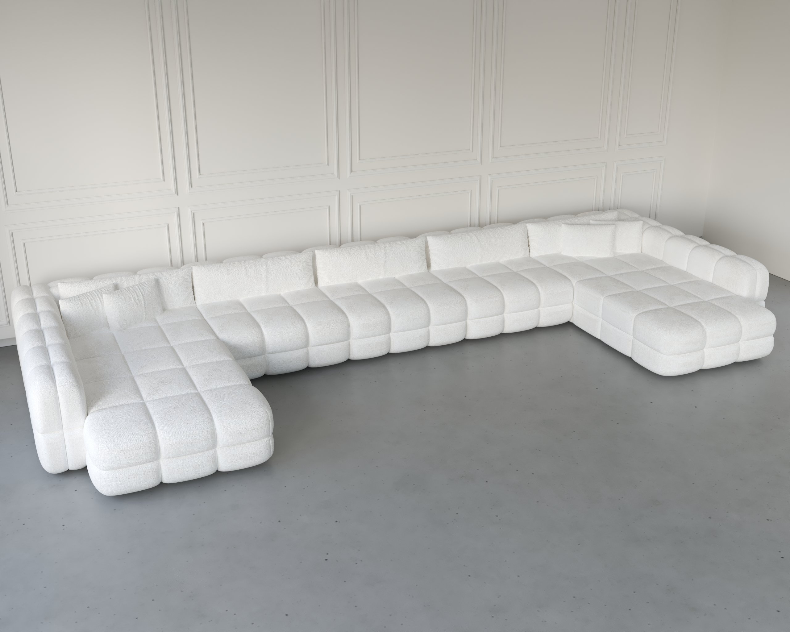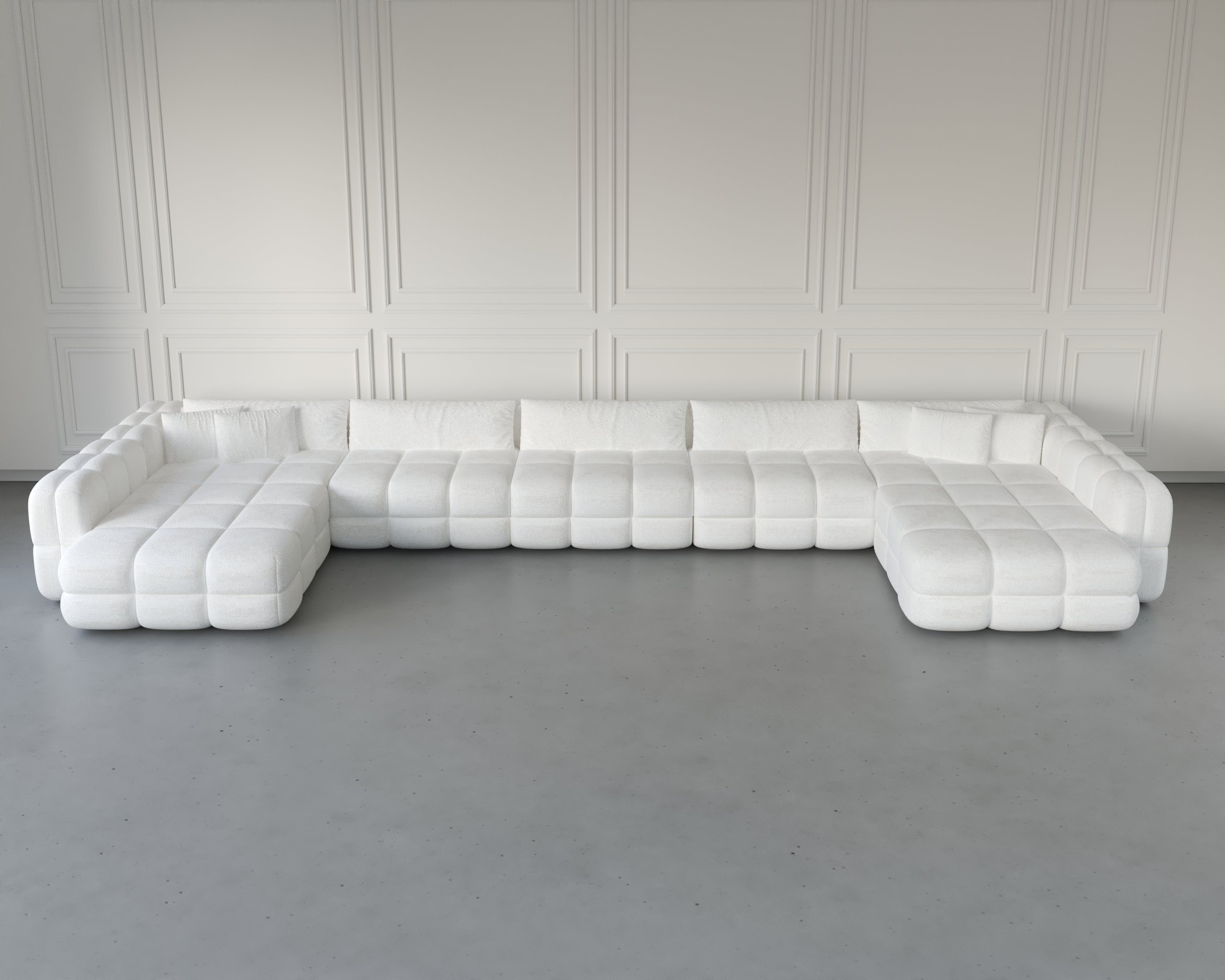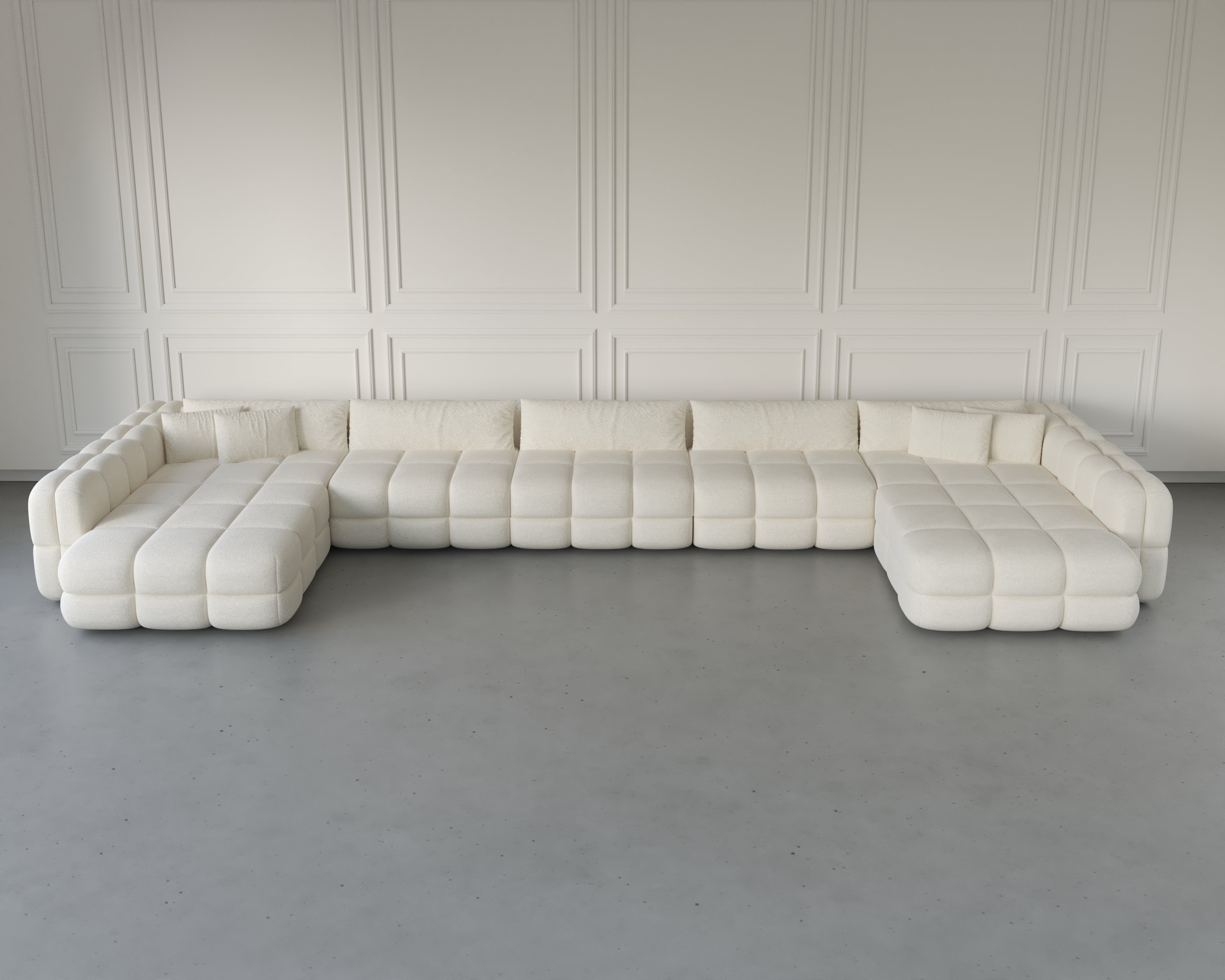This exquisite U-shaped sectional sofa combines refined craftsmanship with a modern modular design, offering both sophistication and functionality. Constructed using high-quality 40 kg high-density foam, it provides exceptional comfort and resilience, maintaining its plush form even with prolonged use. The U-shape configuration maximizes seating capacity, creating a warm and inclusive space perfect for family gatherings or entertaining guests. Its quilted detailing, soft contours, and structured silhouette bring a touch of contemporary elegance to any interior setting. Designed for versatility, this sofa enhances open living spaces while offering an inviting, cozy ambiance for relaxation or conversation.