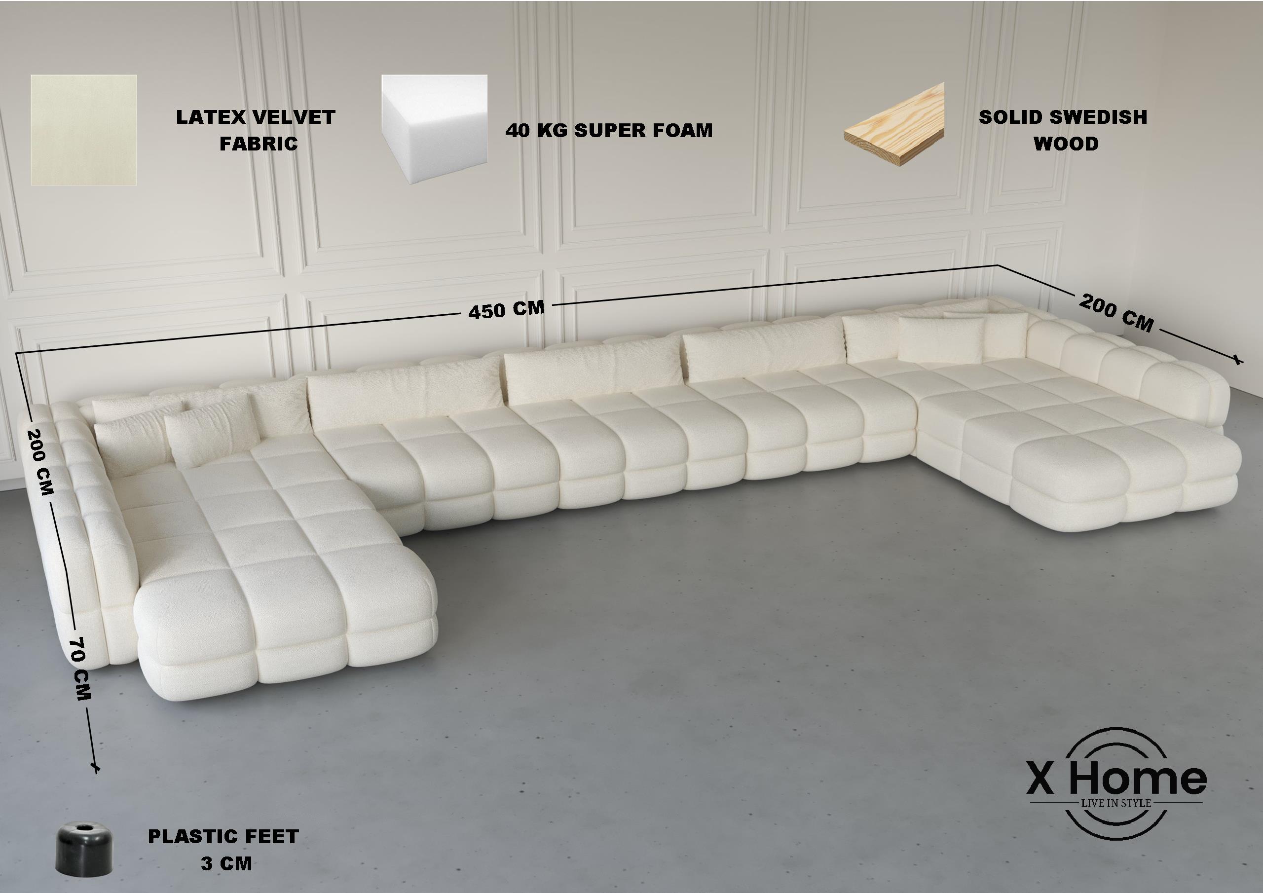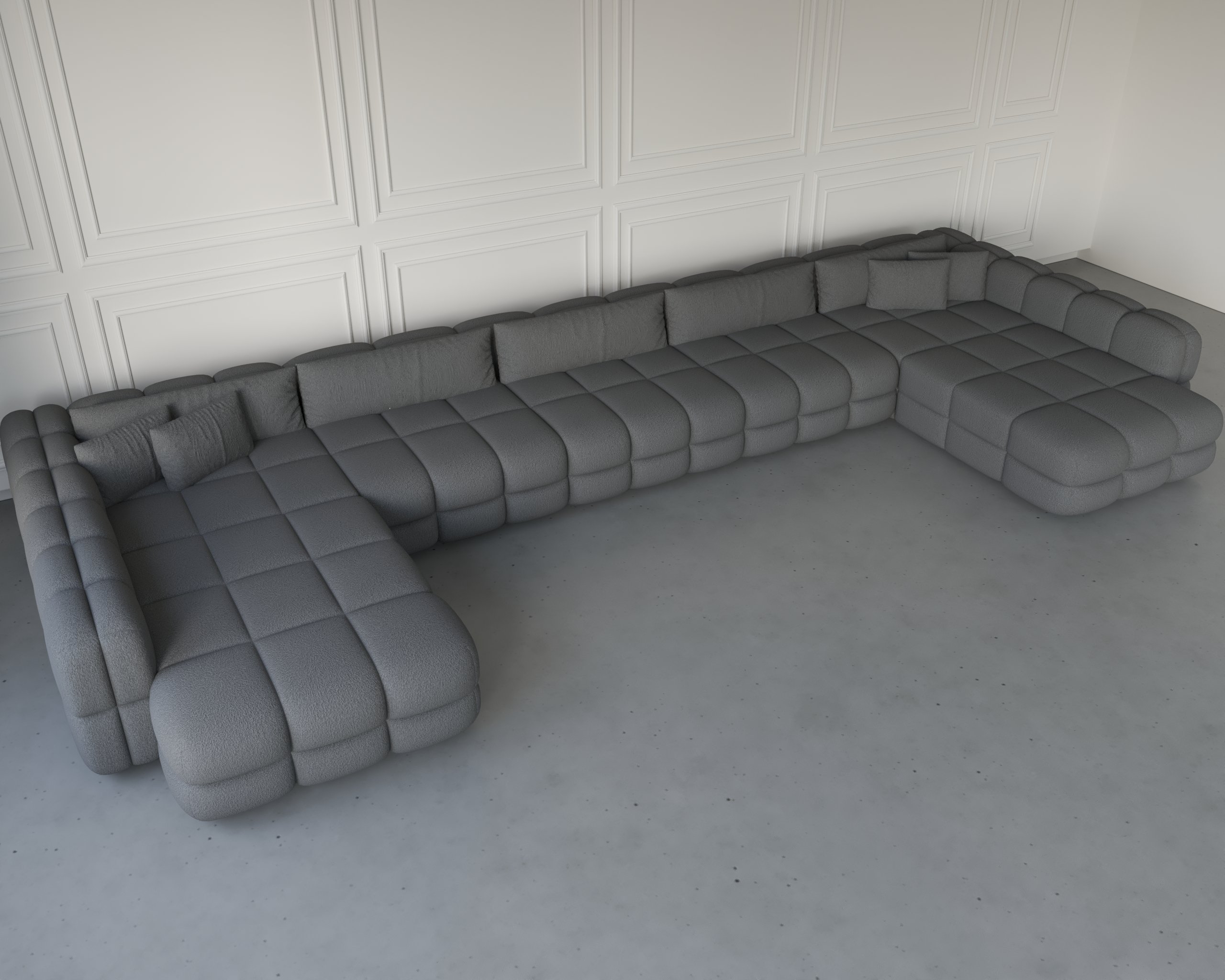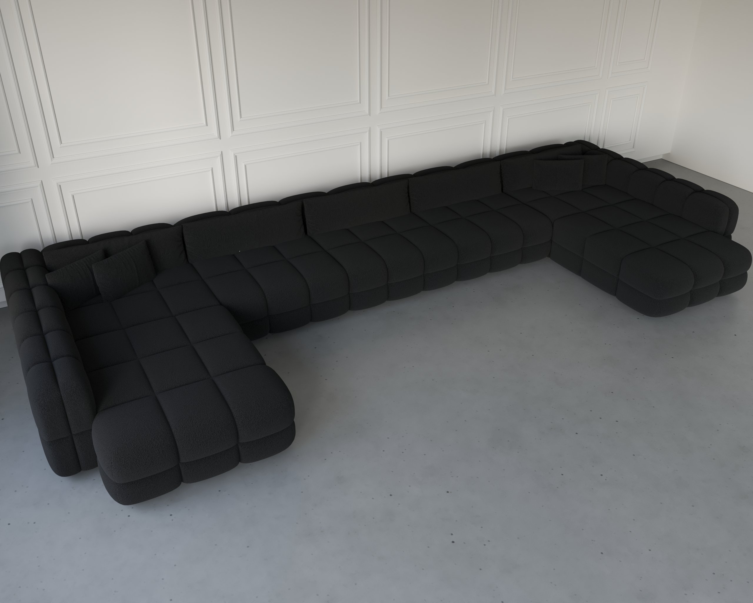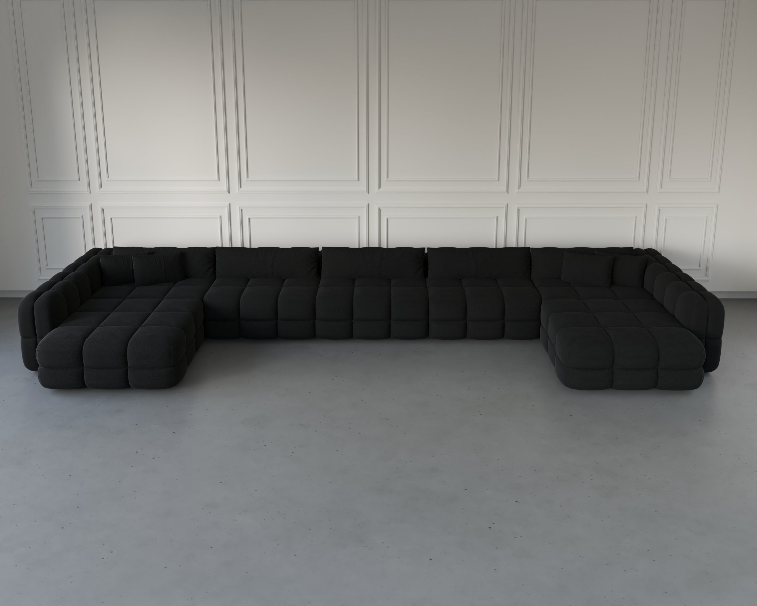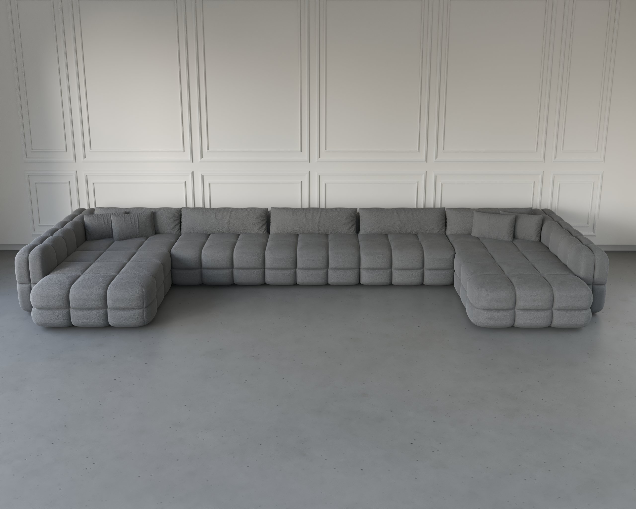 This exquisite U-shaped sectional sofa combines refined craftsmanship with a modern modular design, offering both sophistication and functionality. Constructed using high-quality 40 kg high-density foam, it provides exceptional comfort and resilience, maintaining its plush form even with prolonged use. The U-shape configuration maximizes seating capacity, creating a warm and inclusive space perfect for family gatherings or entertaining guests. Its quilted detailing, soft contours, and structured silhouette bring a touch of contemporary elegance to any interior setting. Designed for versatility, this sofa enhances open living spaces while offering an inviting, cozy ambiance for relaxation or conversation.