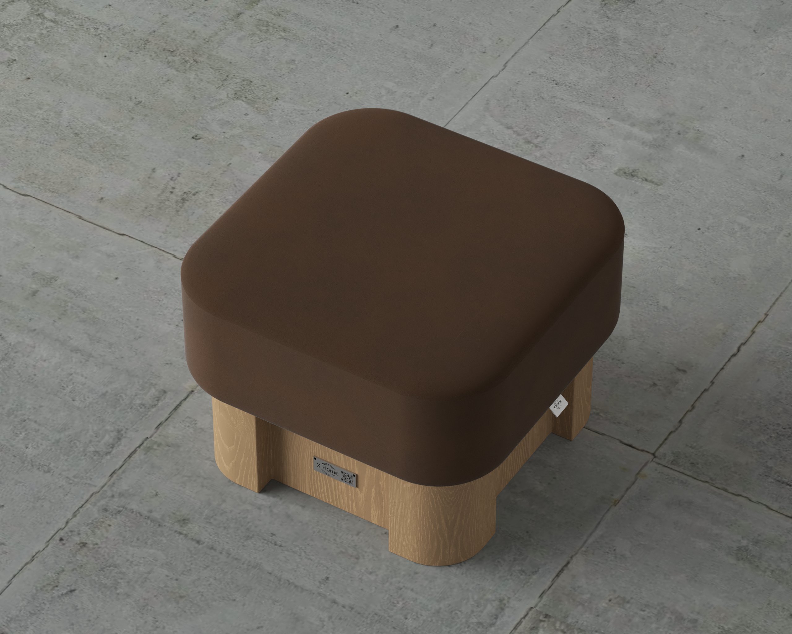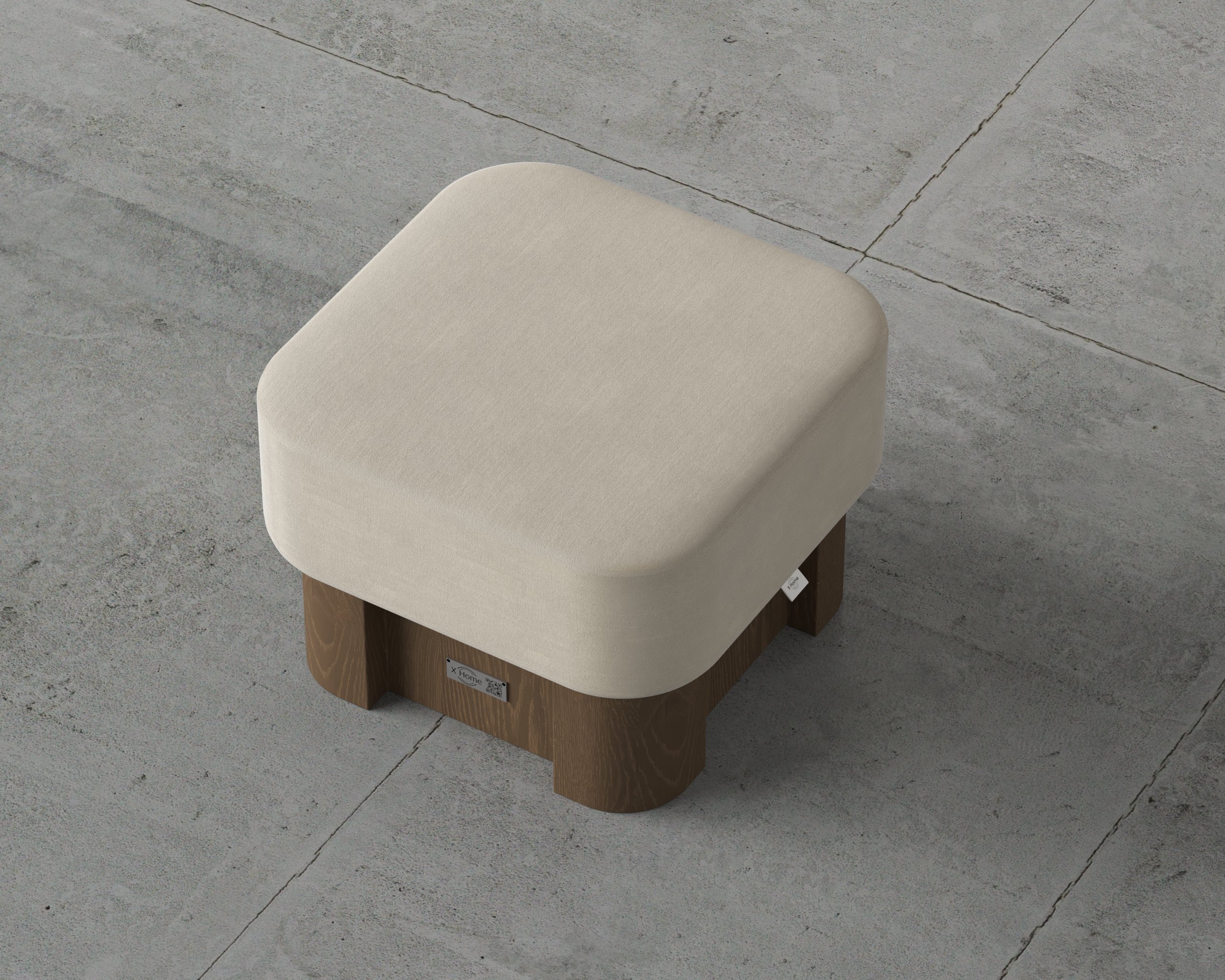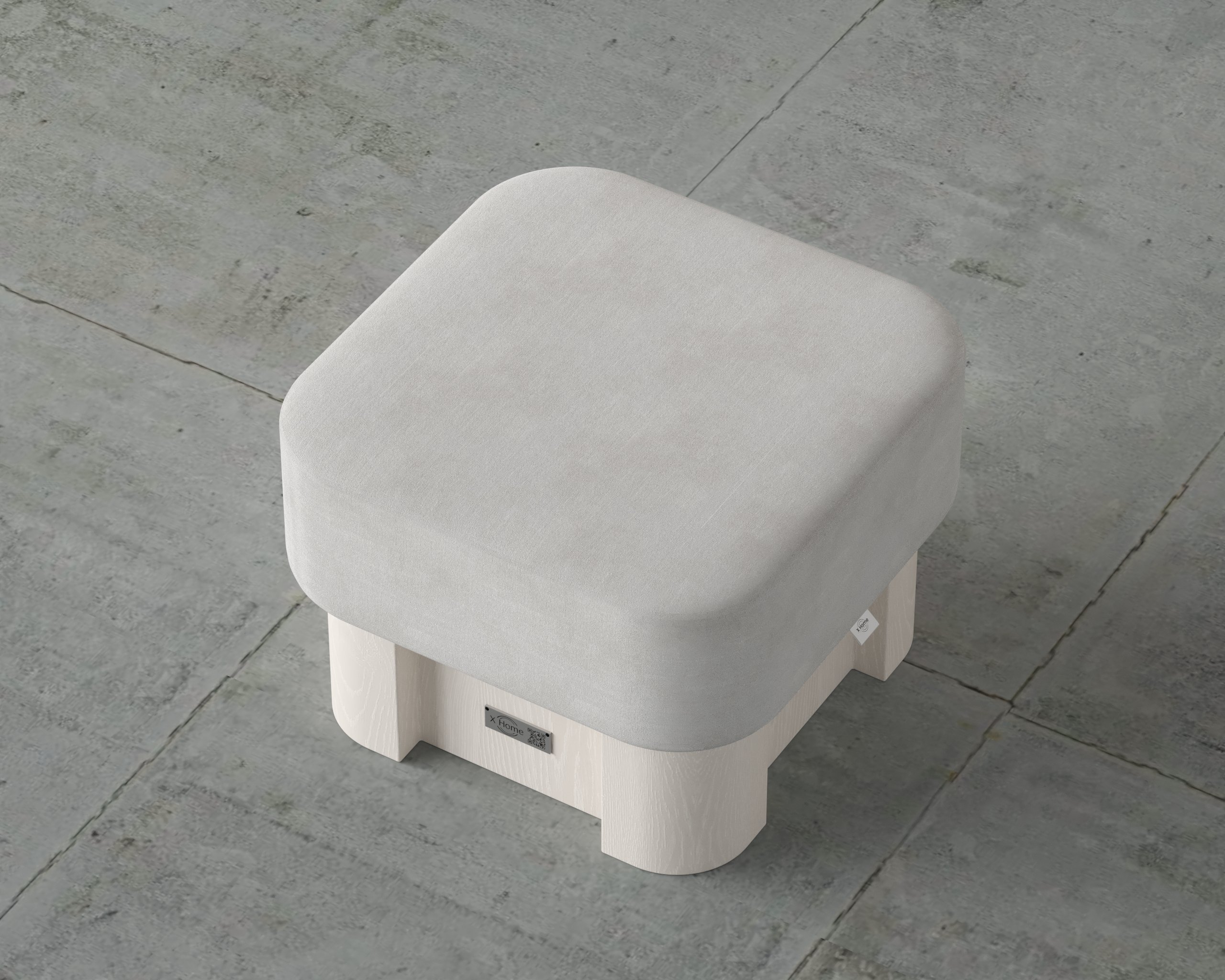 A compact sculpted bench with a soft cushioned top and a solid wooden base, designed to bring comfort and refined structure to any space.