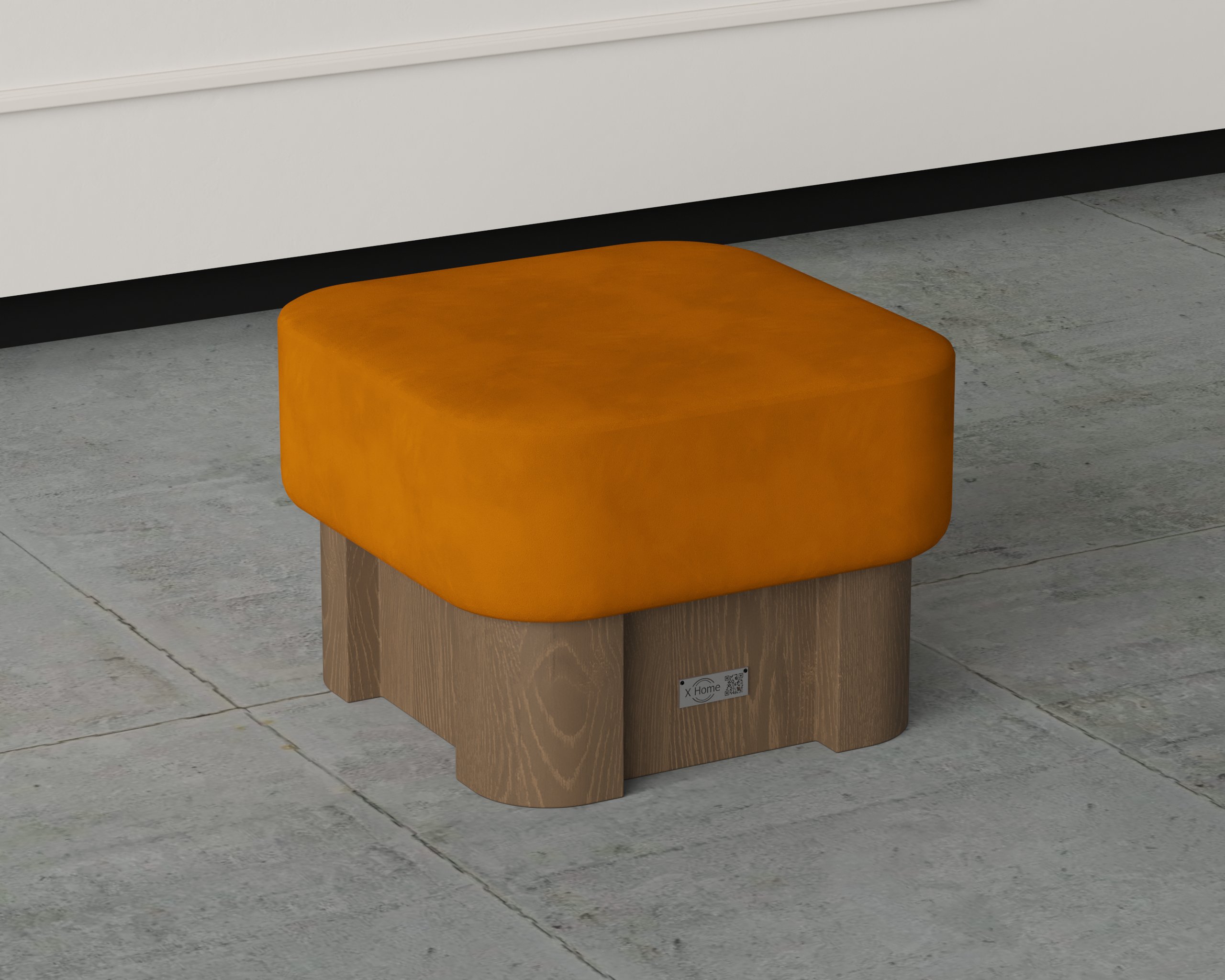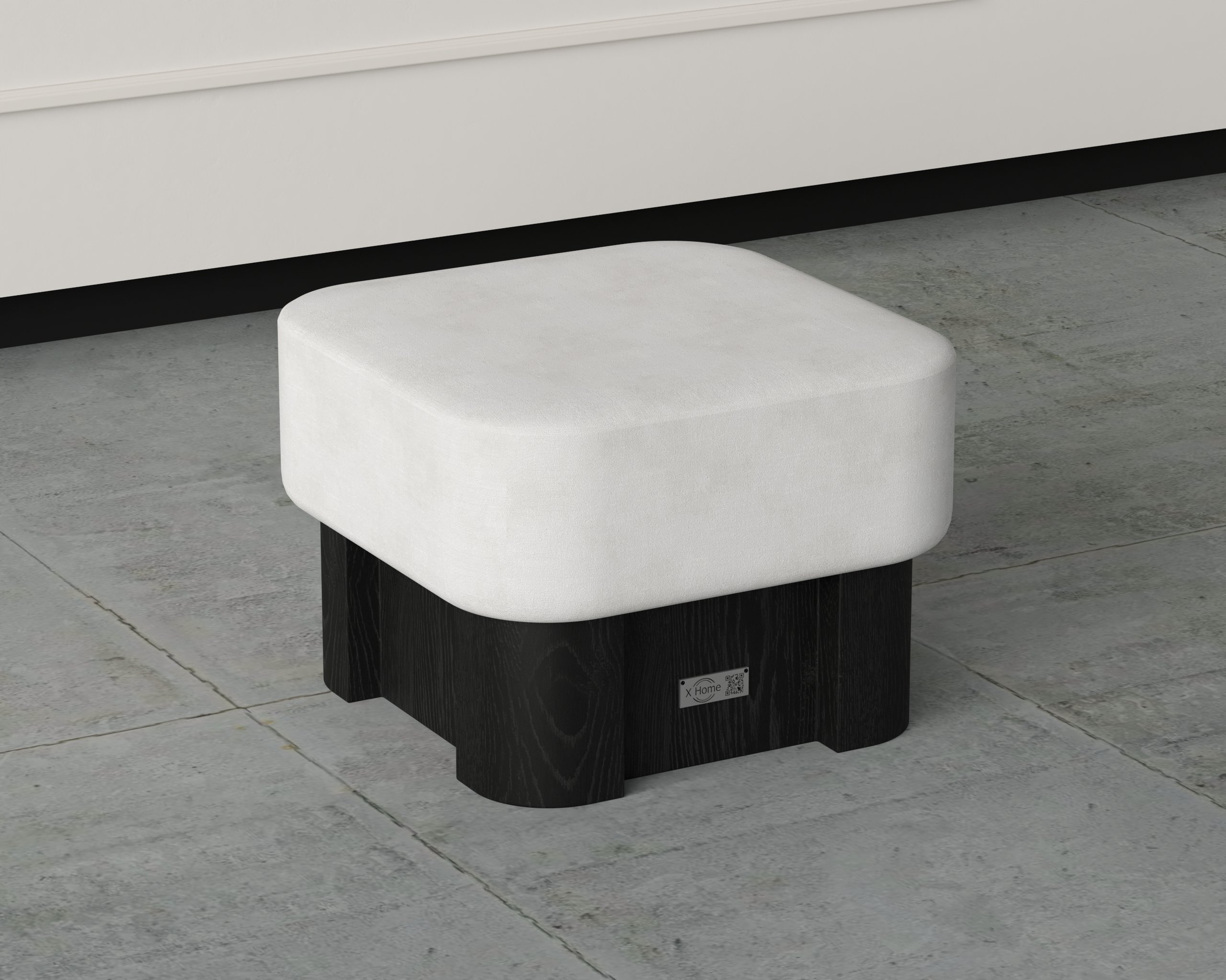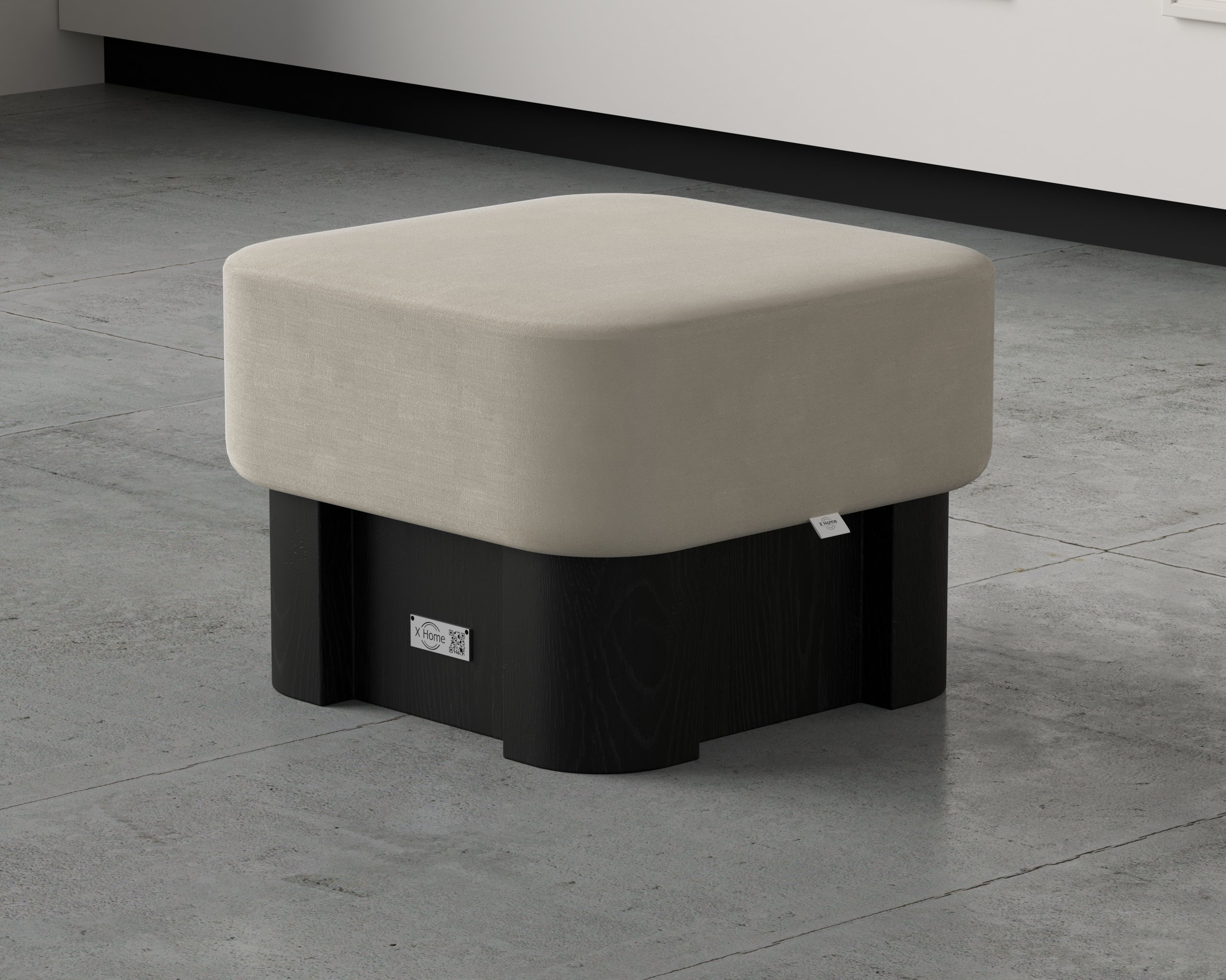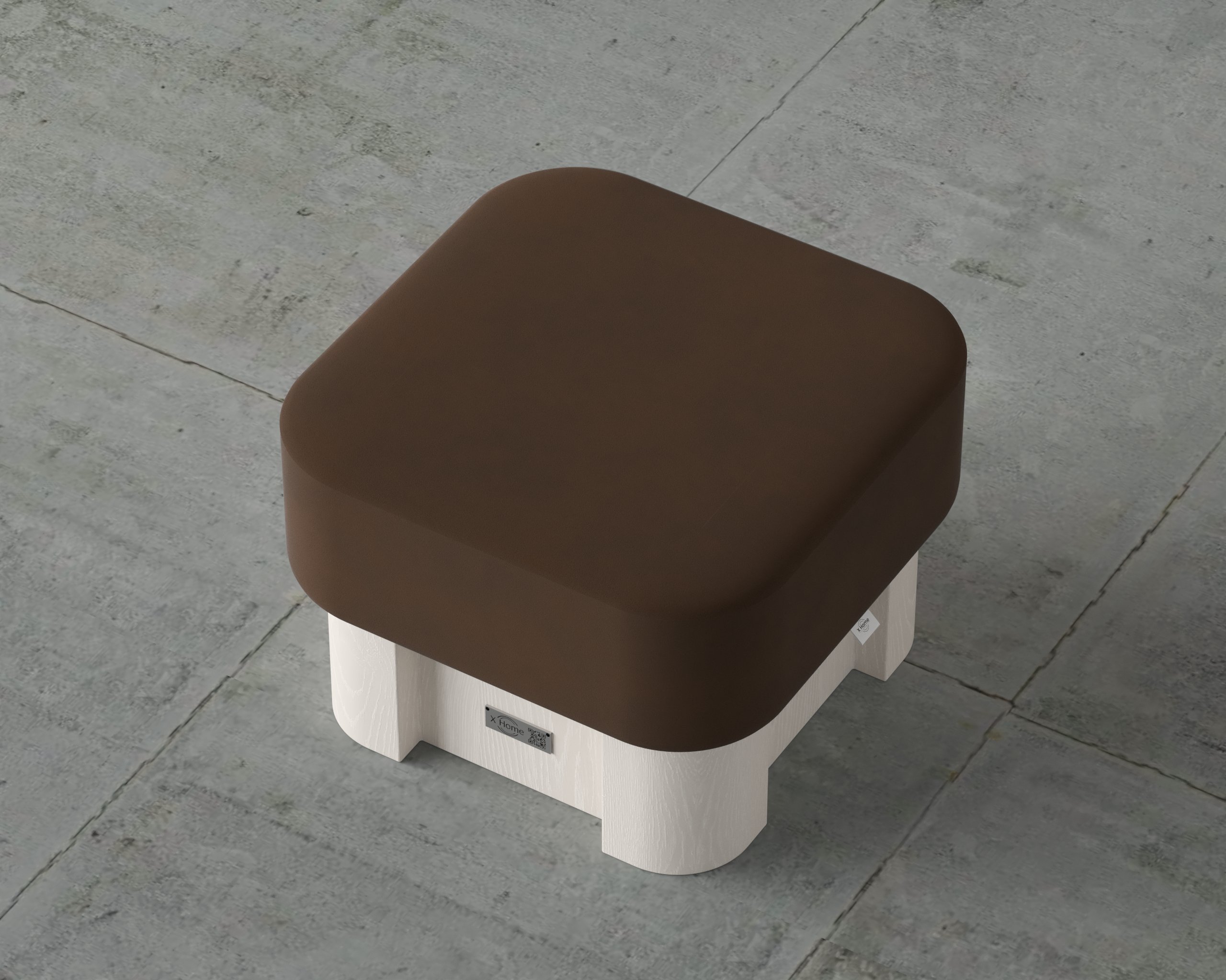 A compact sculpted bench with a soft cushioned top and a solid wooden base, designed to bring comfort and refined structure to any space.
