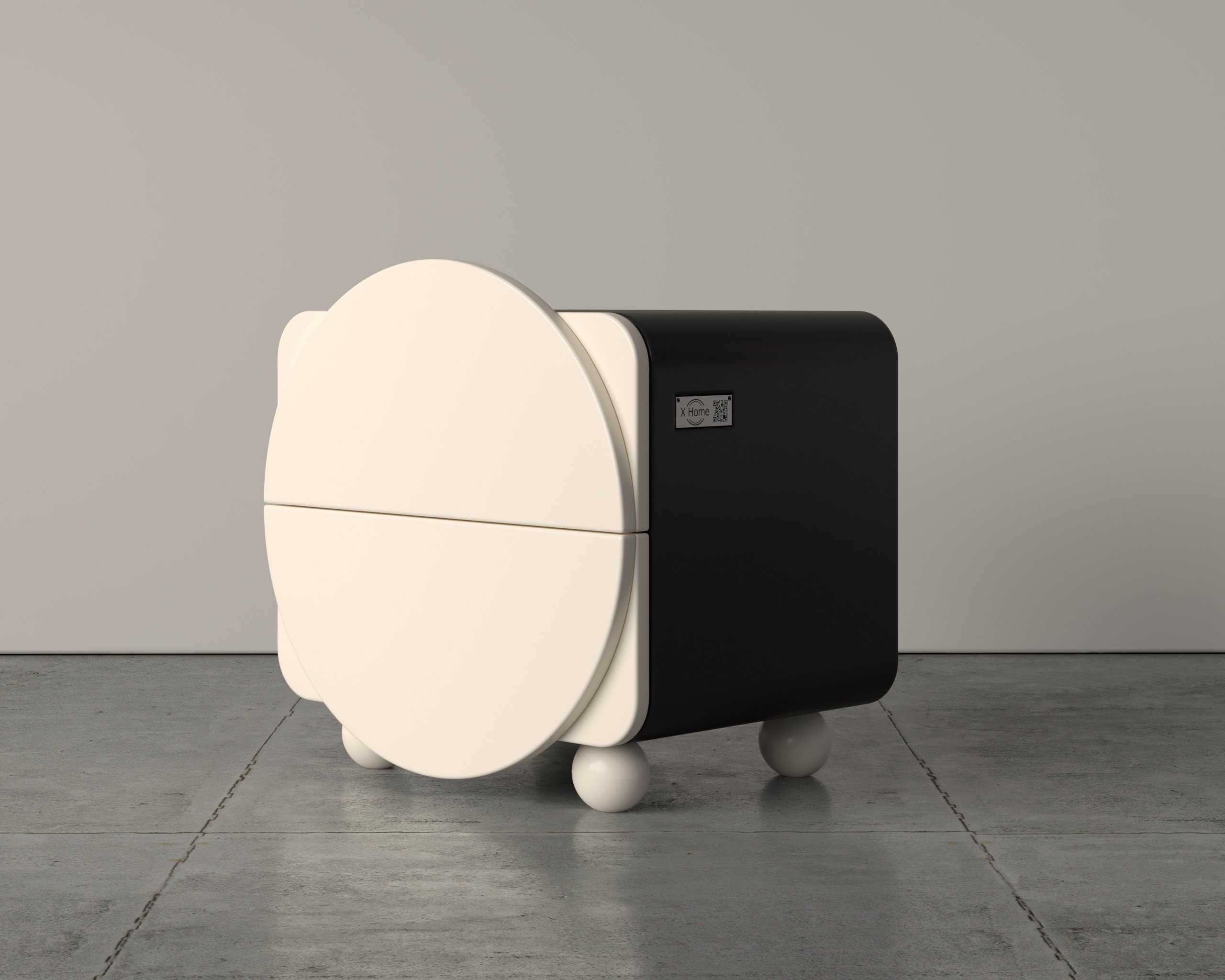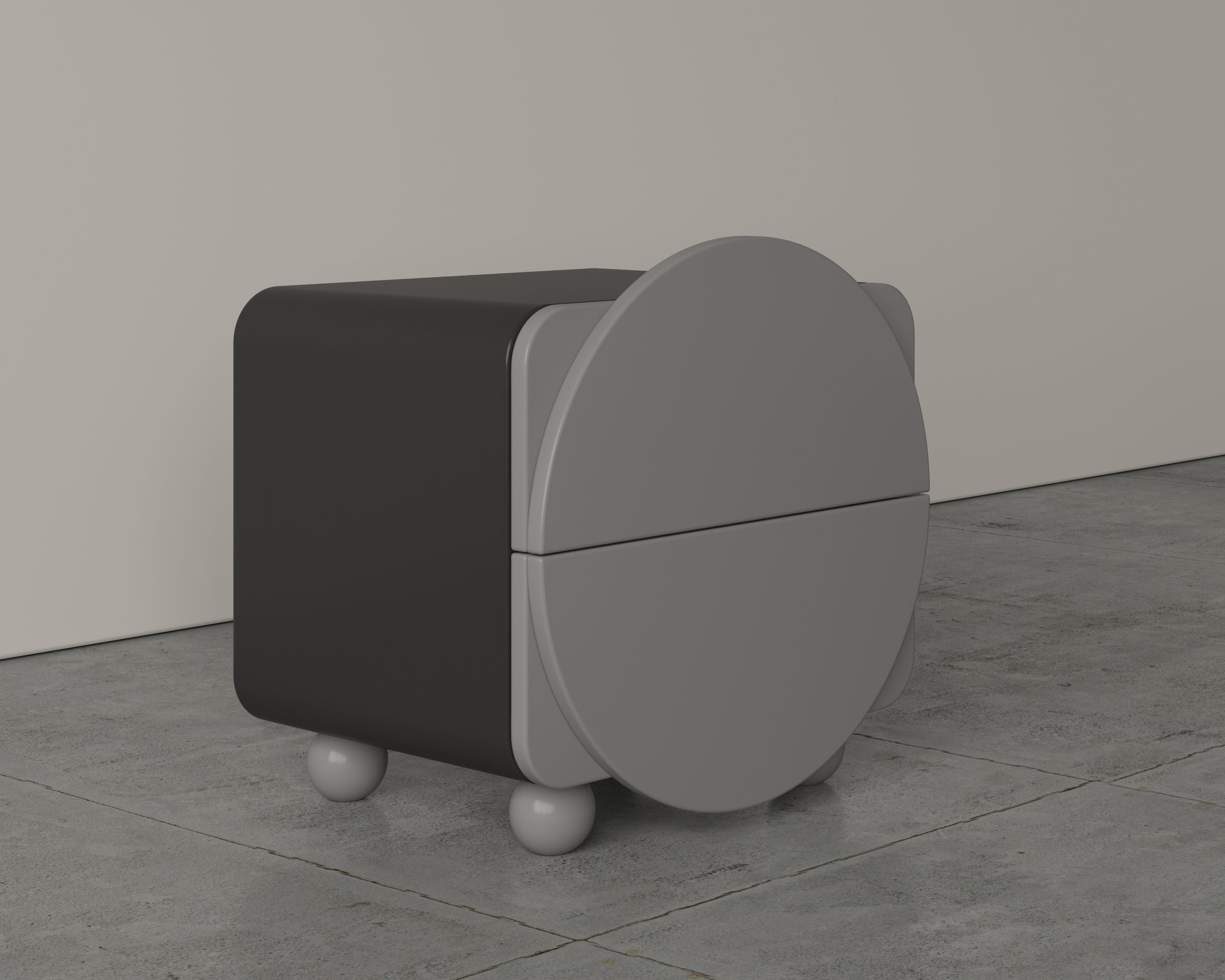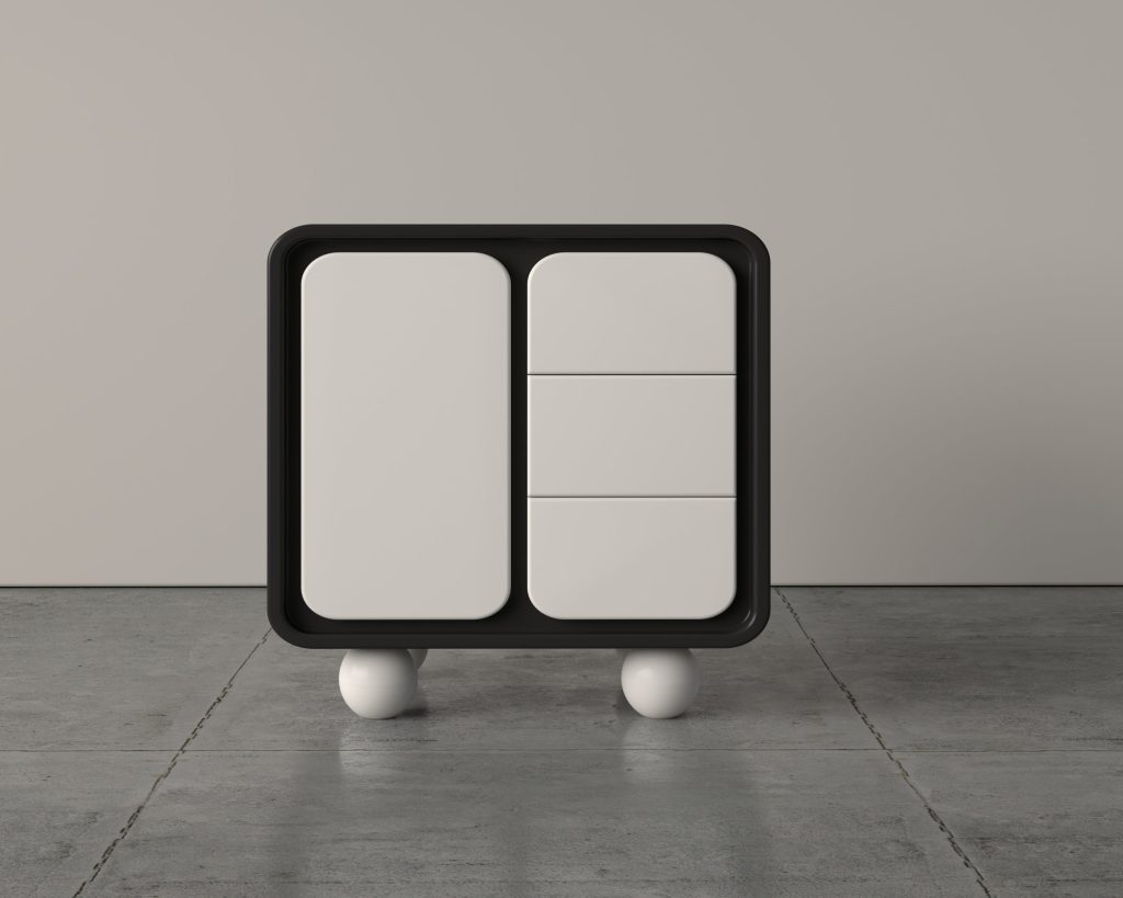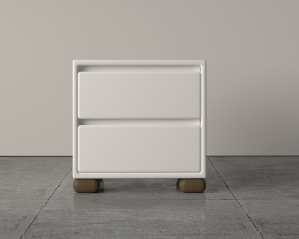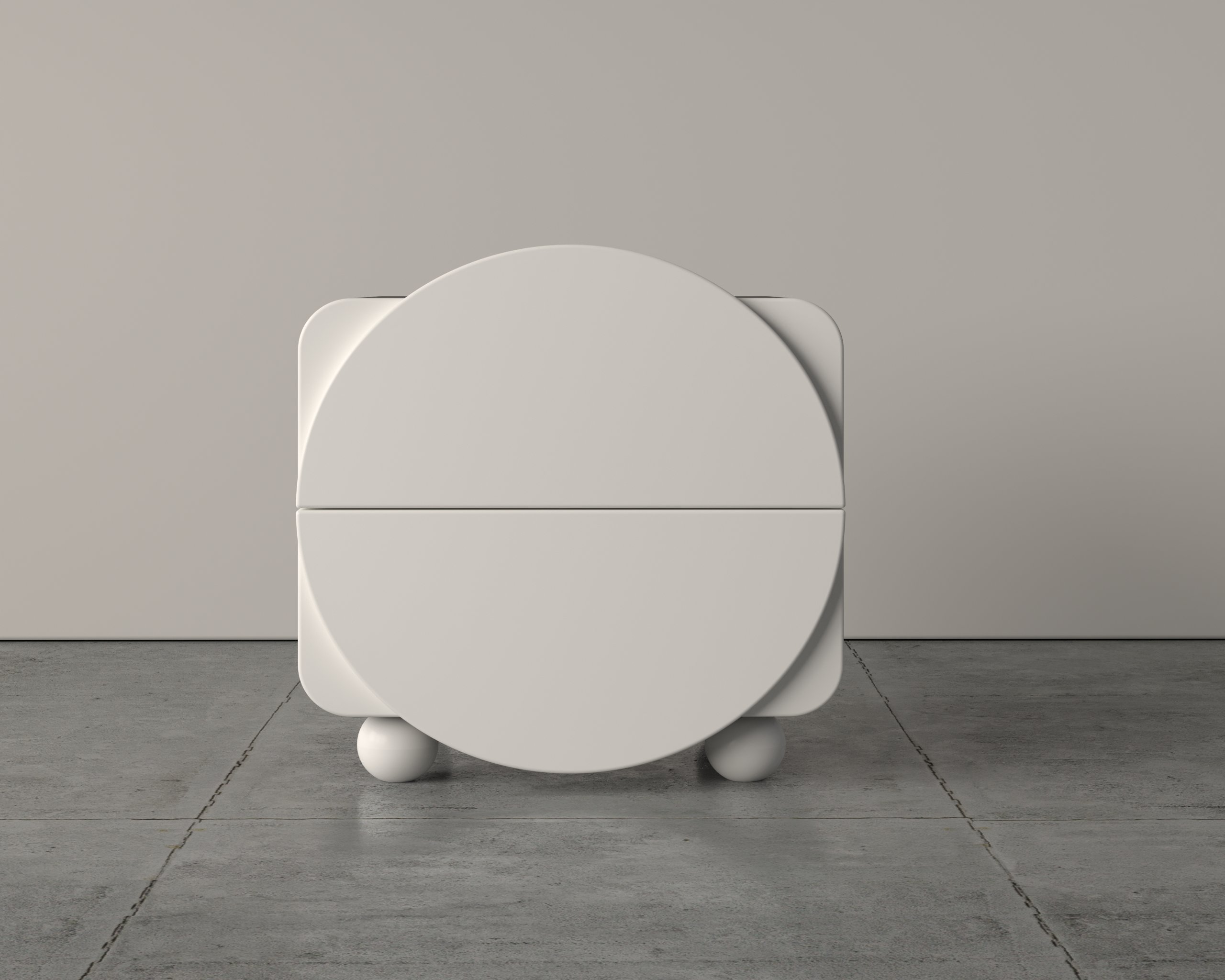 Distinct circular front accent creating visual harmony,Refined cubic form with gently rounded edges,Seamless dual-drawer configuration for understated functionality,Poised on sculptural spherical bases for a graceful stance,ontemporary silhouette blending geometric precision with softness