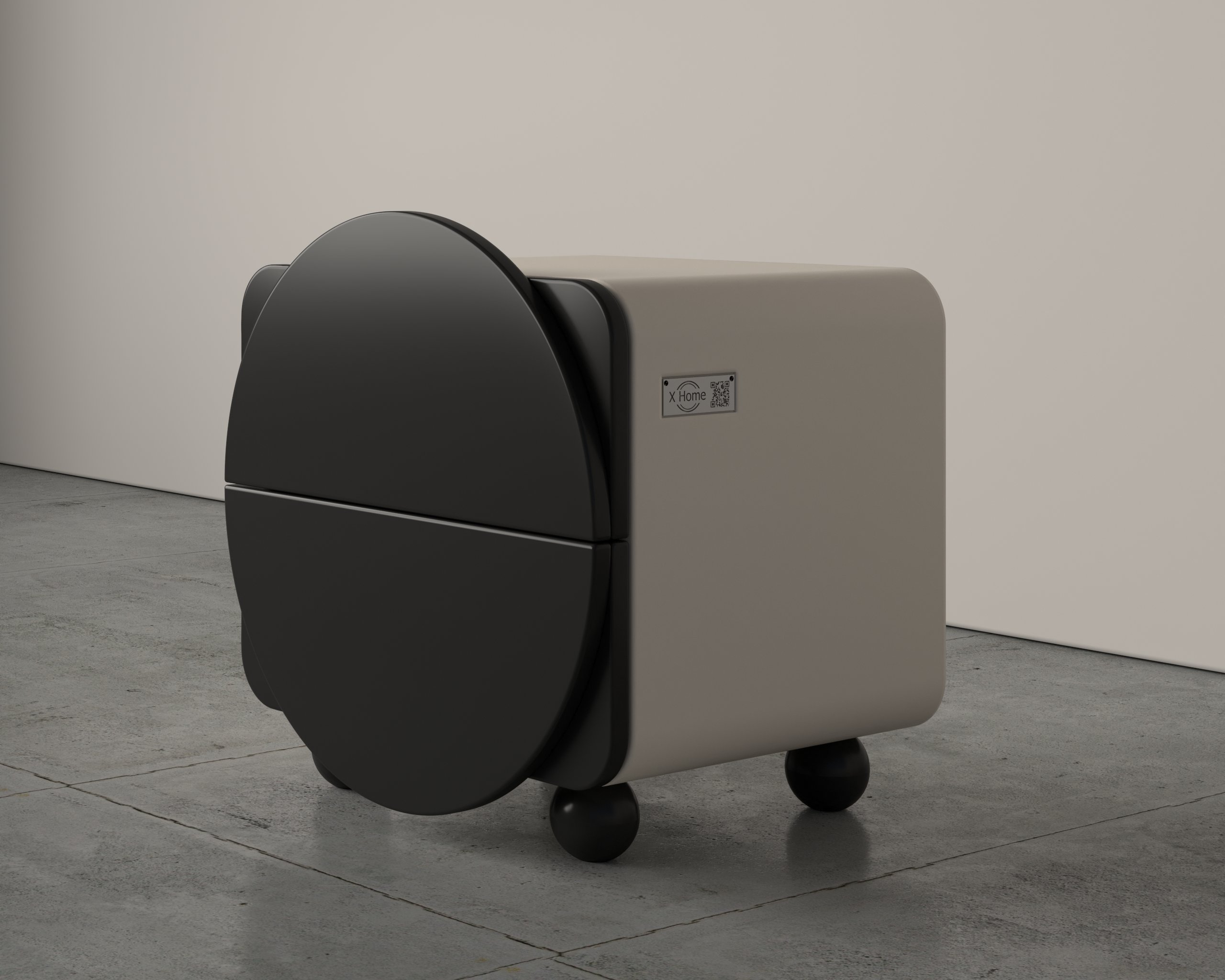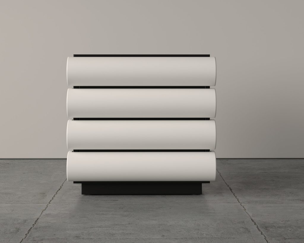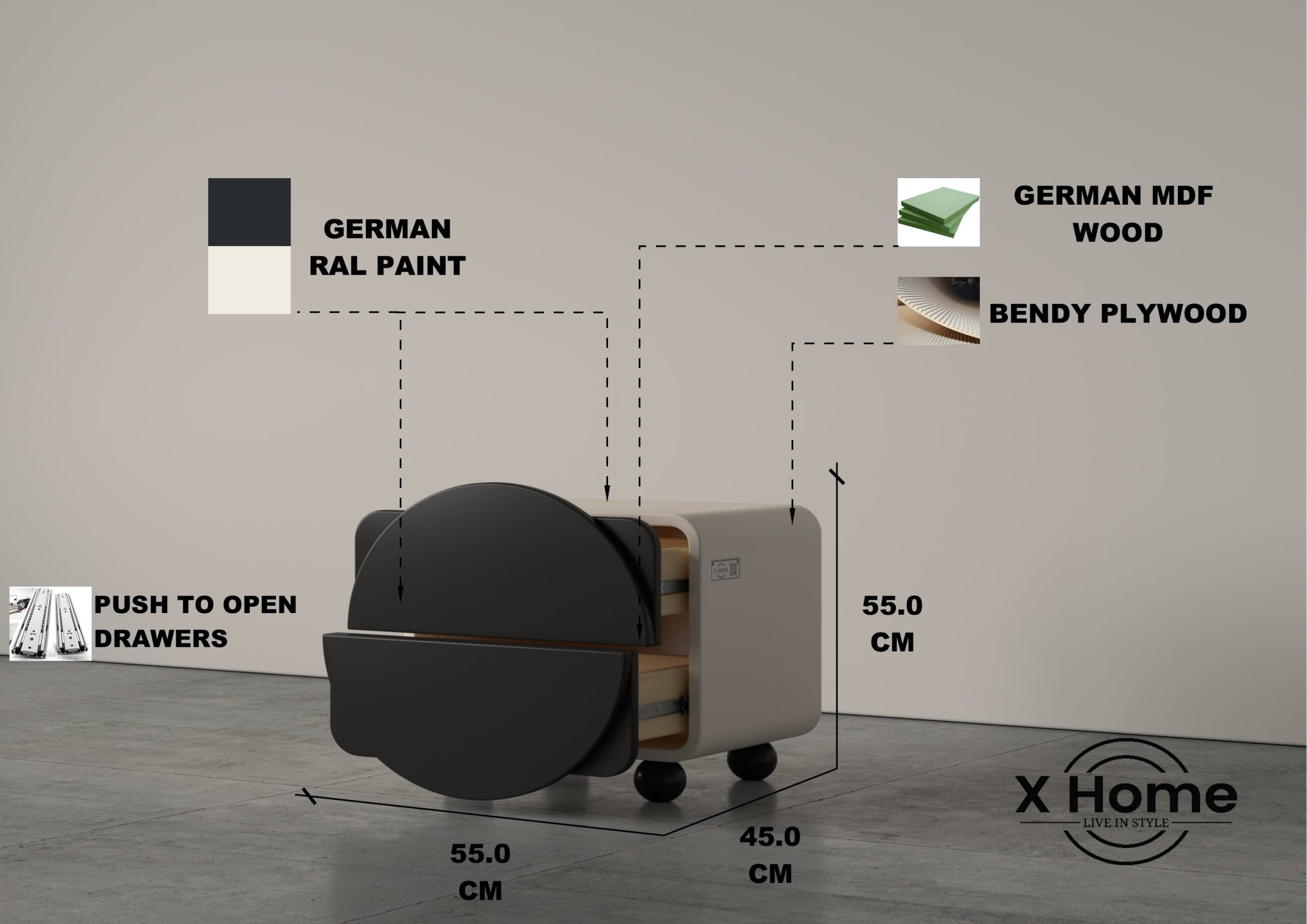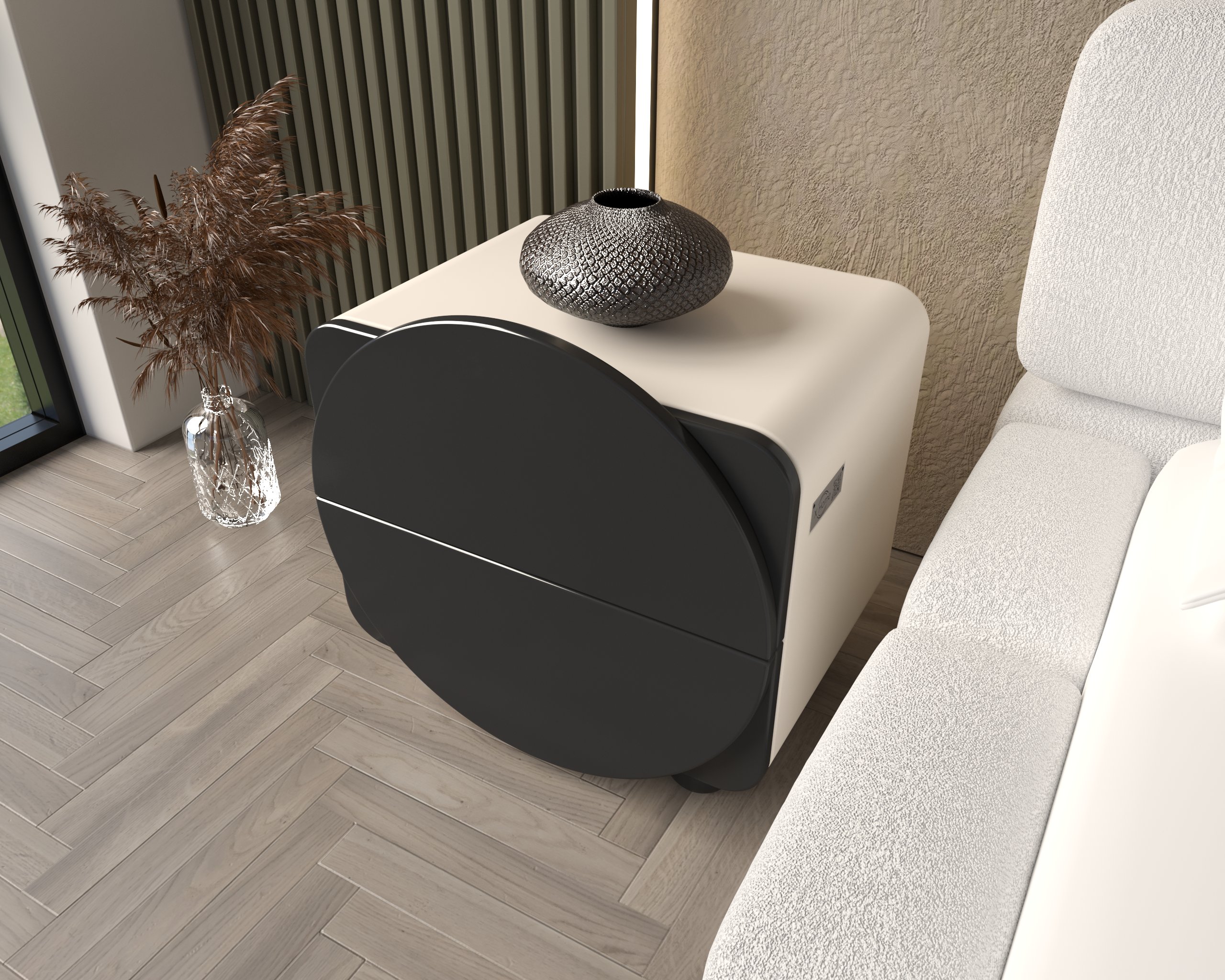 Distinct circular front accent creating visual harmony,Refined cubic form with gently rounded edges,Seamless dual-drawer configuration for understated functionality,Poised on sculptural spherical bases for a graceful stance,ontemporary silhouette blending geometric precision with softness