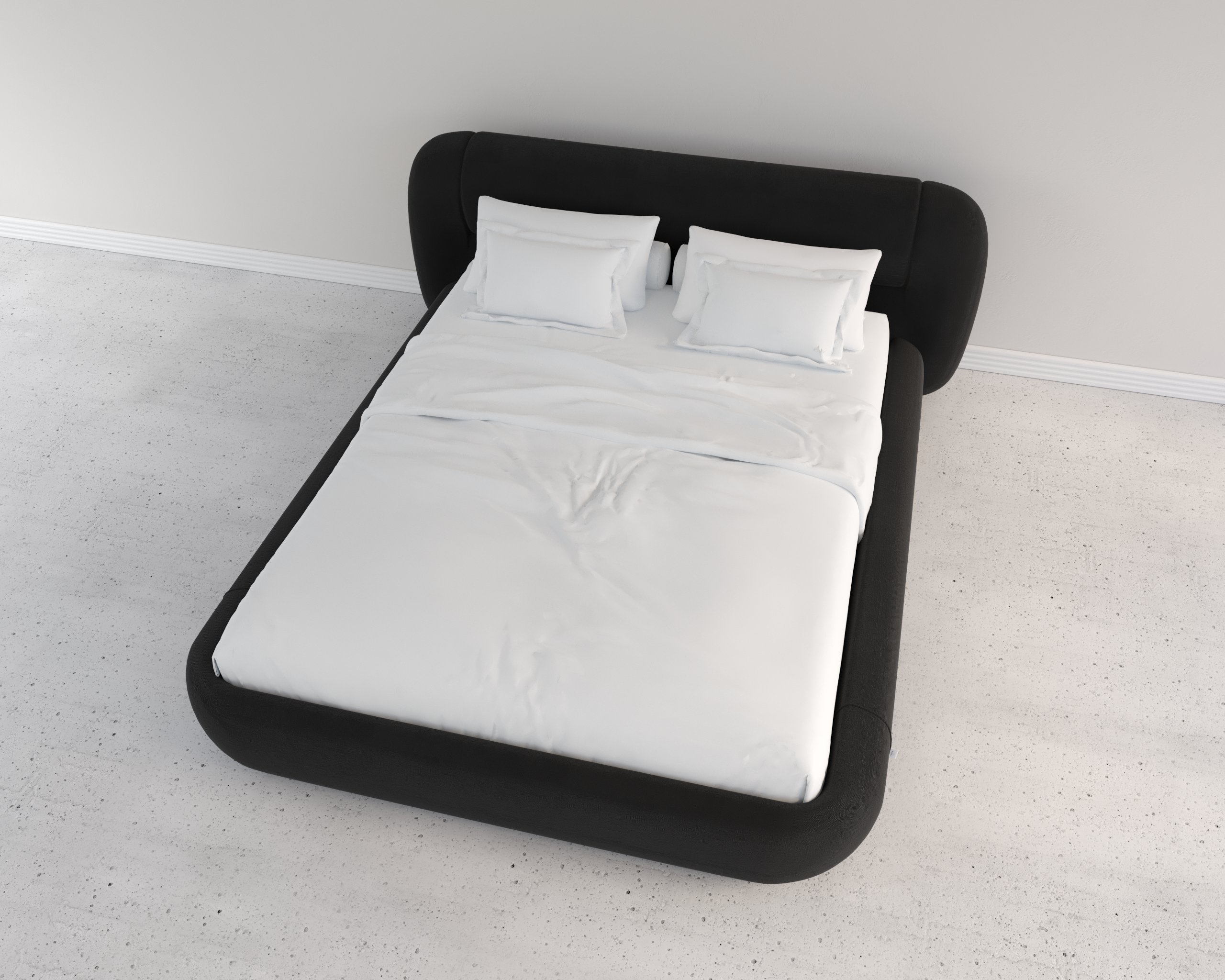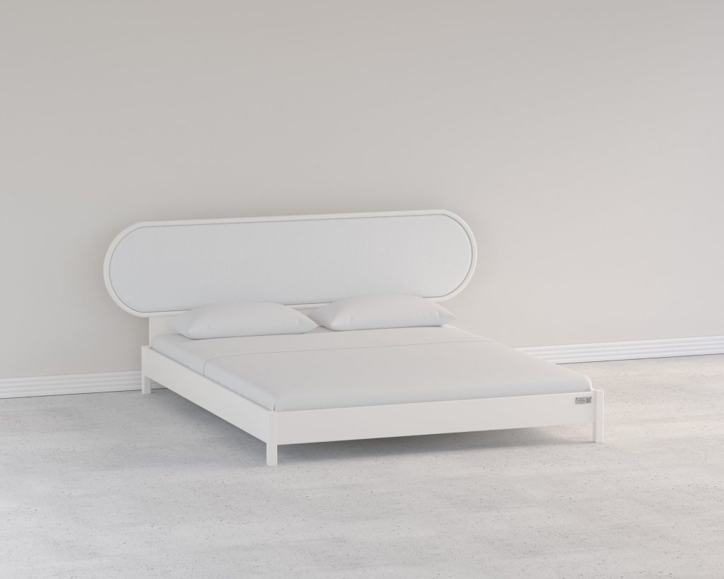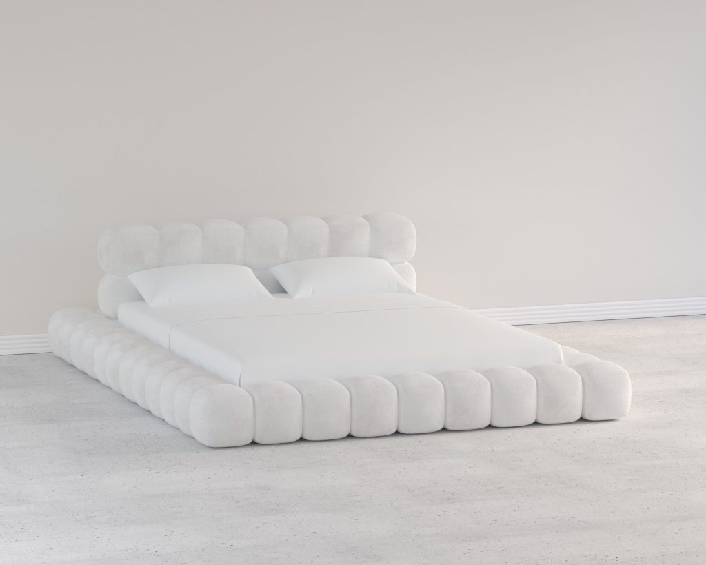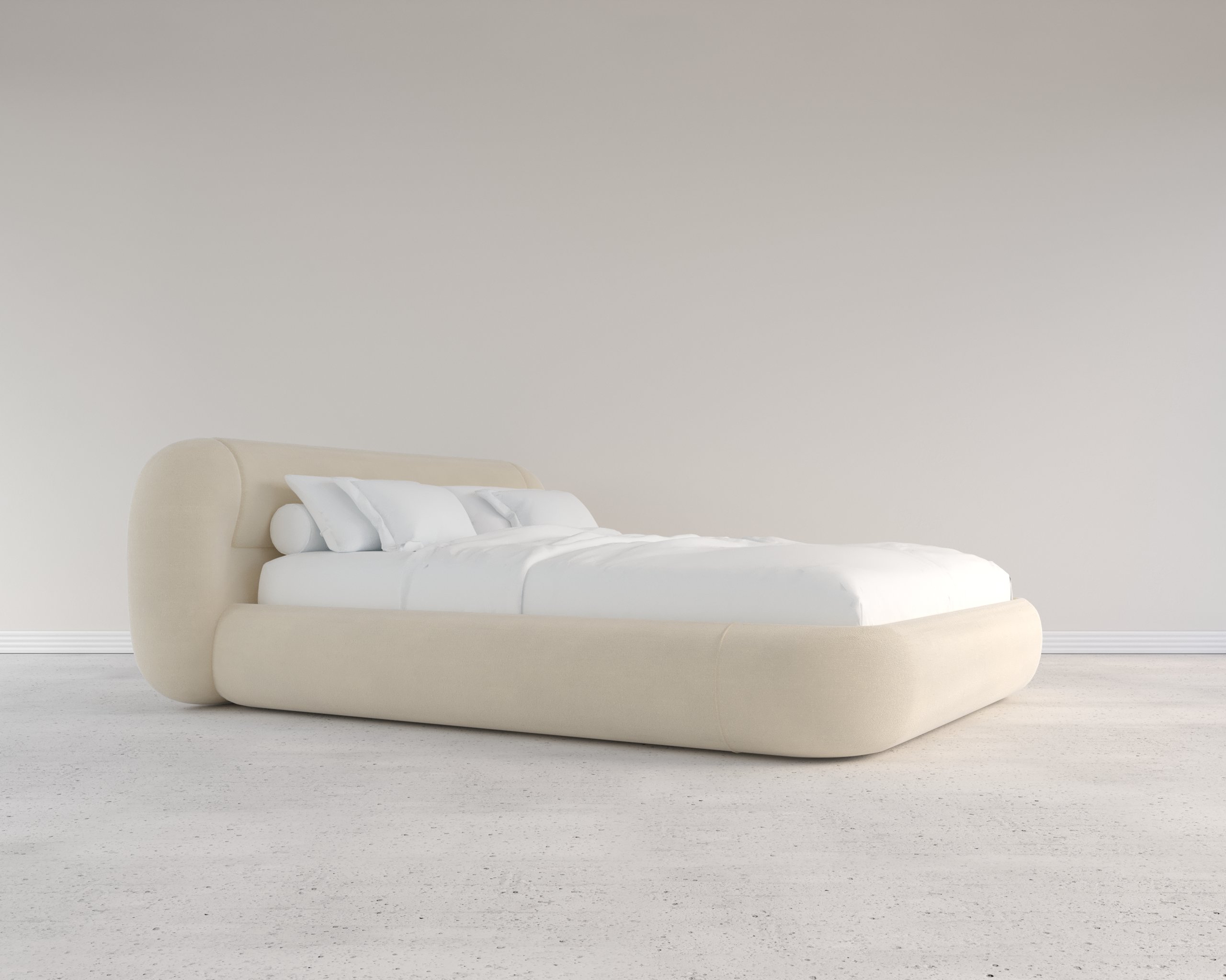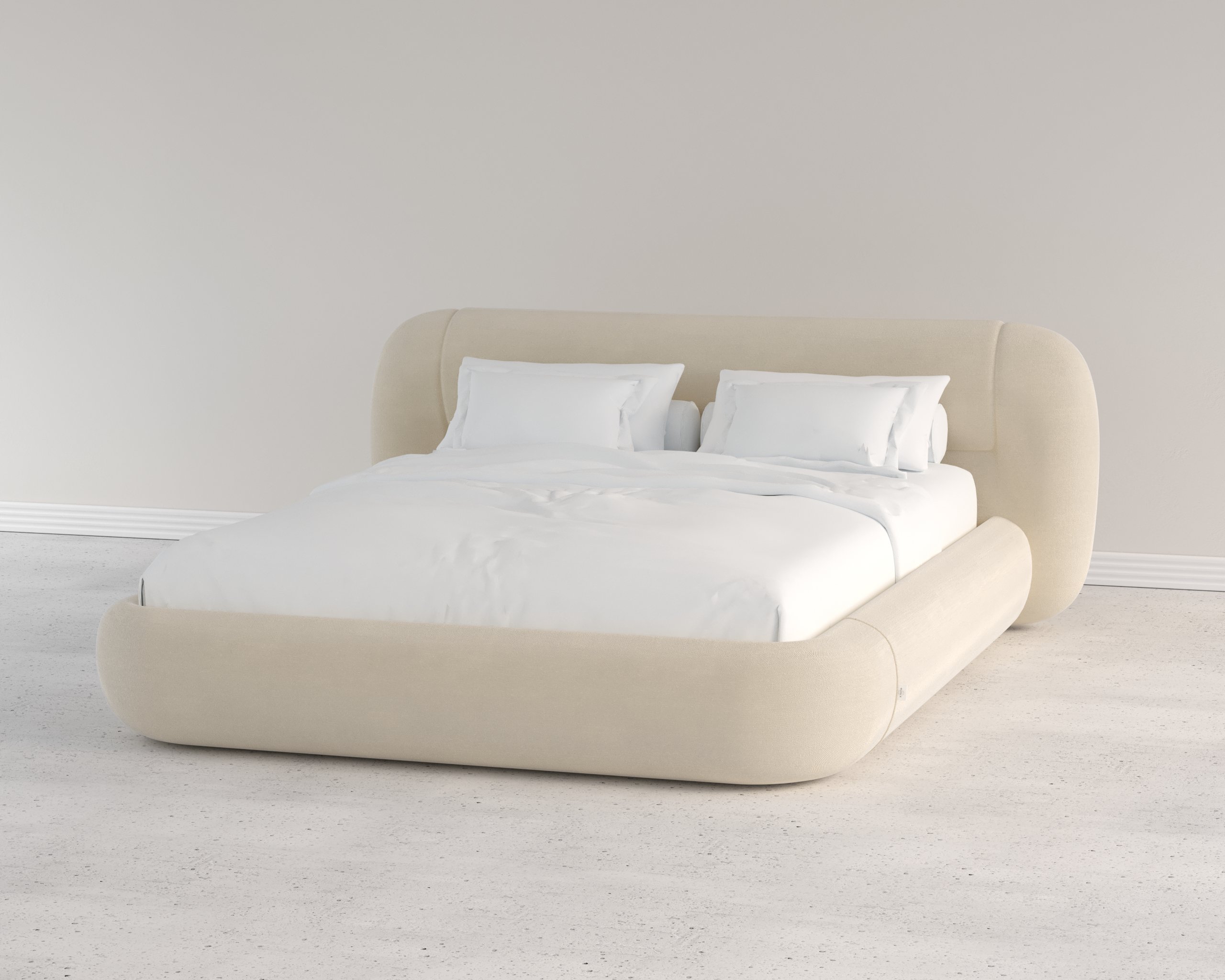 A modern minimalist bed featuring smooth, rounded edges and a low-profile design. Its seamless, upholstered frame and soft, sculptural form create a clean yet inviting aesthetic that blends contemporary elegance with comfort.