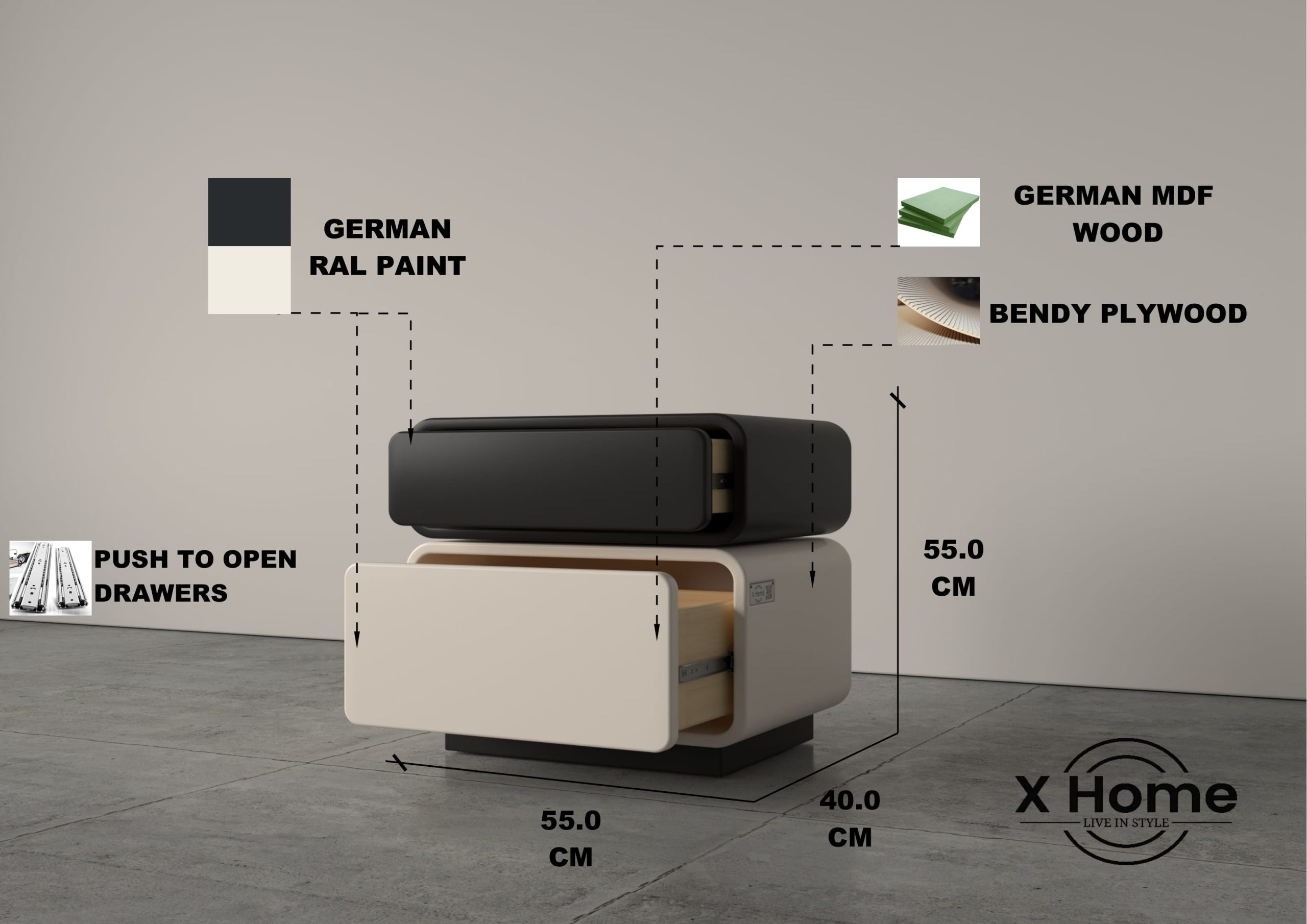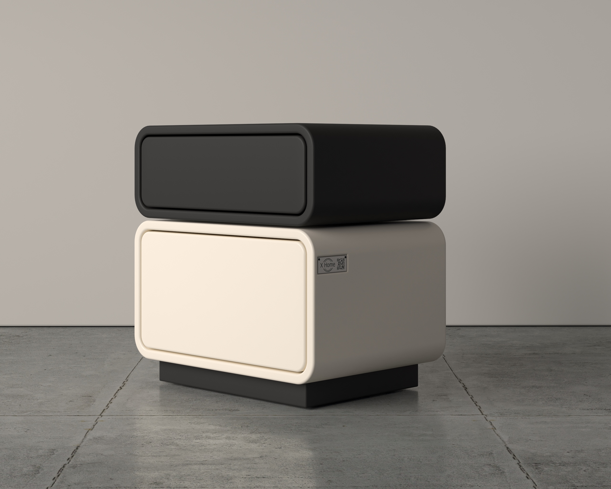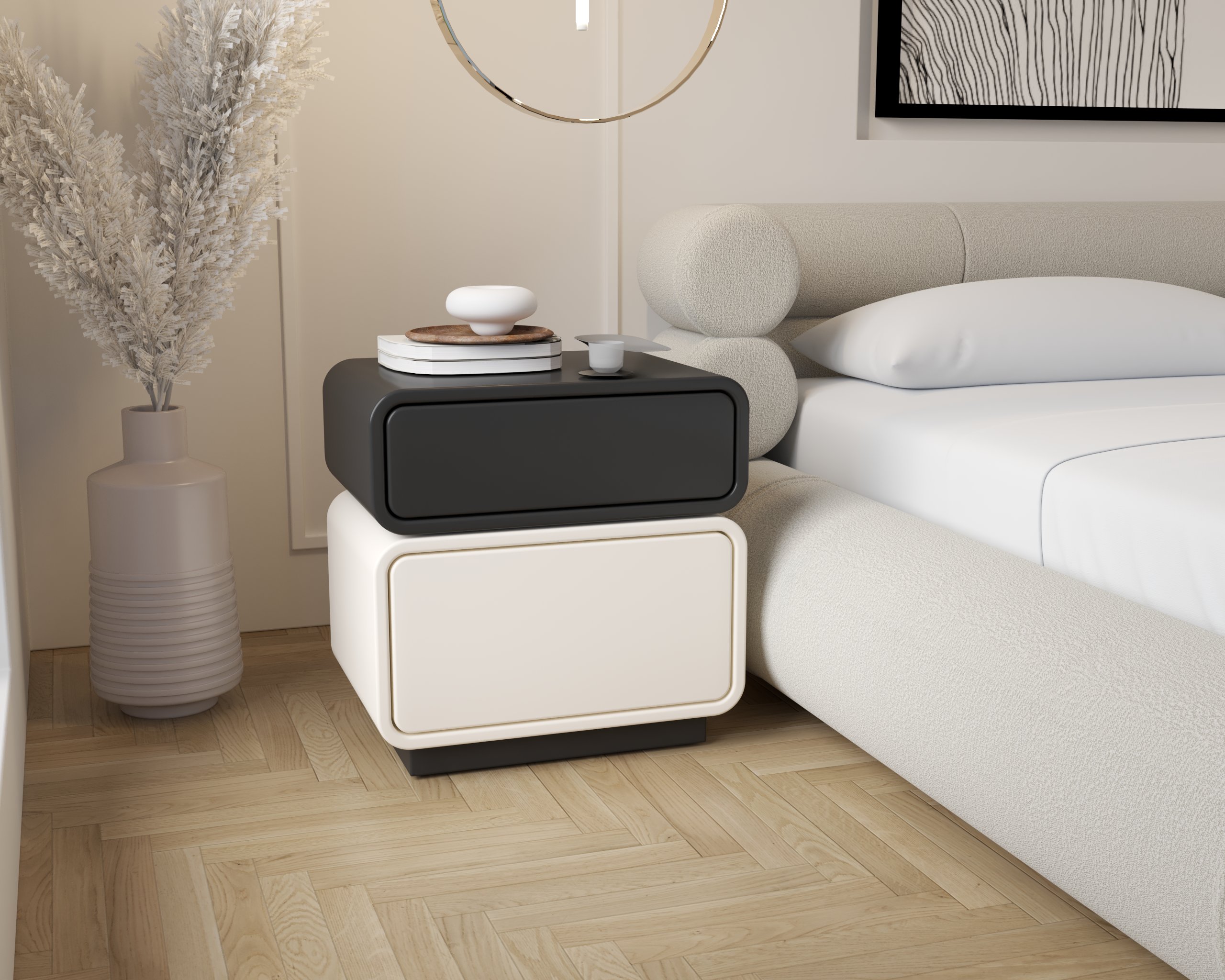 Modern minimalist design with smooth, rounded edges and a sleek, seamless form Stacked dual-compartment layout offering practical storage and a balanced look Push-to-open drawers for effortless access and a clean, handle-free appearance High-quality painted finish for a refined, elegant surface Versatile functionality, suitable as a bedside table or compact storage piece Contemporary aesthetic that complements a wide range of interior styles