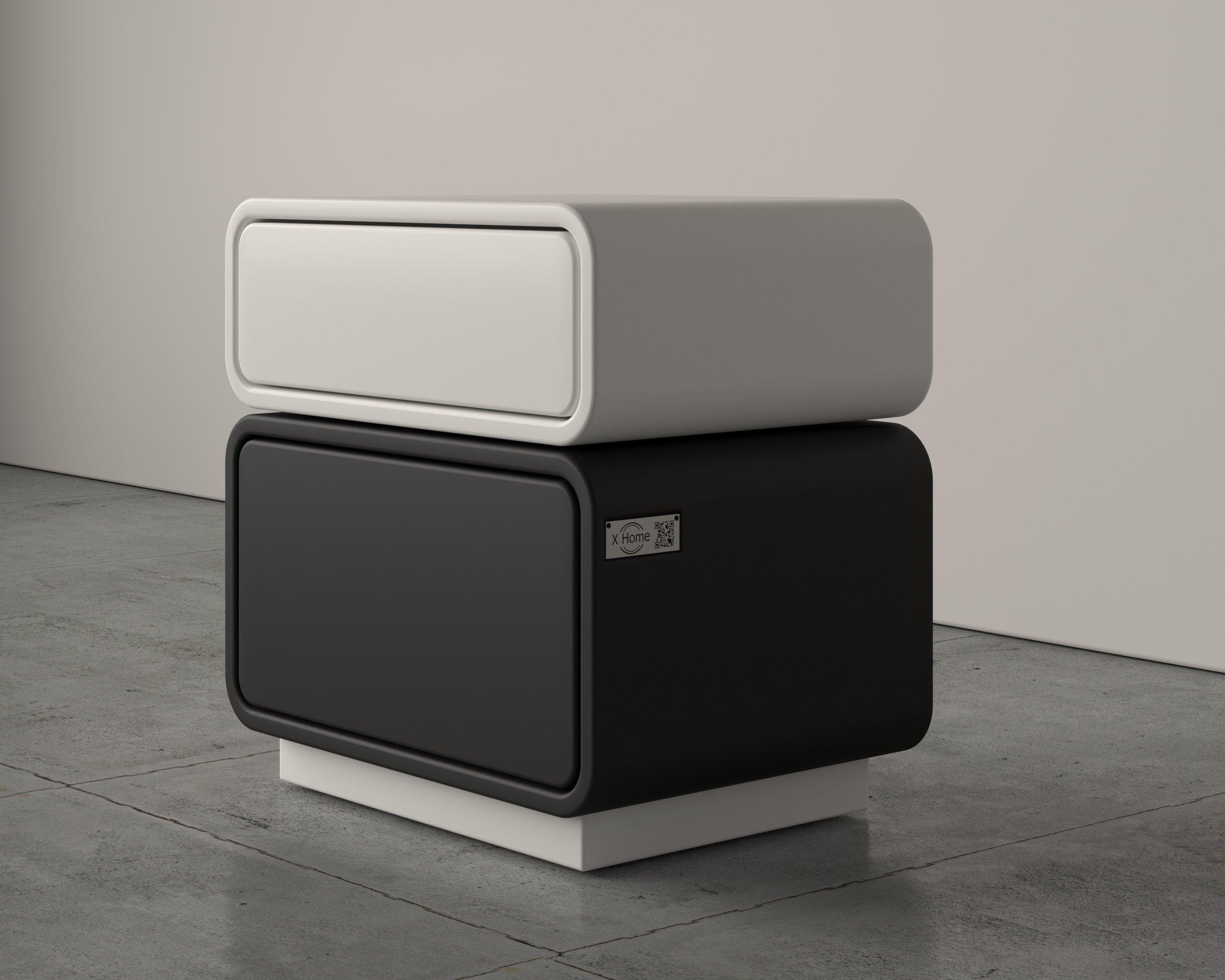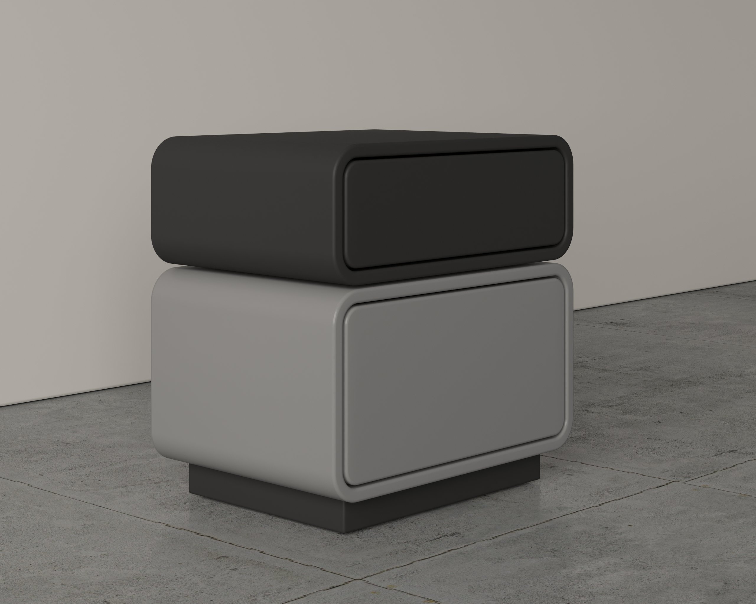 This modern bedside table features a sleek, minimalist design with smooth rounded edges and a stacked dual-compartment structure. Its clean form offers both style and practicality, making it a perfect addition to contemporary bedrooms or living spaces.