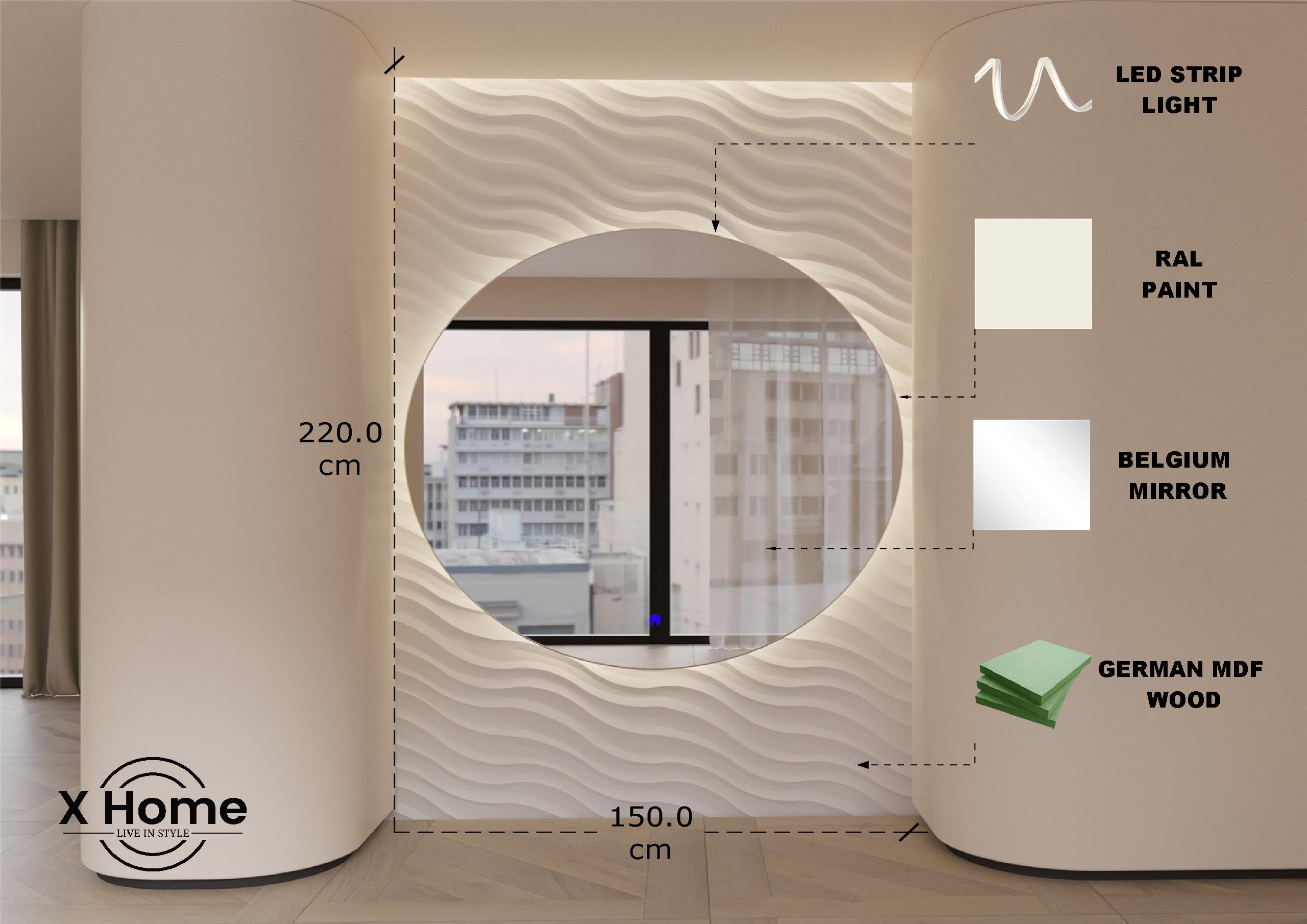 - Mirror Shape: Circular inset within wave sculpted panel