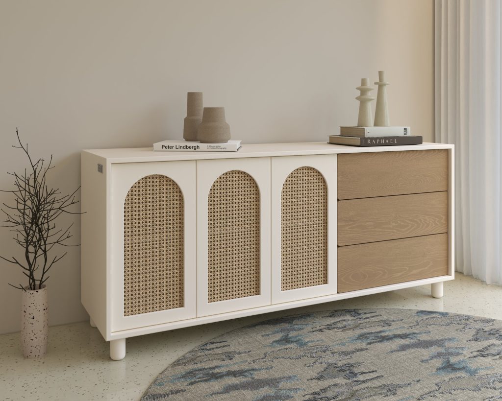 The Olyra Dresser features a sculptural, rhythmic form with curved panel detailing, designed to bring artistic expression and functional storage together.