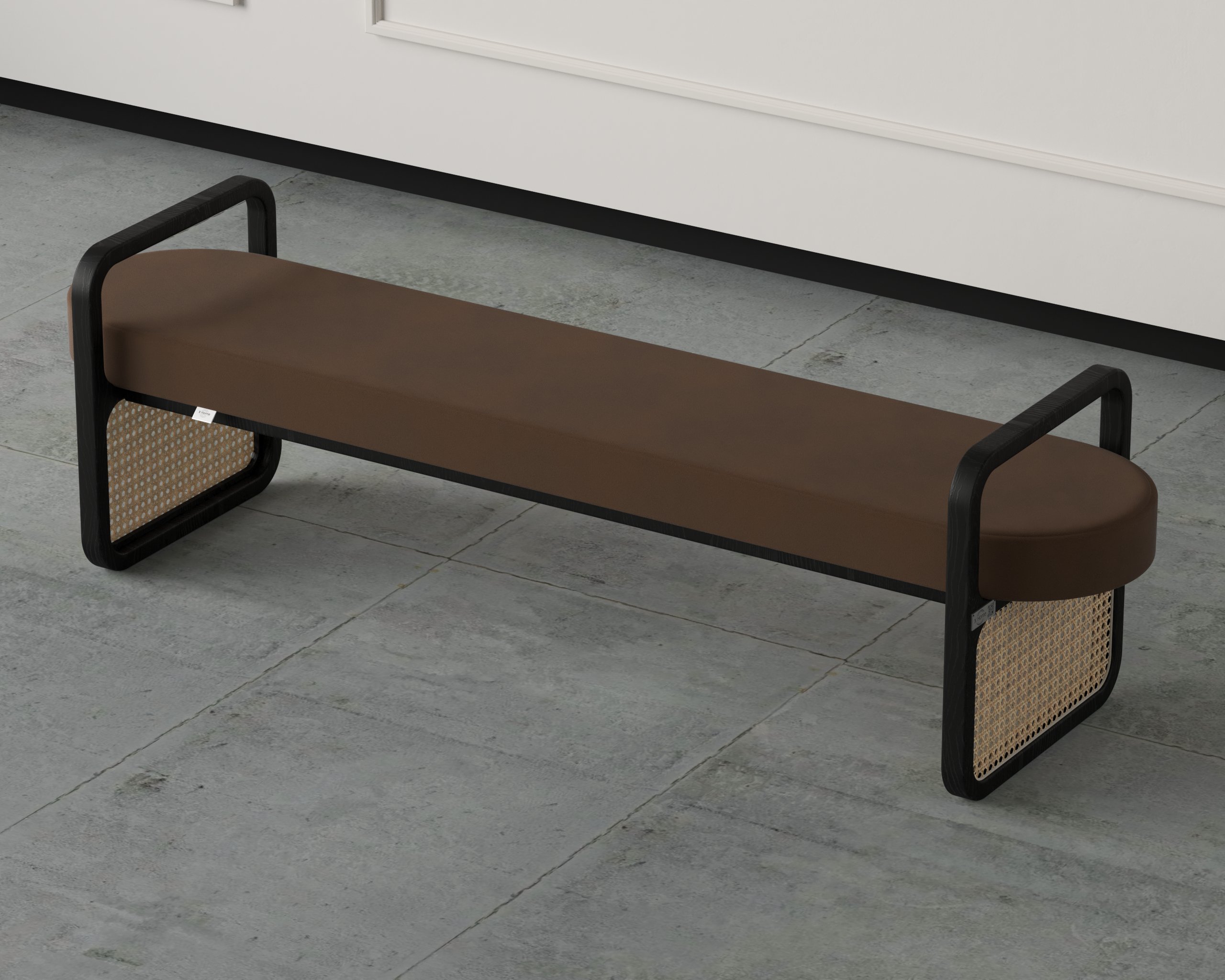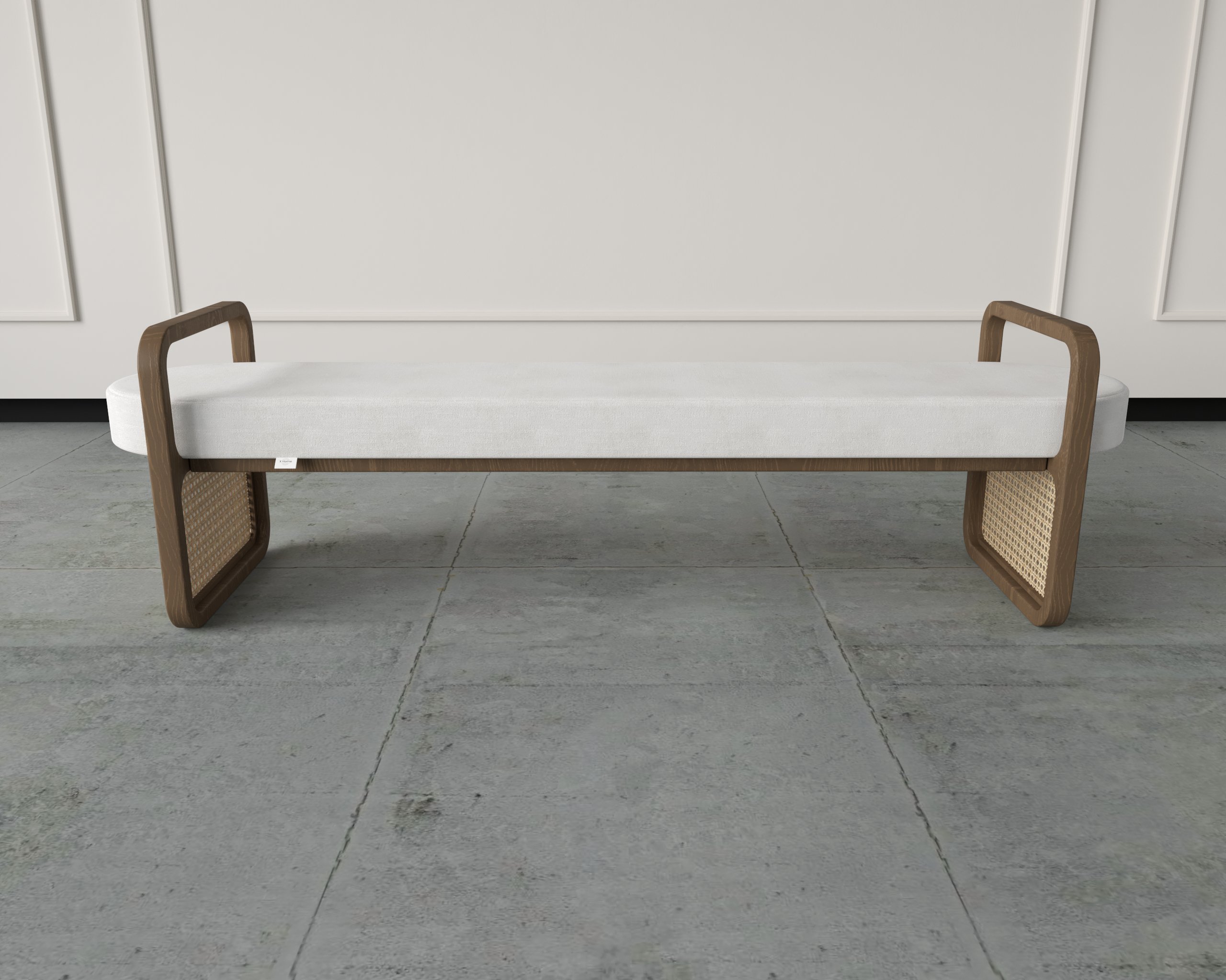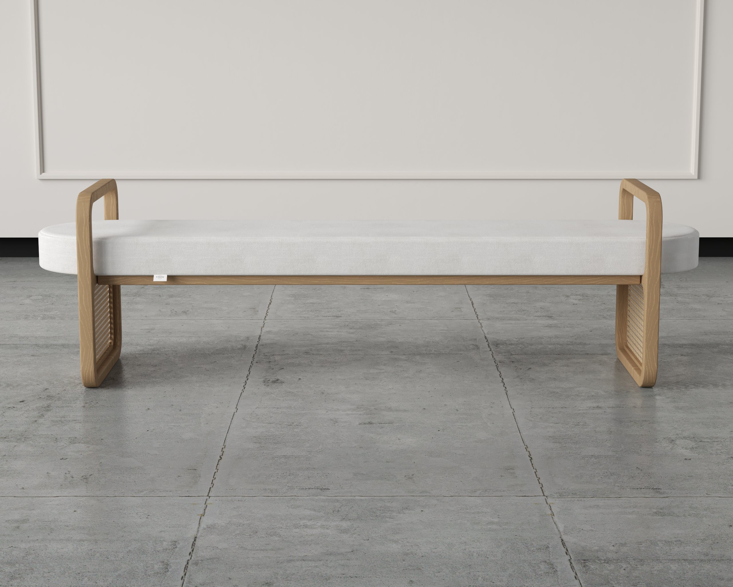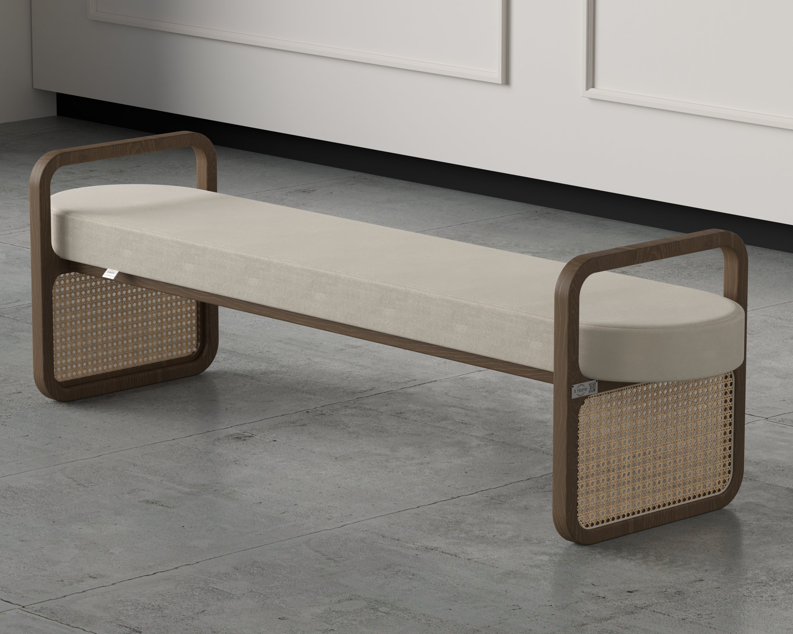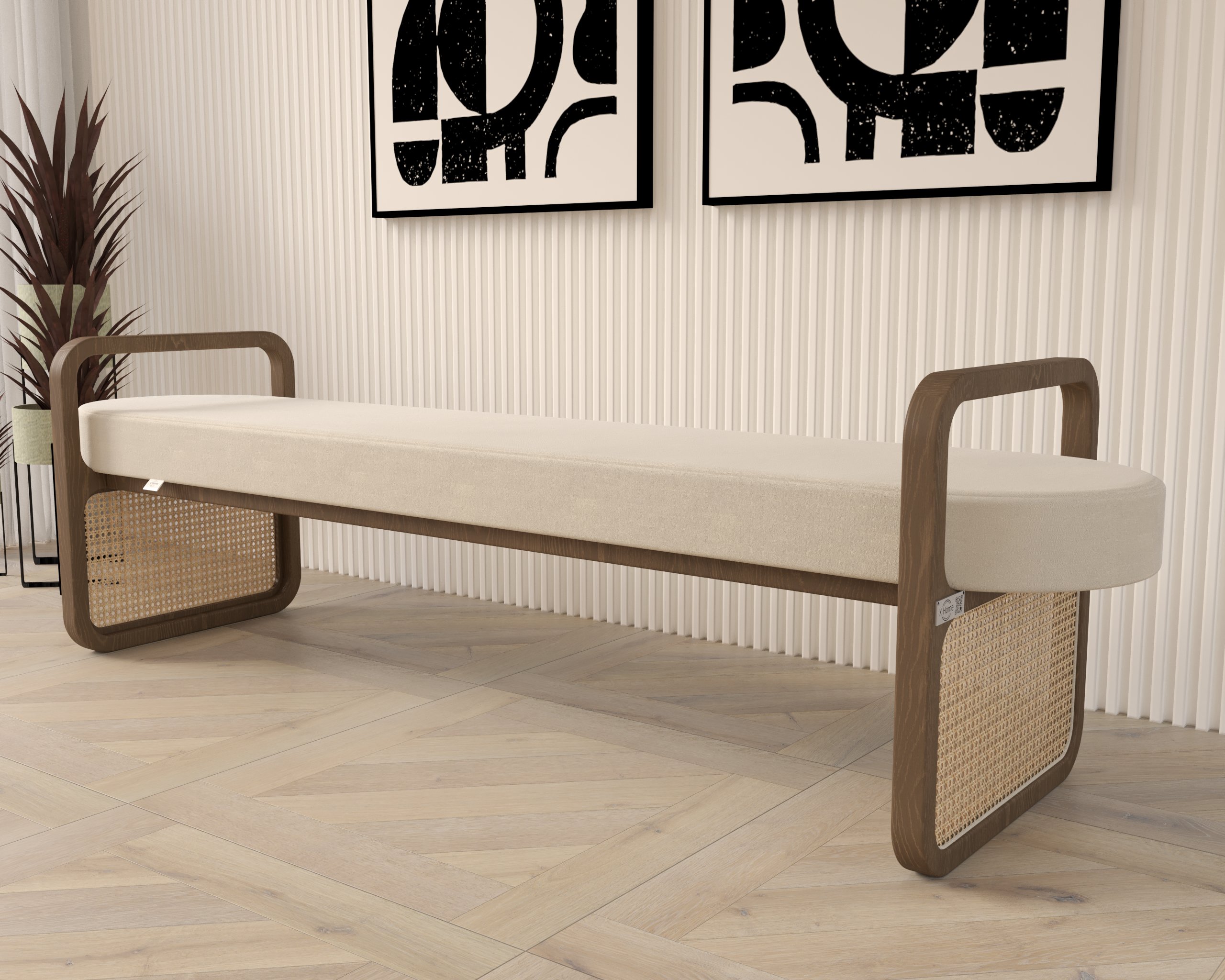 A refined bench combining a soft upholstered seat with elegant rattan-accented wooden frames. Perfect for adding natural warmth and modern sophistication to any space.