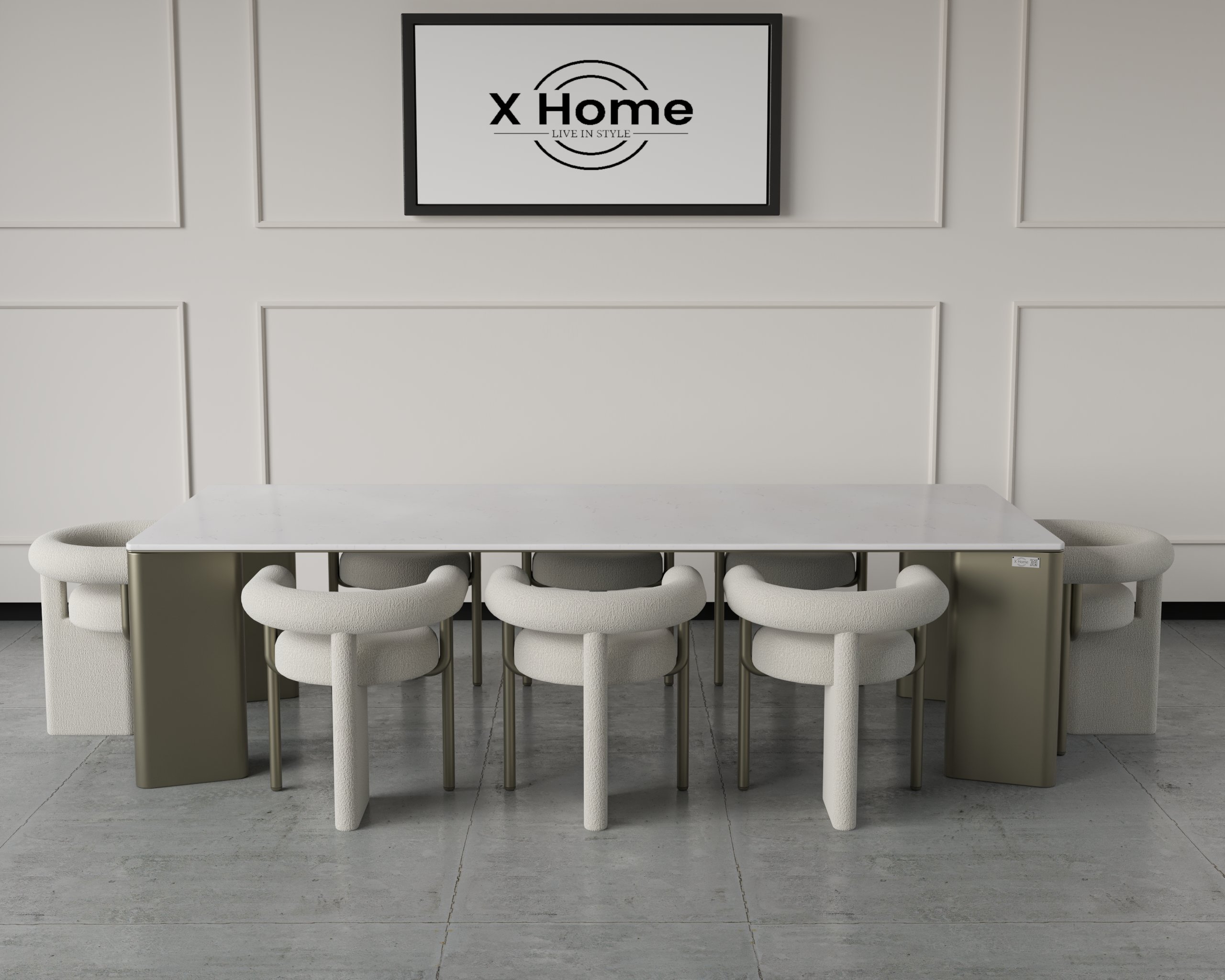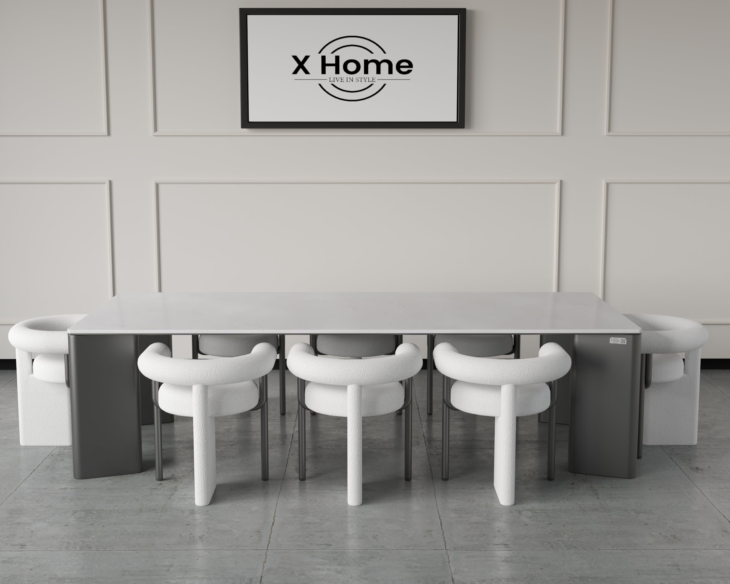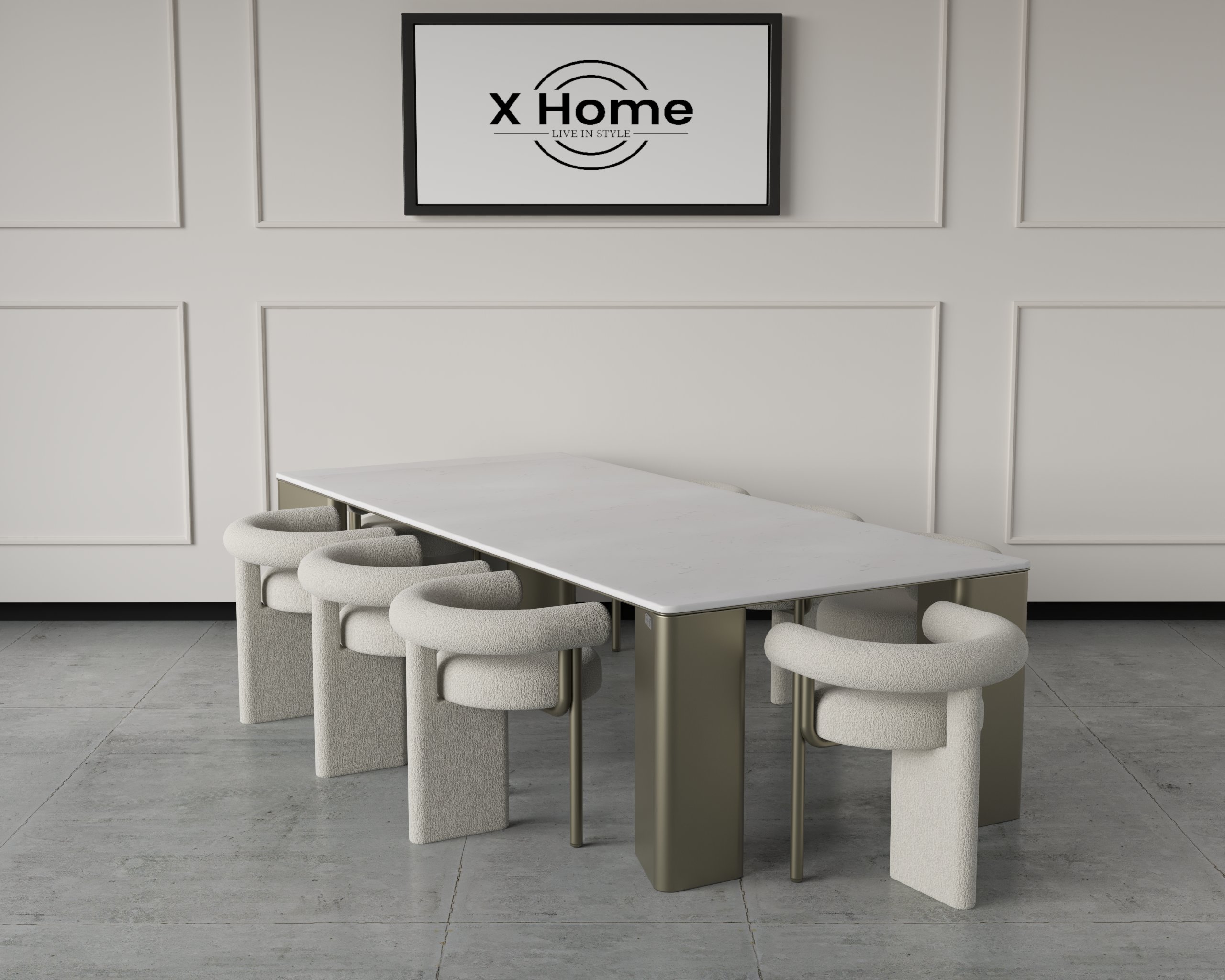 The Rayan Dining Set blends a polished marble tabletop with bold, architectural legs and curved boucle-upholstered chairs. Designed with both comfort and sophistication in mind, it brings a statement-making presence to modern interiors. Perfect for homes seeking elegance with a sculptural edge.