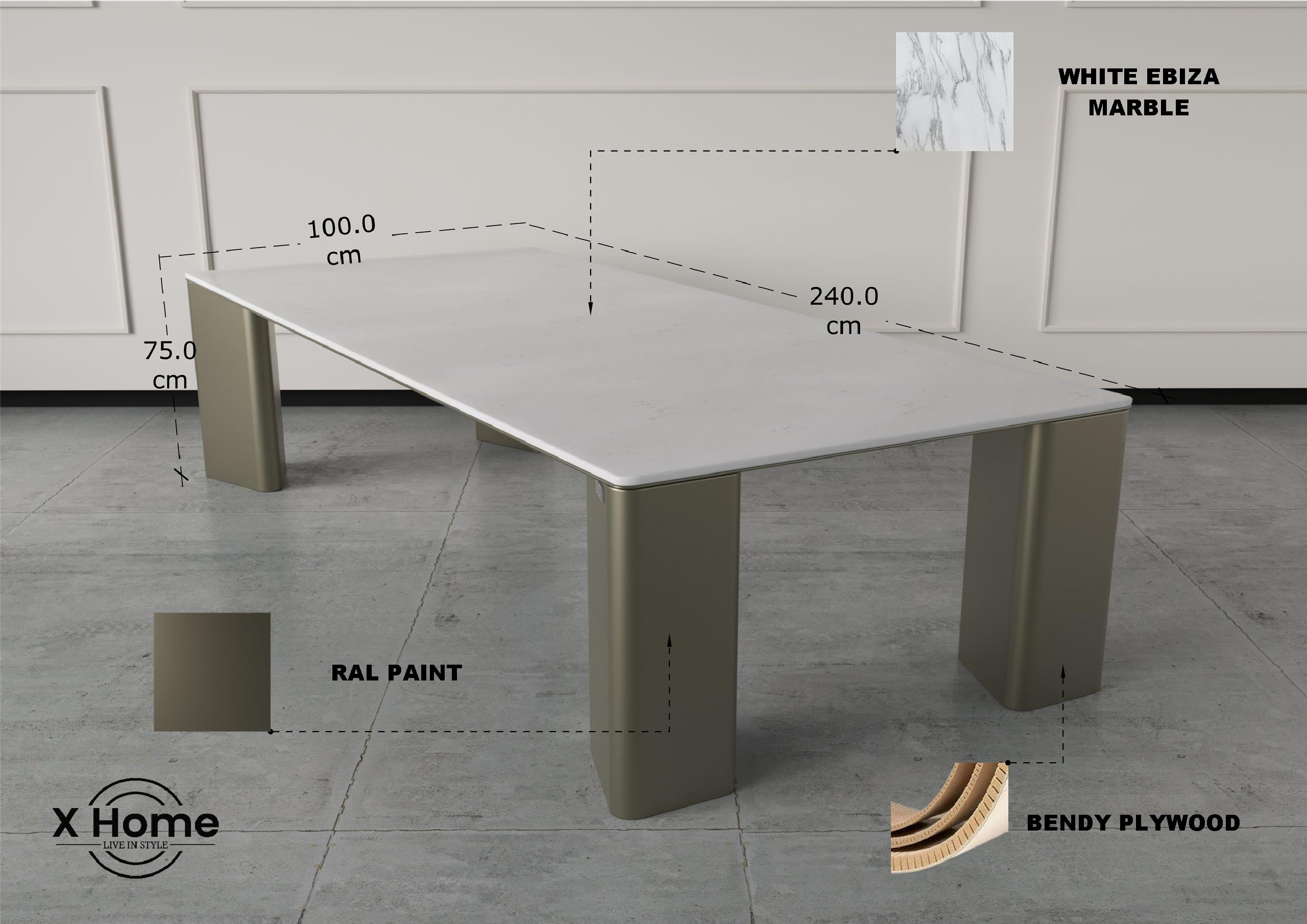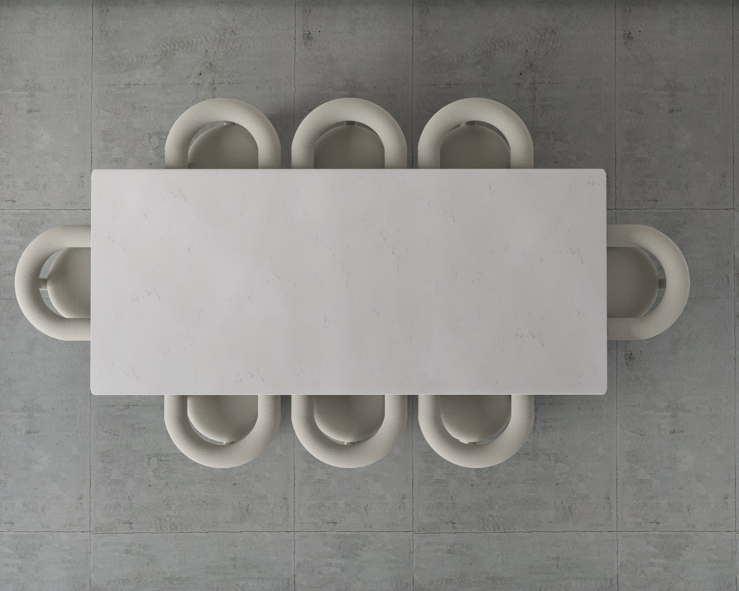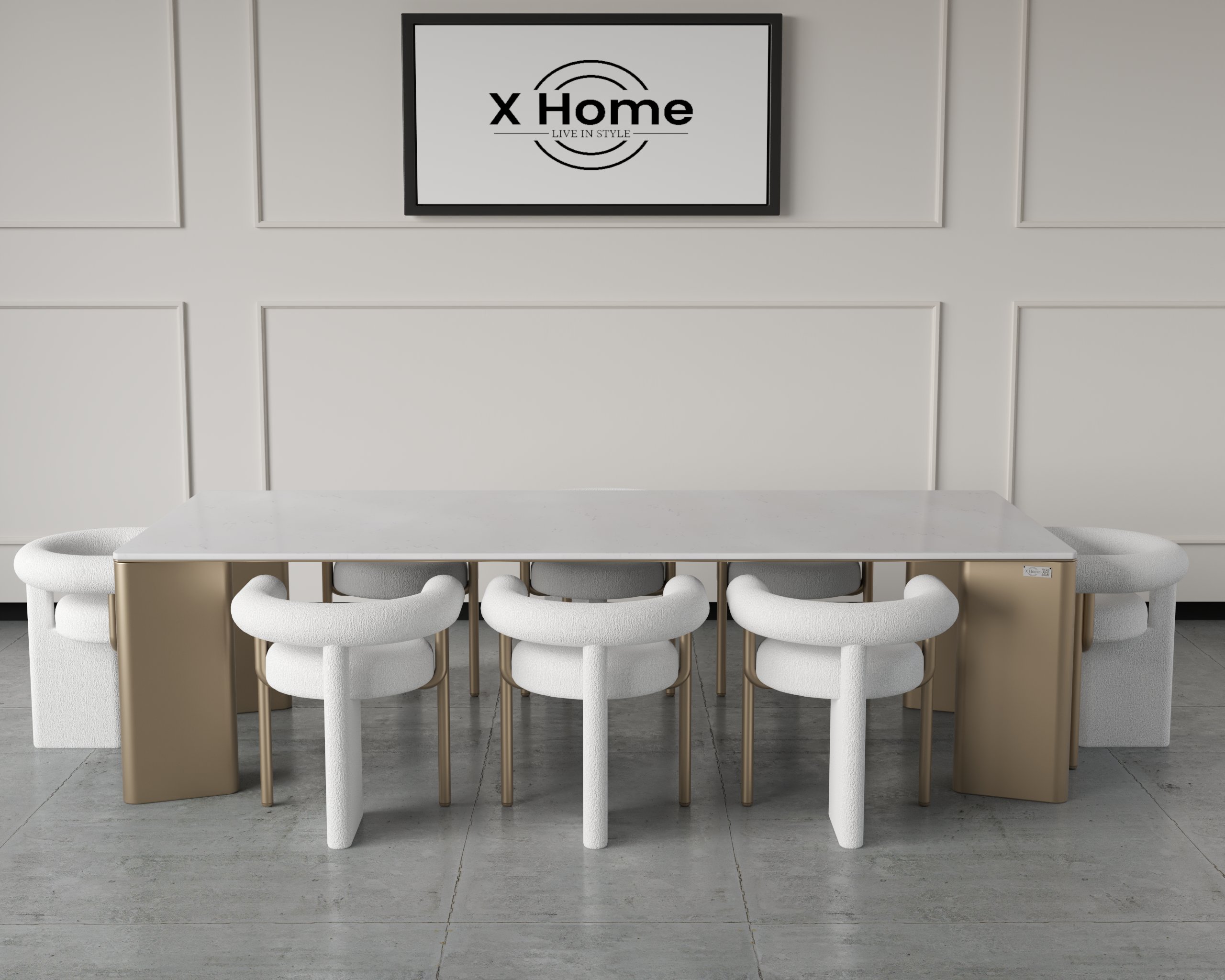 The Rayan Dining Set blends a polished marble tabletop with bold, architectural legs and curved boucle-upholstered chairs. Designed with both comfort and sophistication in mind, it brings a statement-making presence to modern interiors. Perfect for homes seeking elegance with a sculptural edge.
