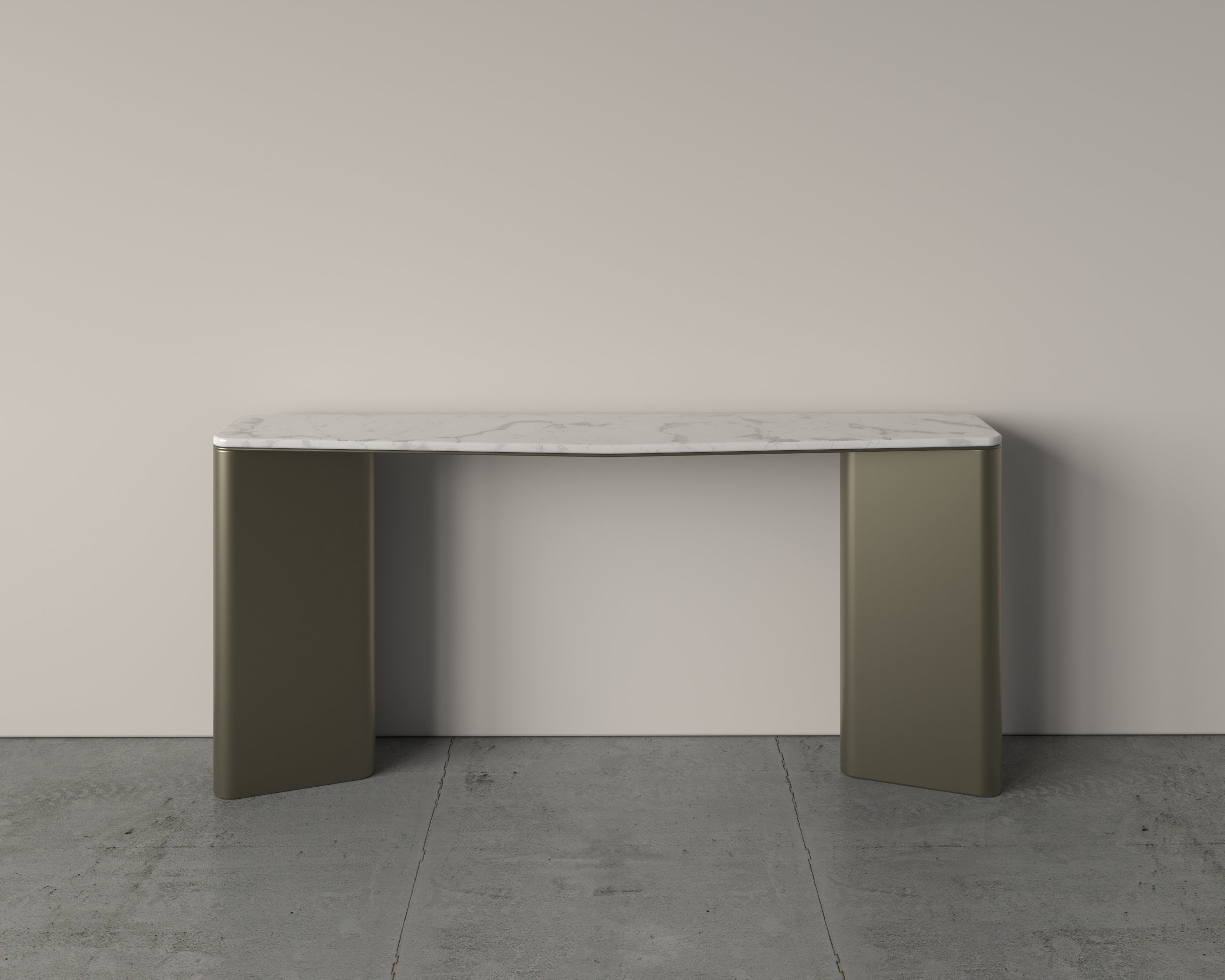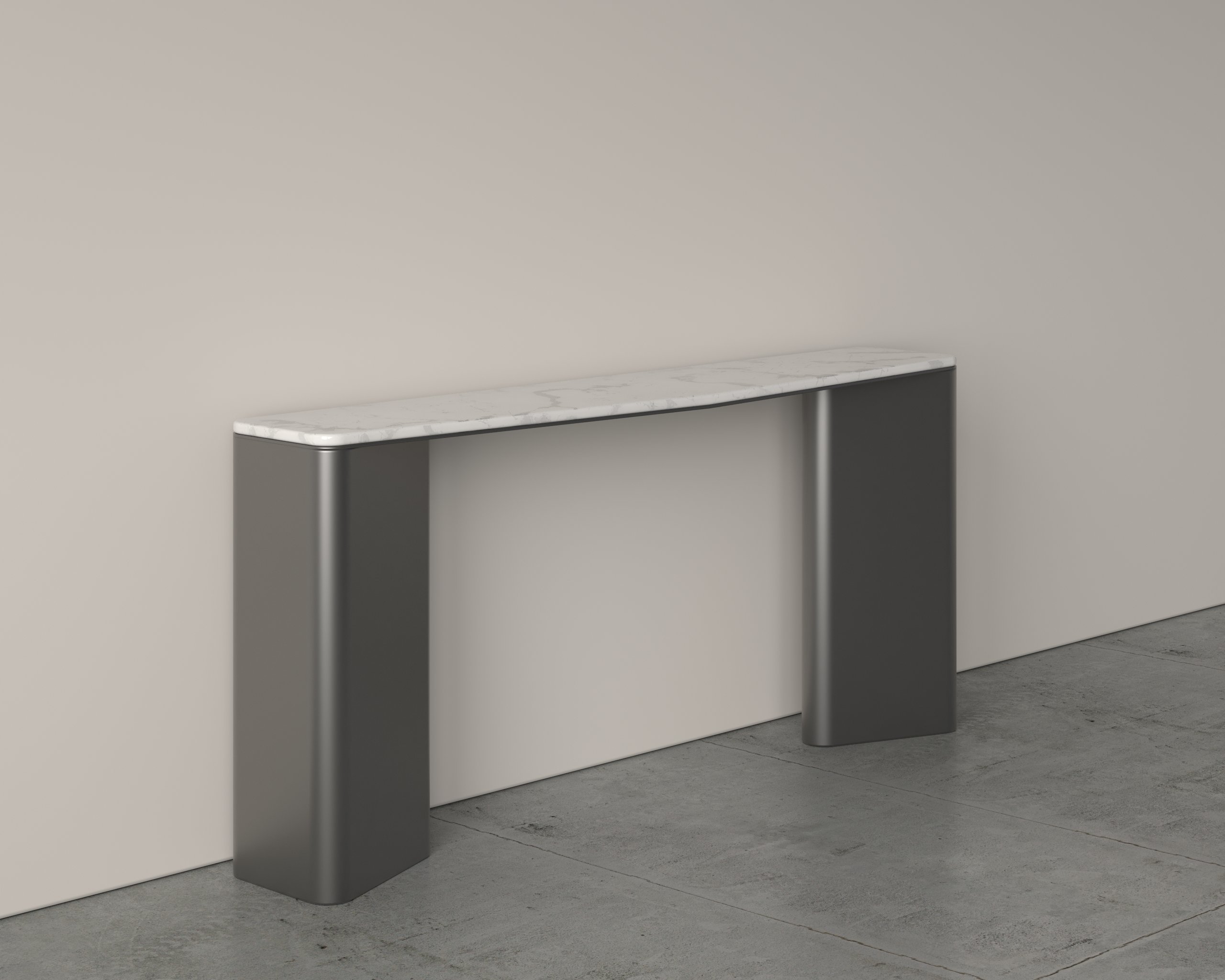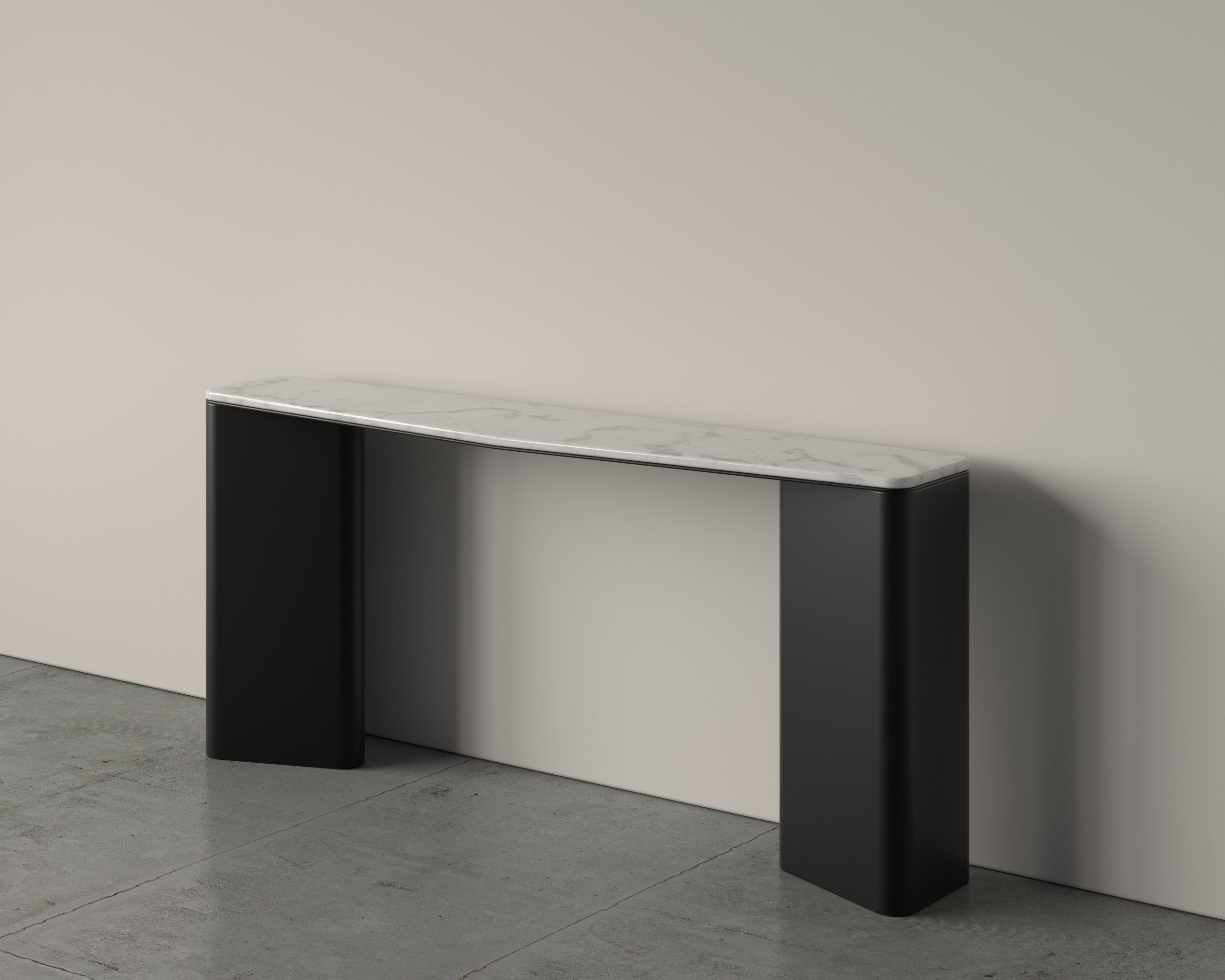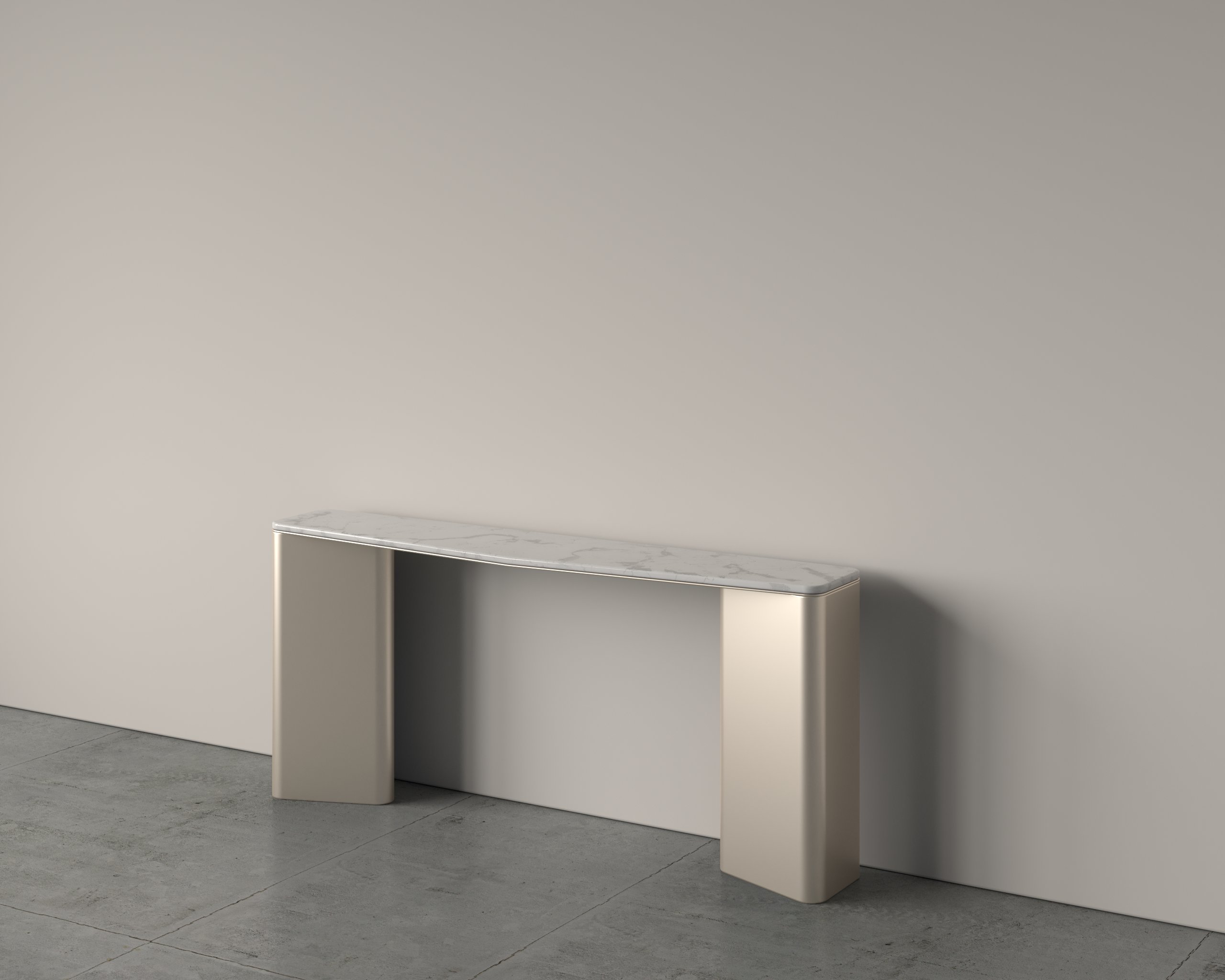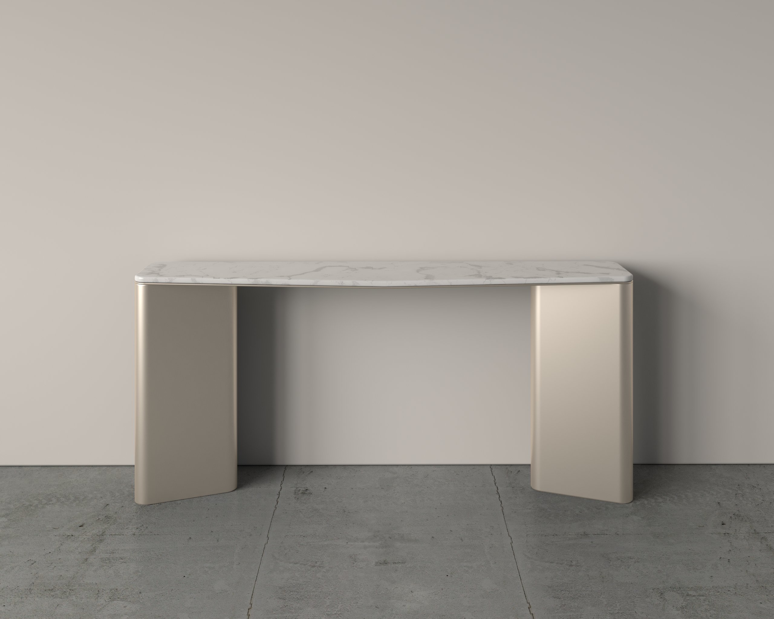 A sleek, minimalist console table featuring a smooth marble top and elegantly rounded legs, perfect for adding a touch of modern sophistication to any space