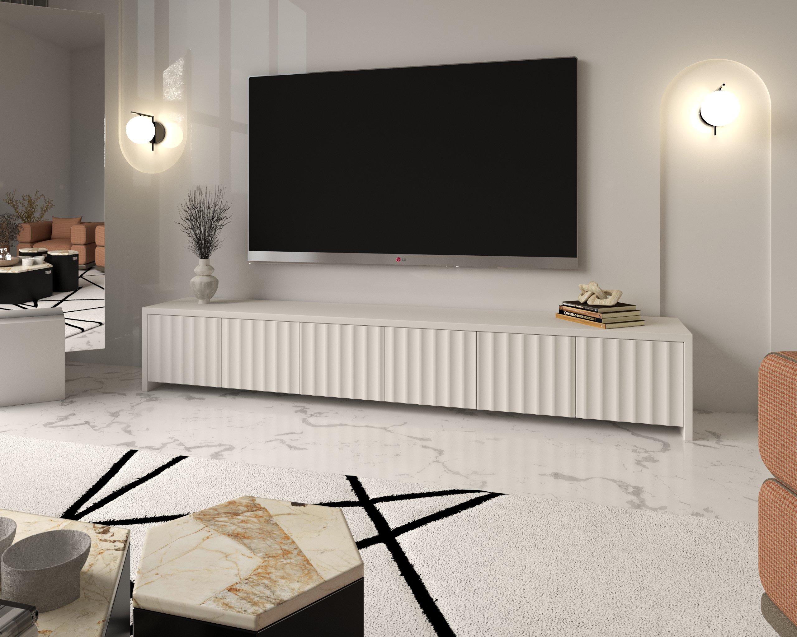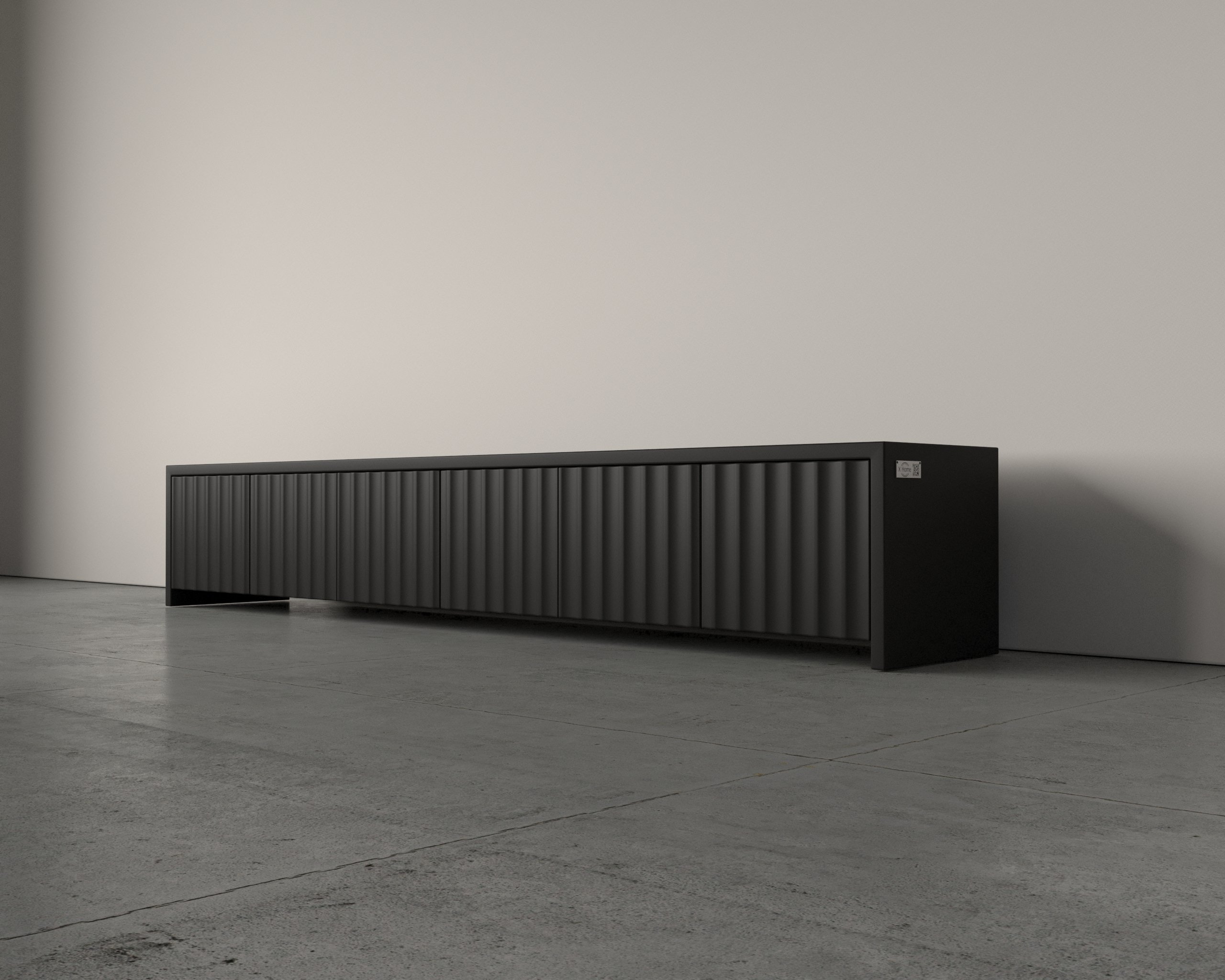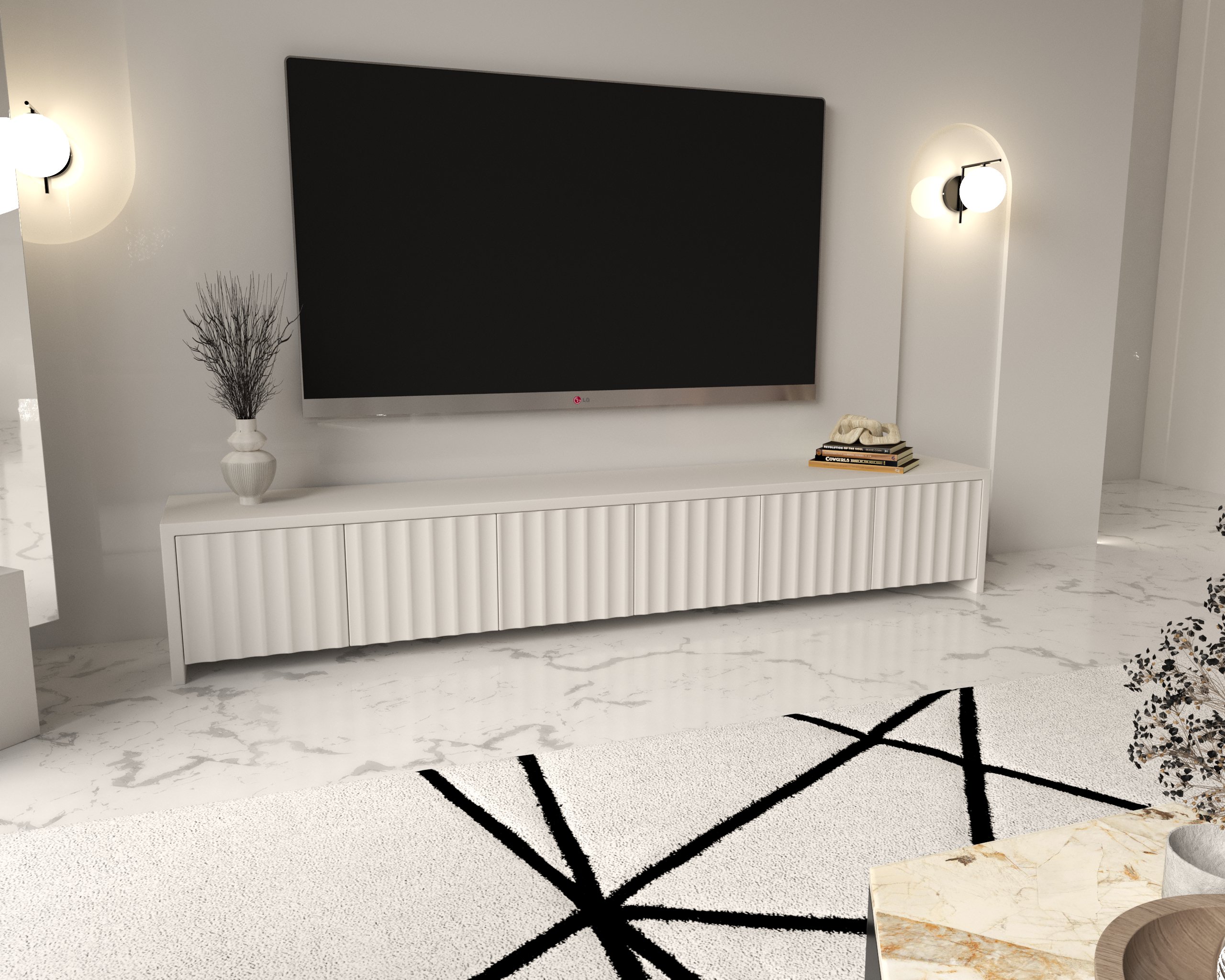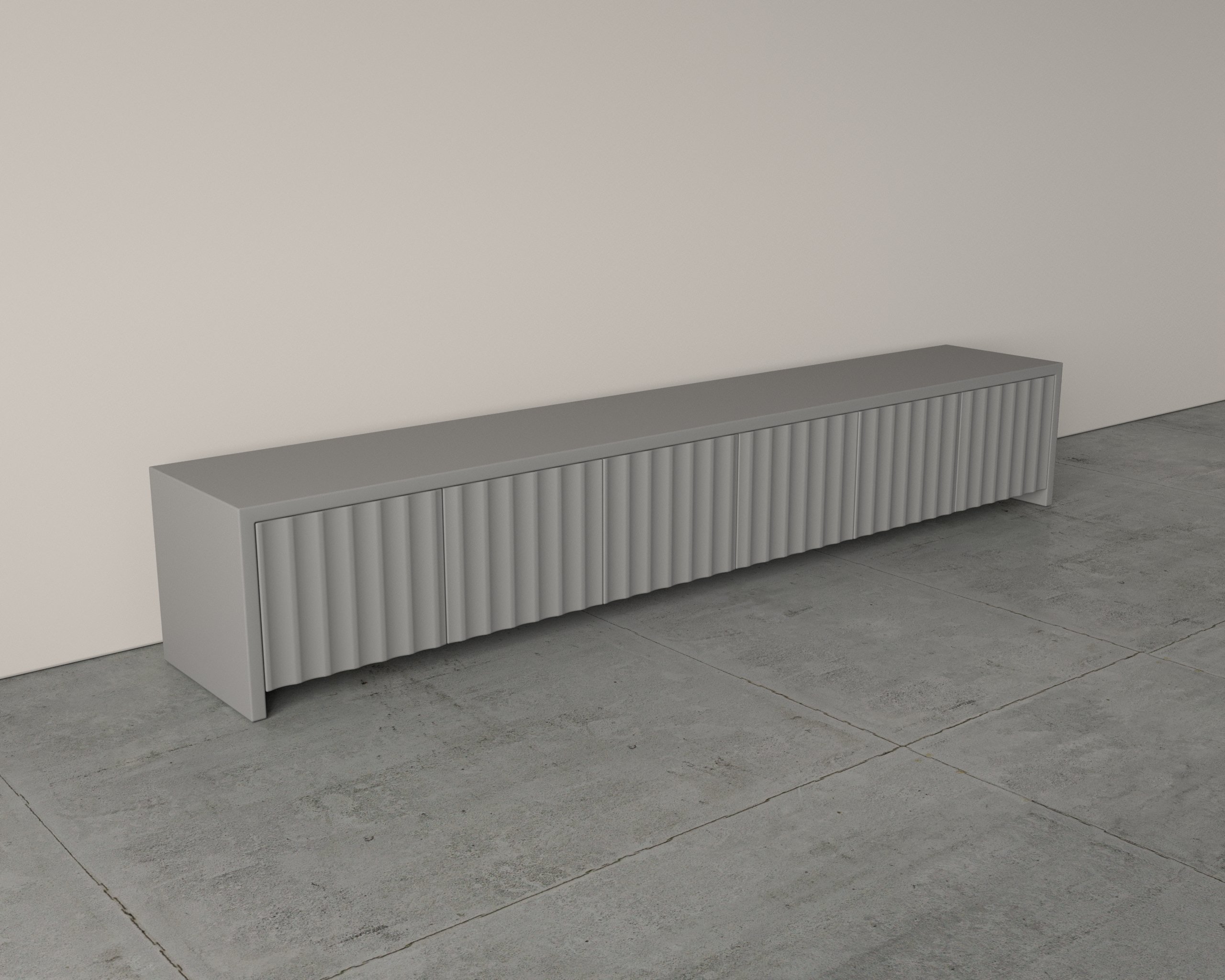 The Ribbloc TV Unit features bold vertical ribbing and a seamless modern silhouette, offering a striking architectural presence. Designed for stylish storage with refined simplicity.
